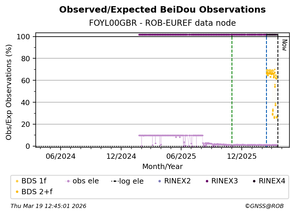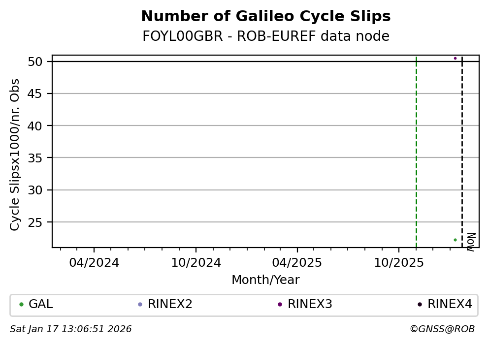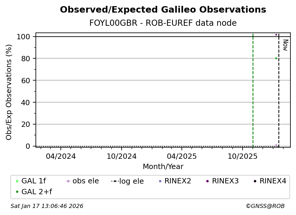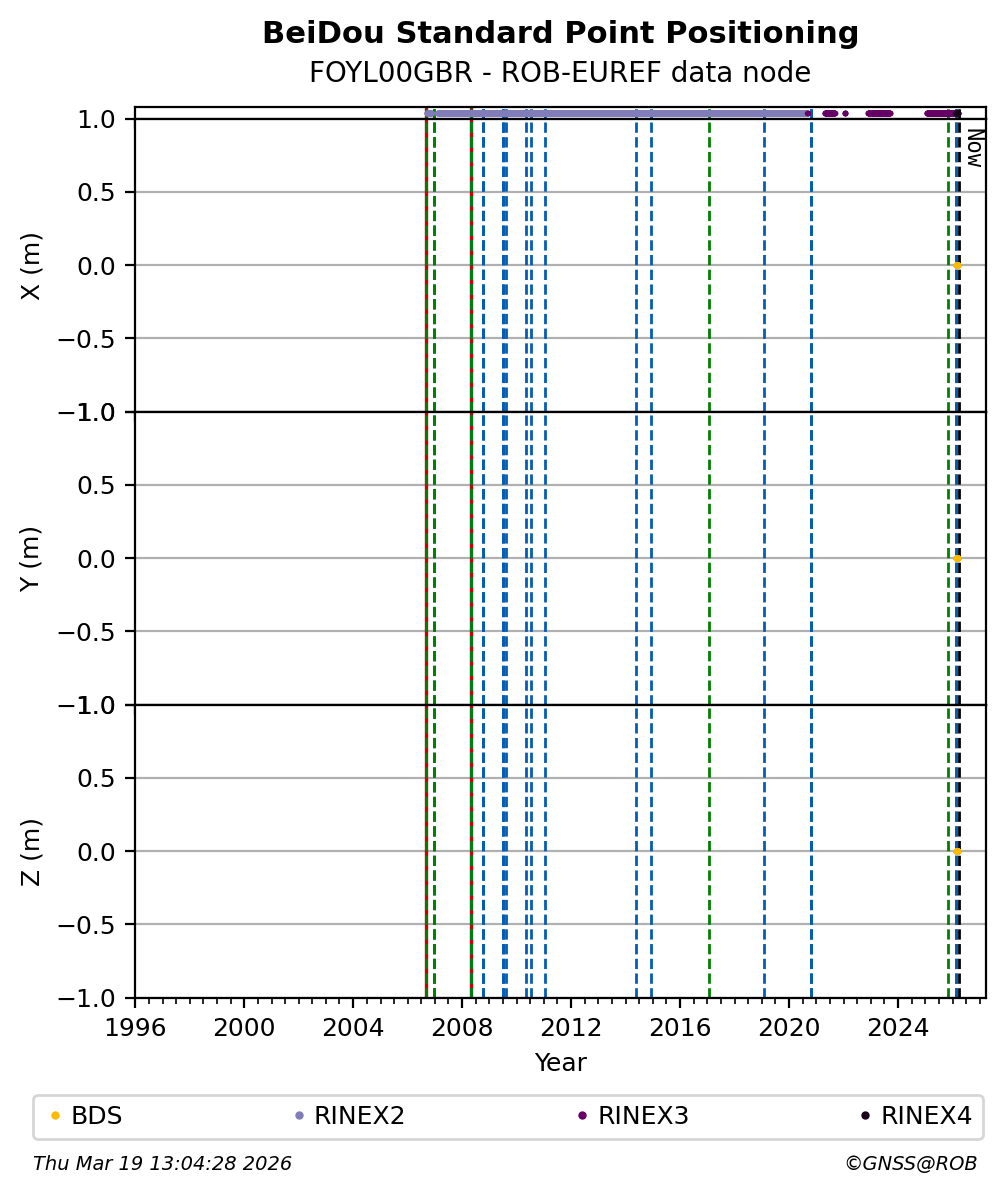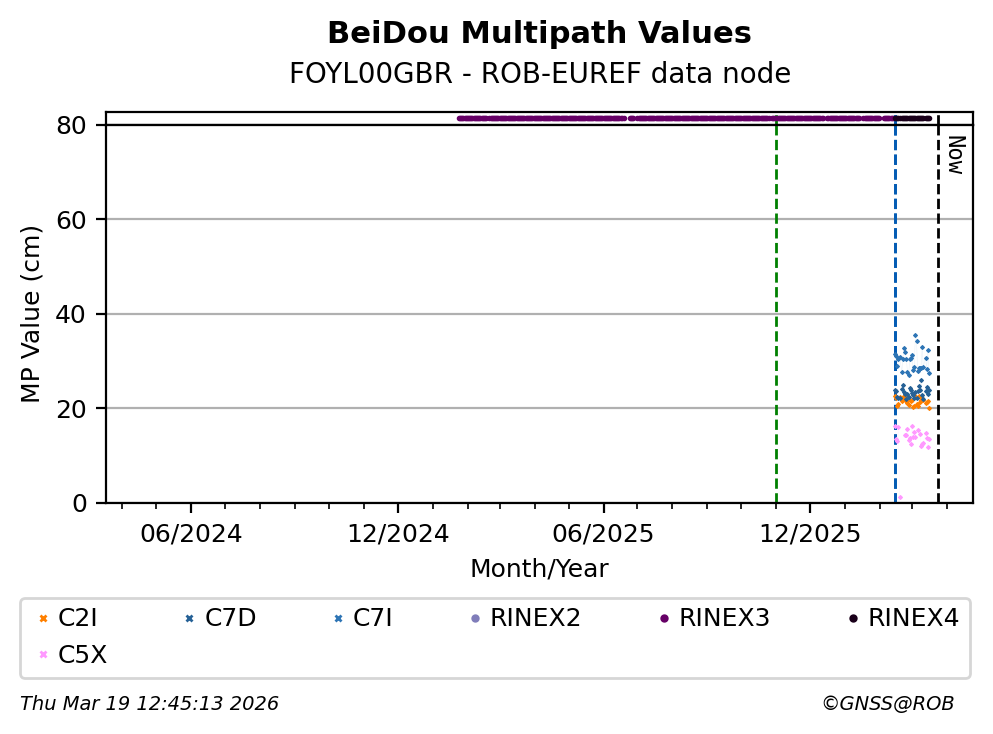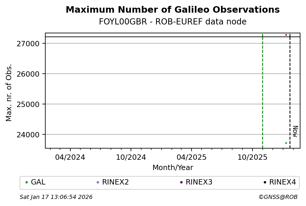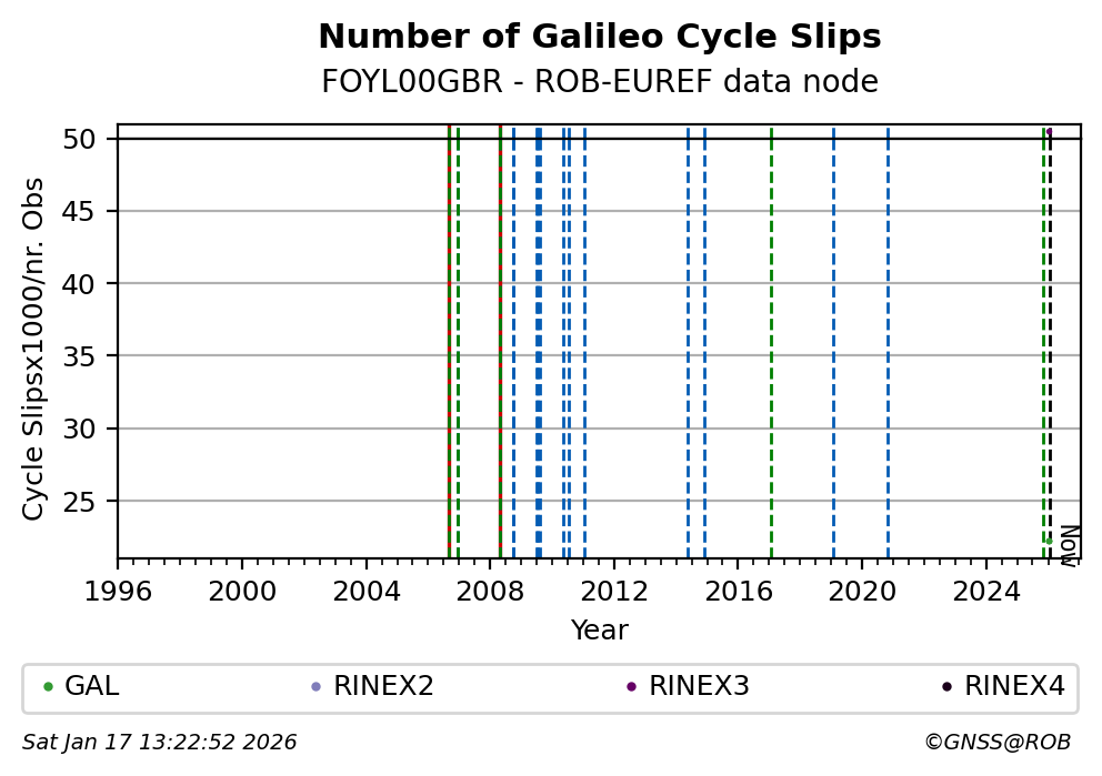 The plots below present the long-term tracking performance of the EPOS-GNSS station FOYL00GBR based on the daily RINEX data available from the ROB-EUREF EPOS-GNSS data node. The data quality metrics have been computed at the data node using the G-Nut/Anubis software.
