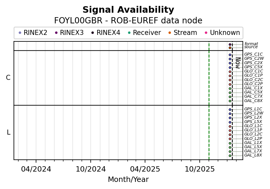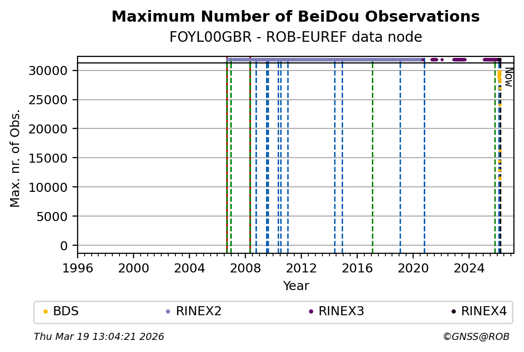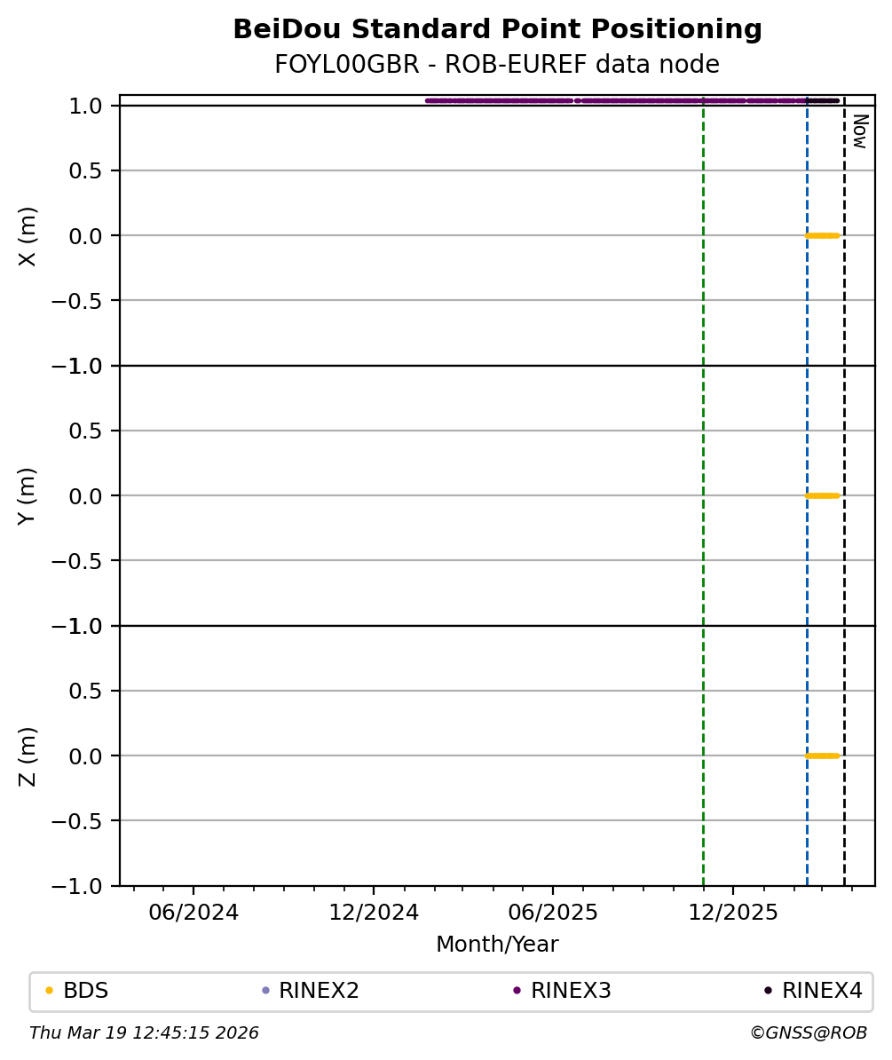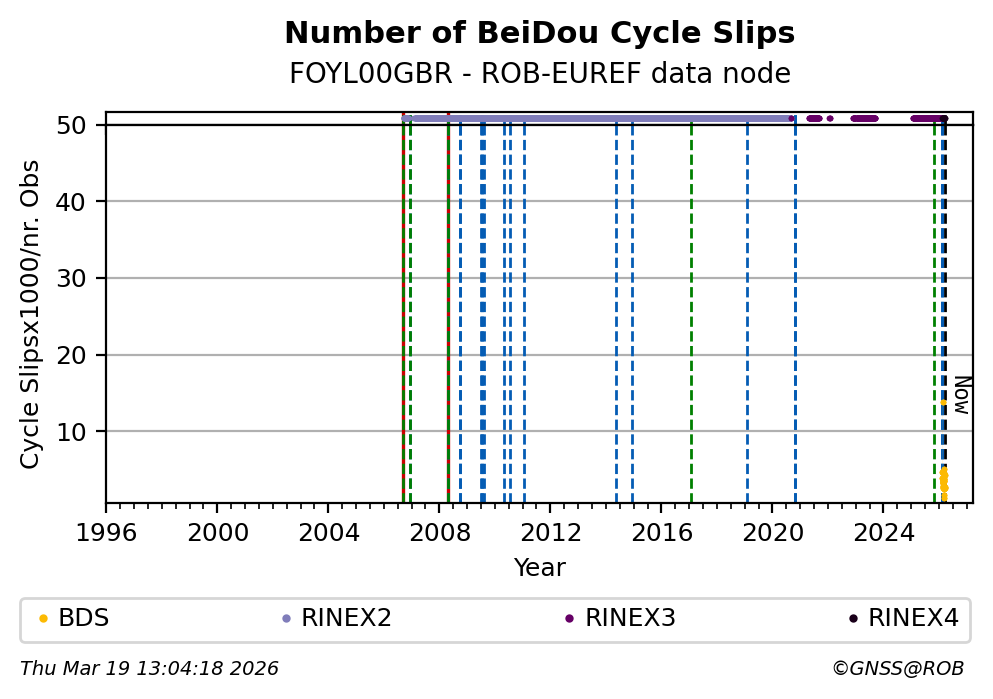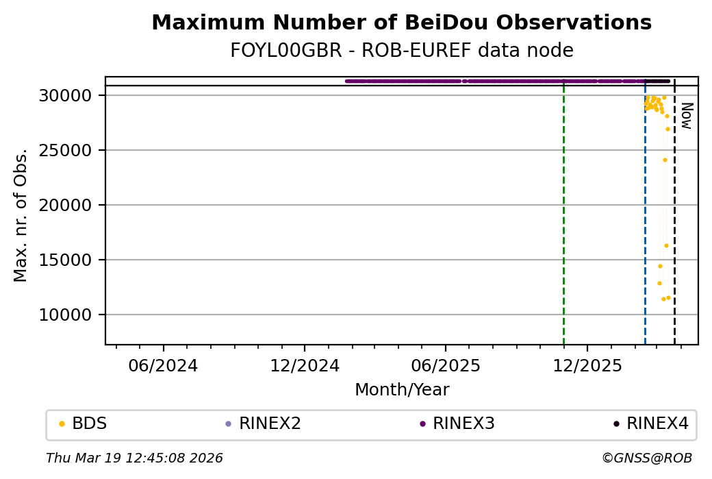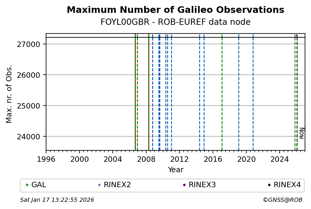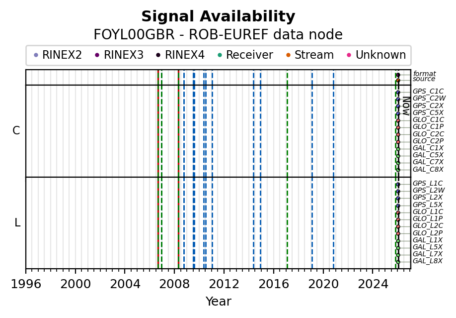 The plots below present the long-term tracking performance of the EPOS-GNSS station FOYL00GBR based on the daily RINEX data available from the ROB-EUREF EPOS-GNSS data node. The data quality metrics have been computed at the data node using the G-Nut/Anubis software.