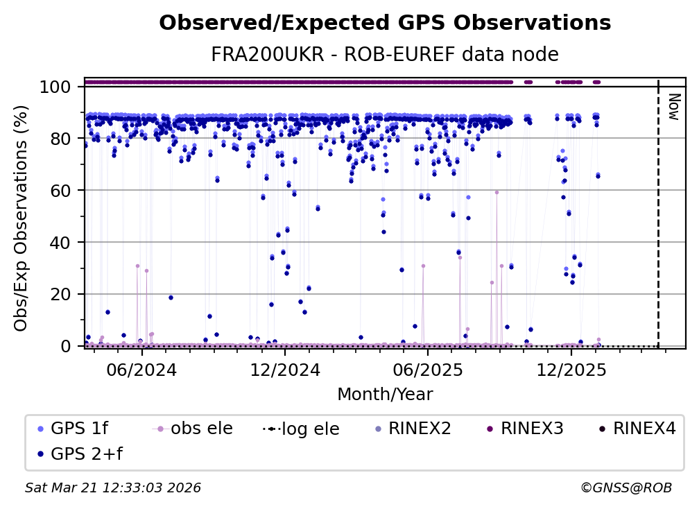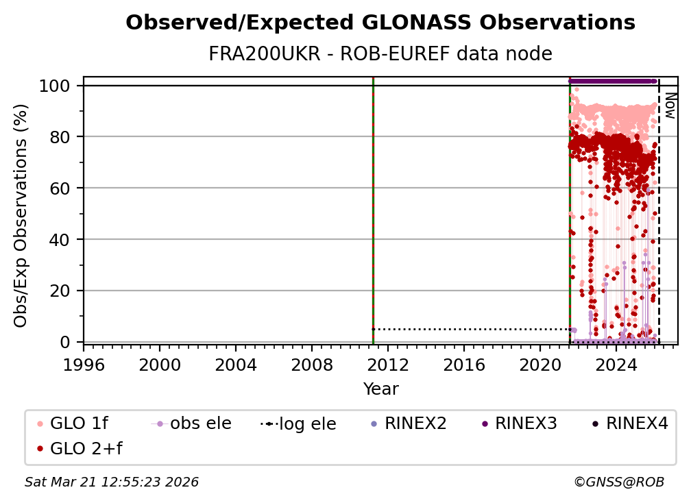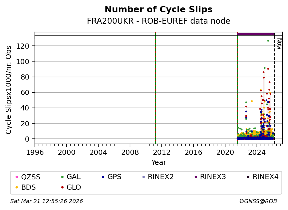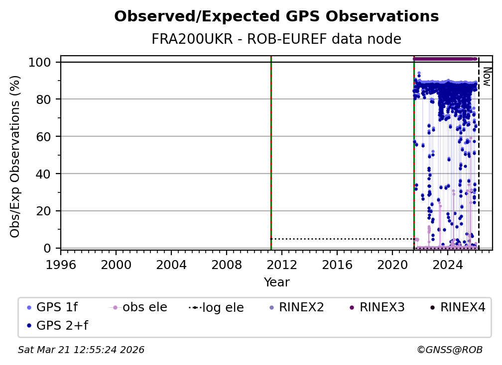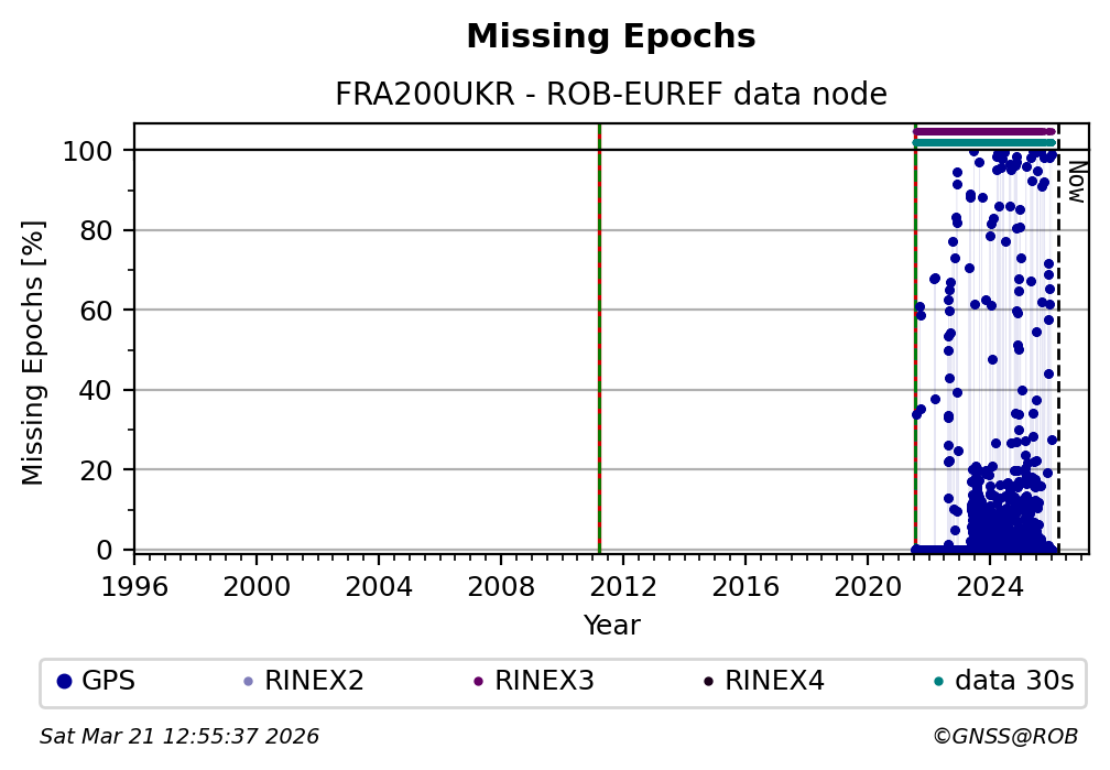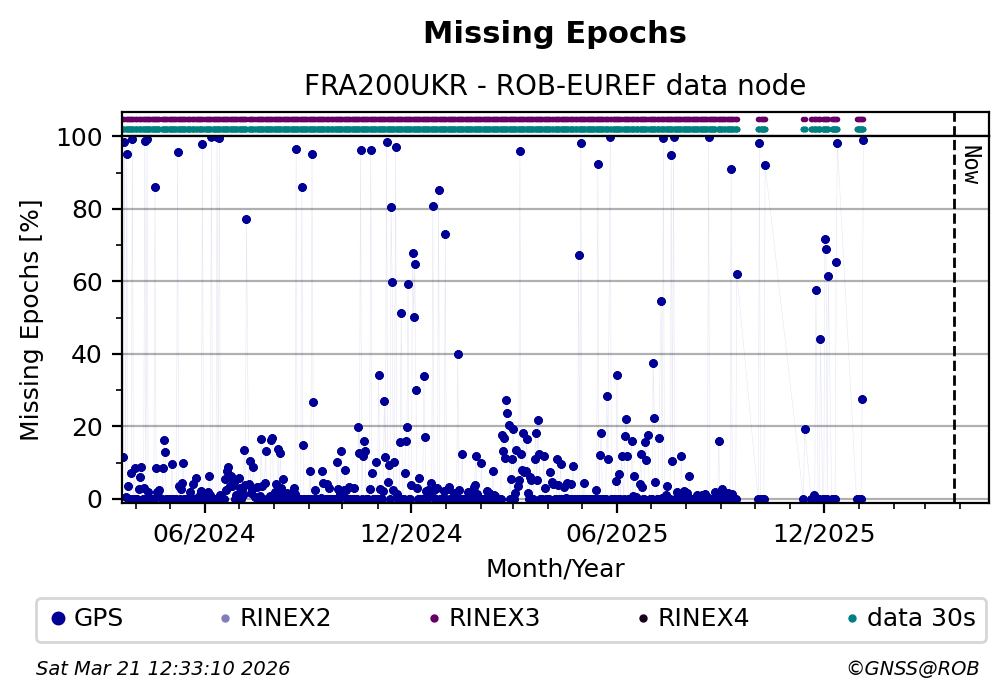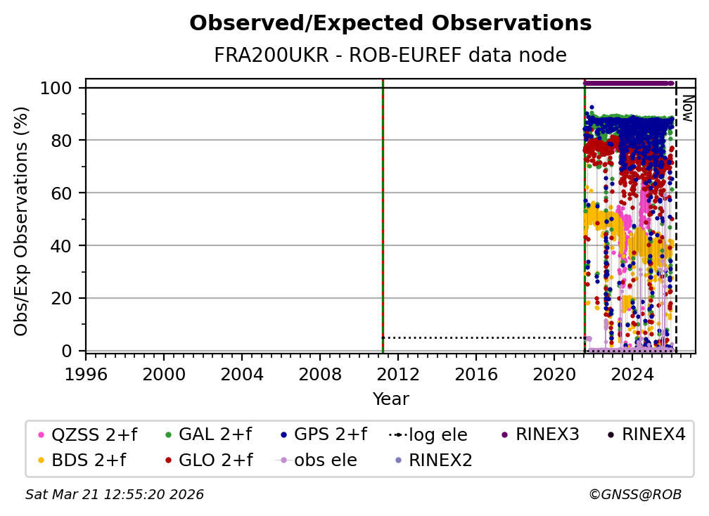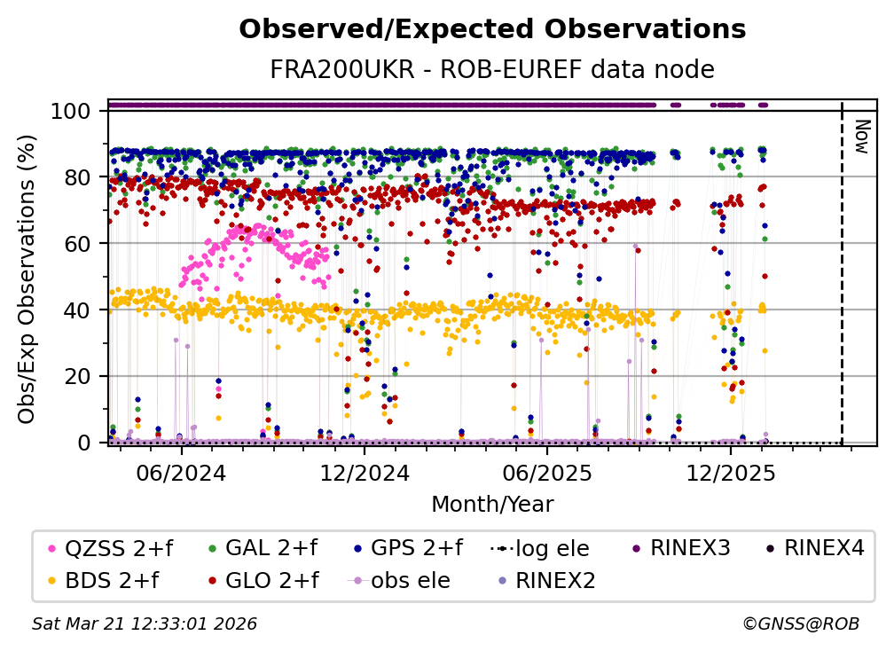 The plots below present the long-term tracking performance of the EPOS-GNSS station FRA200UKR based on the daily RINEX data available from the ROB-EUREF EPOS-GNSS data node. The data quality metrics have been computed at the data node using the G-Nut/Anubis software.