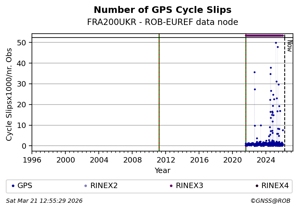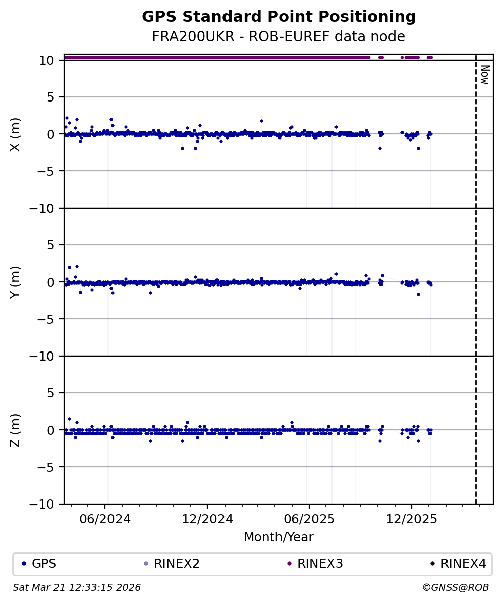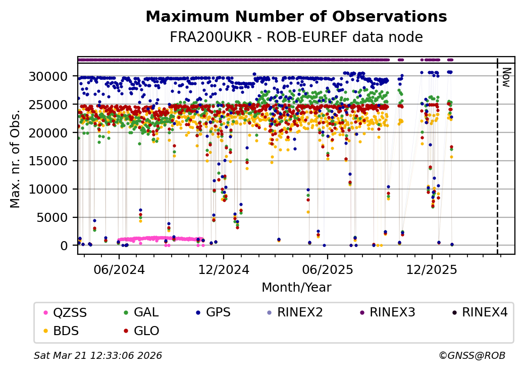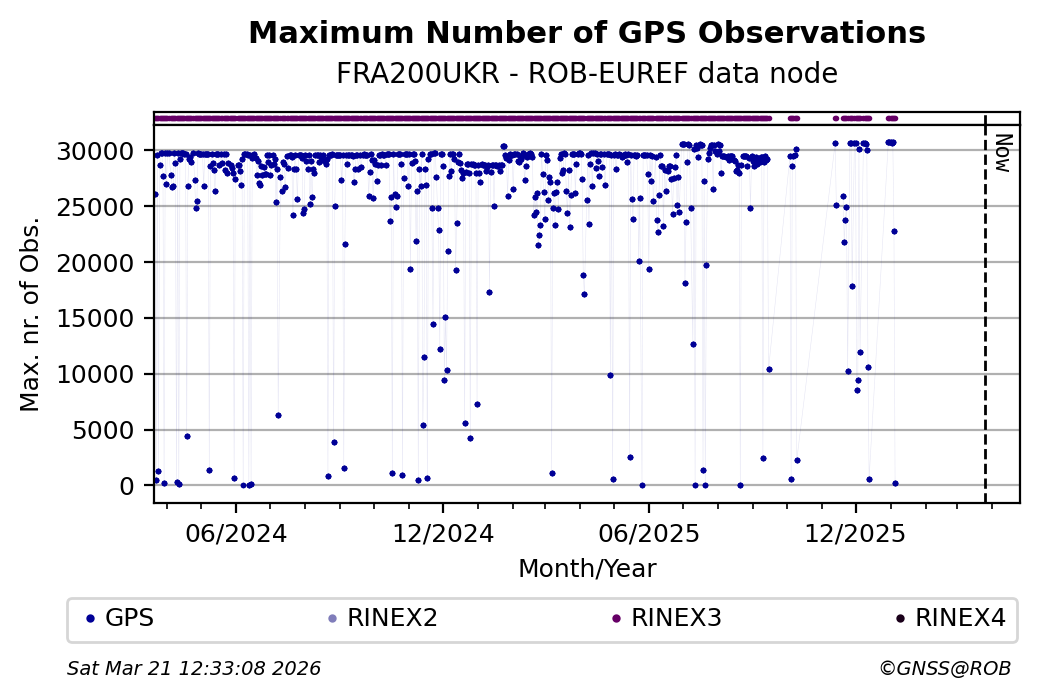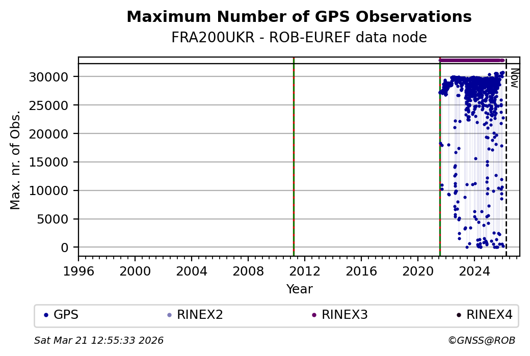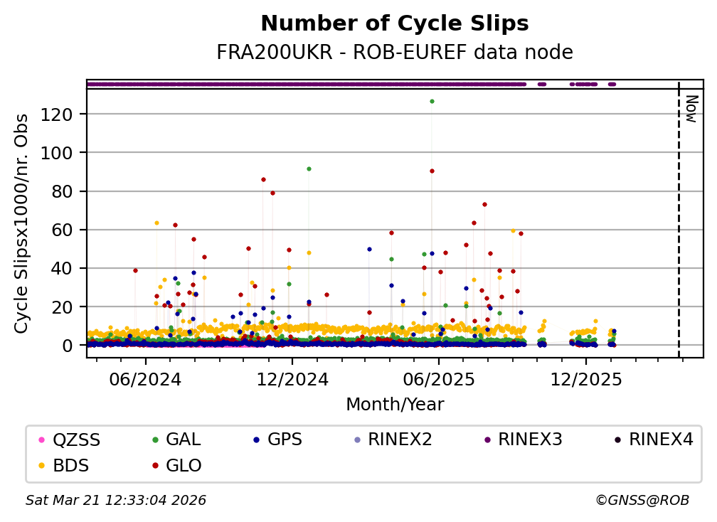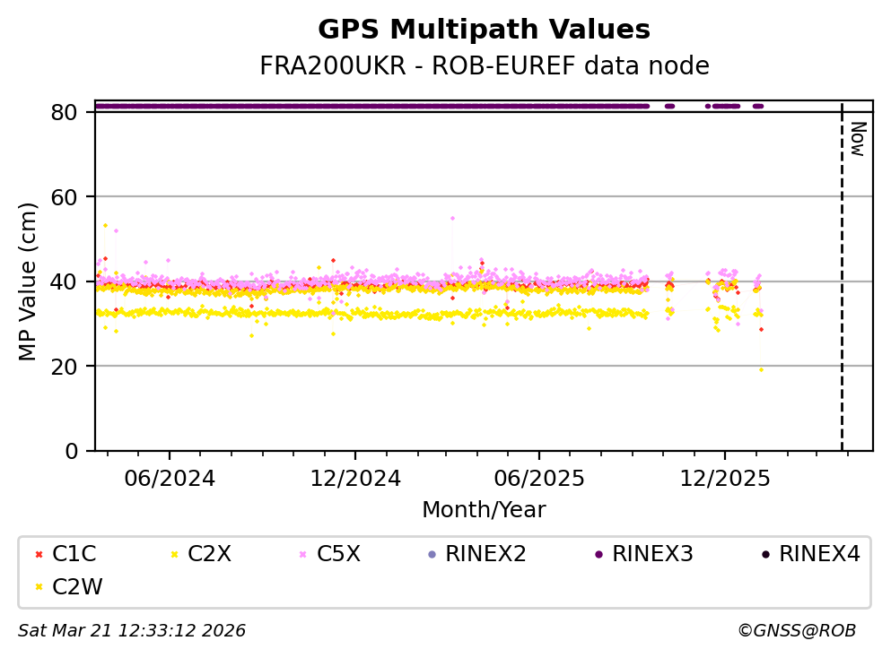 The plots below present the long-term tracking performance of the EPOS-GNSS station FRA200UKR based on the daily RINEX data available from the ROB-EUREF EPOS-GNSS data node. The data quality metrics have been computed at the data node using the G-Nut/Anubis software.
