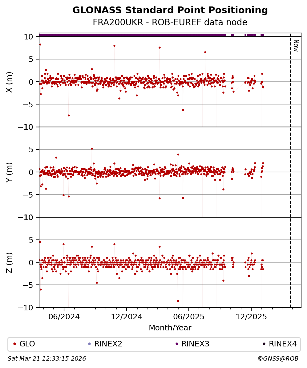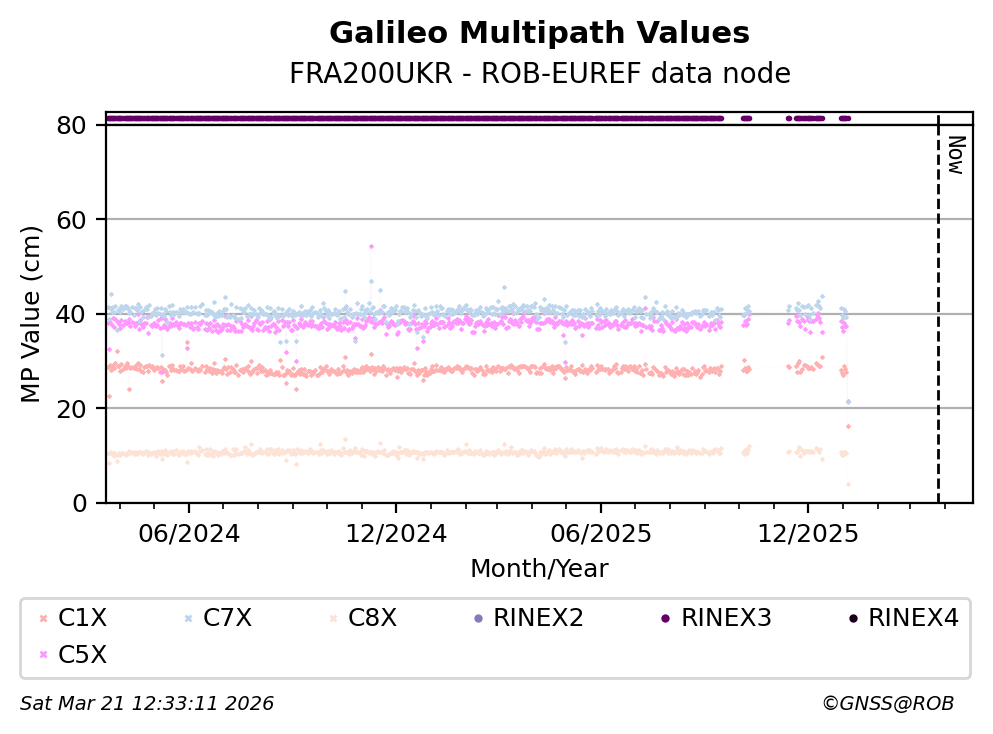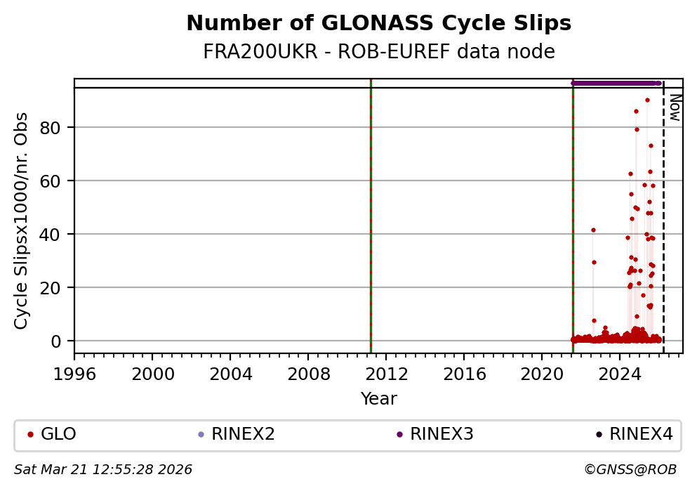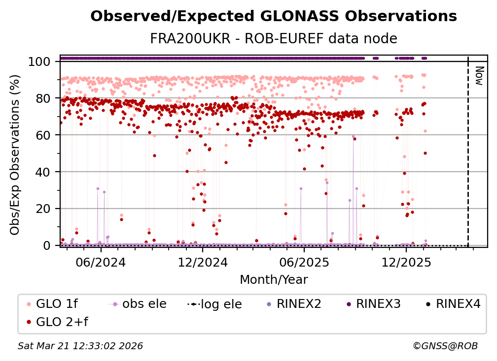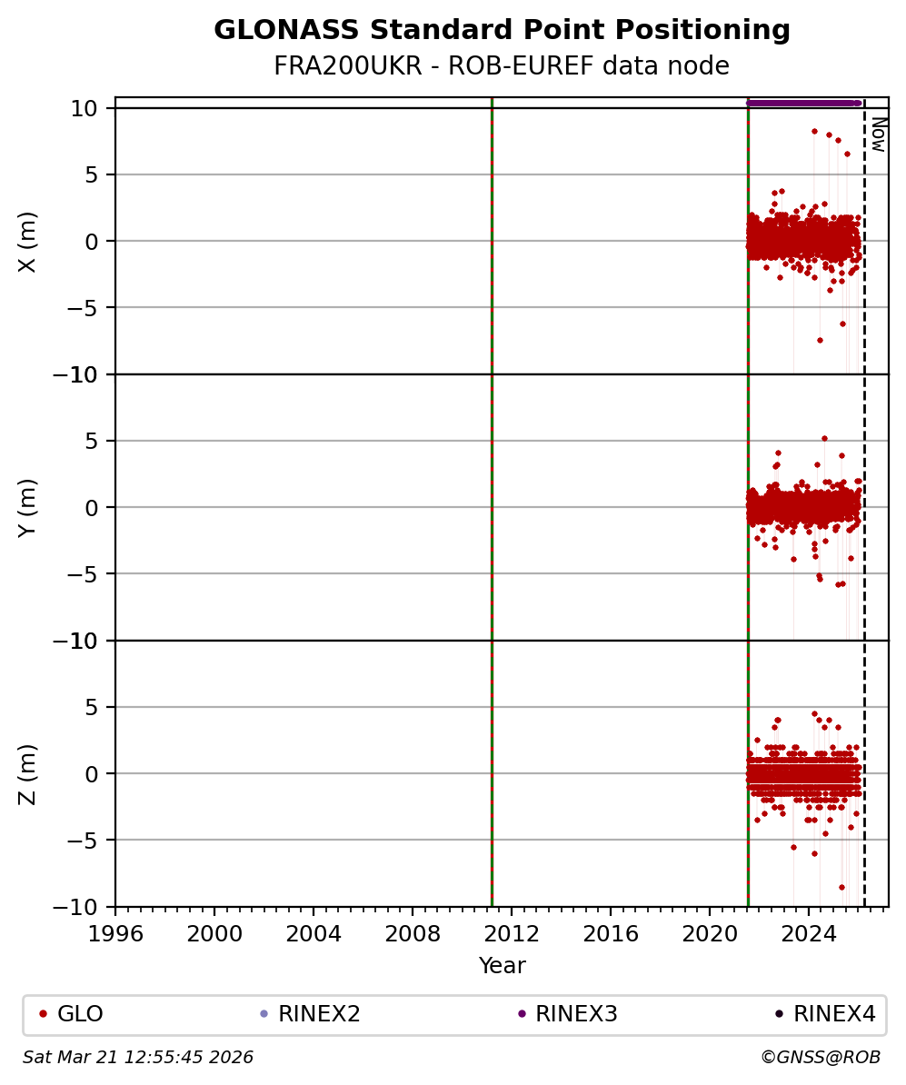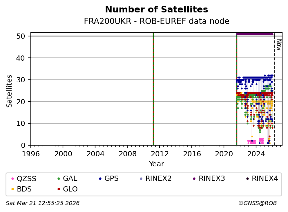 The plots below present the long-term tracking performance of the EPOS-GNSS station FRA200UKR based on the daily RINEX data available from the ROB-EUREF EPOS-GNSS data node. The data quality metrics have been computed at the data node using the G-Nut/Anubis software.