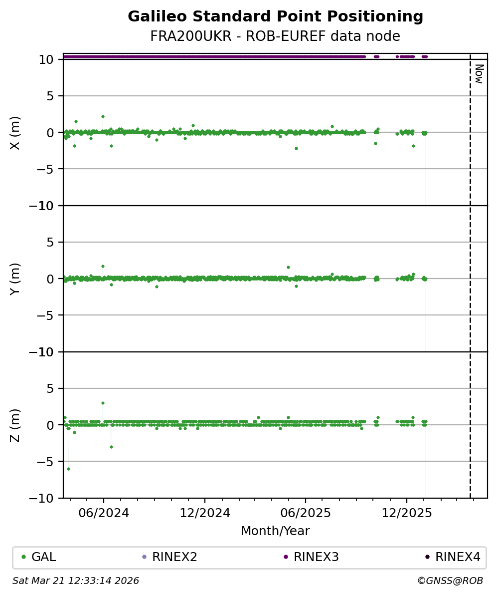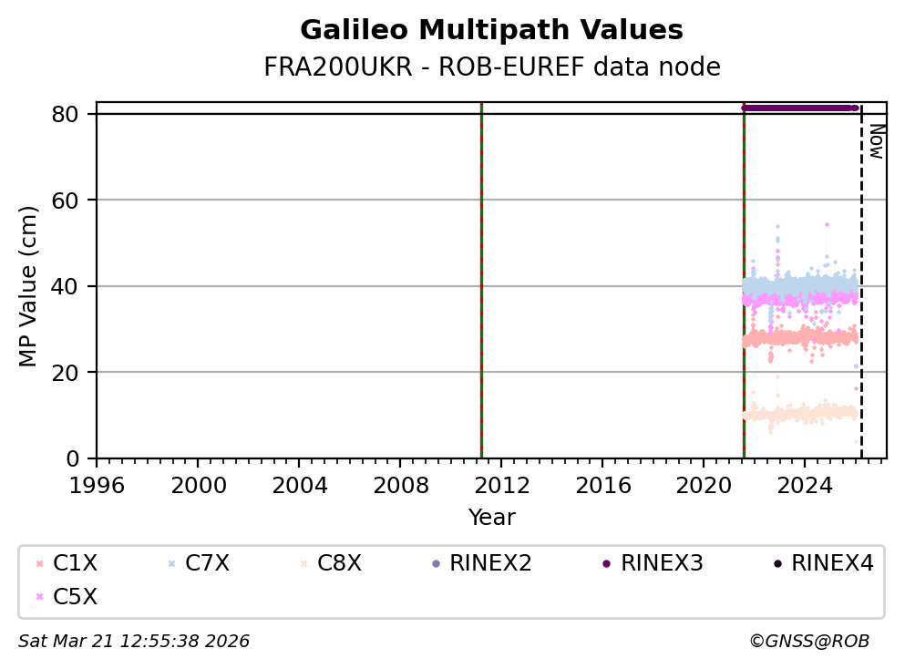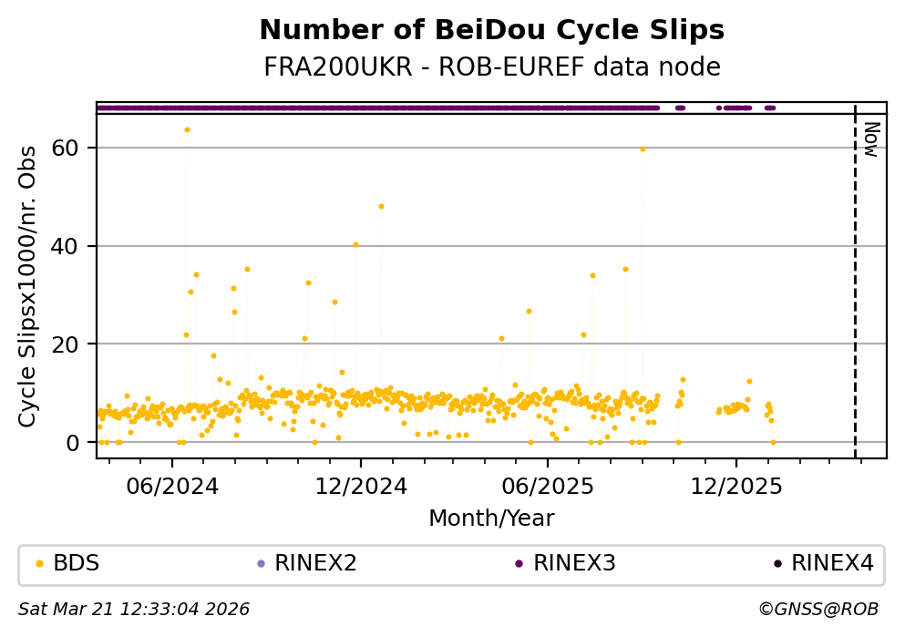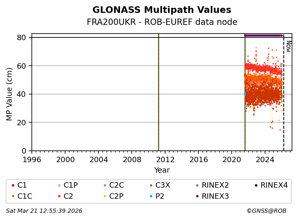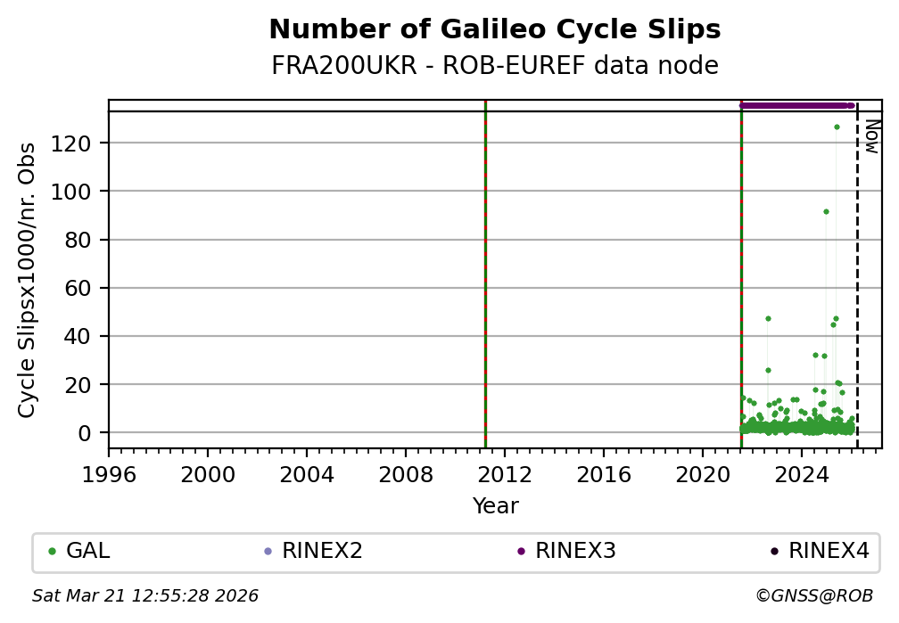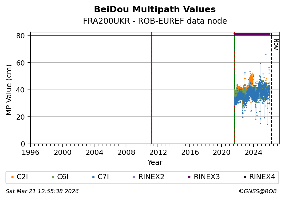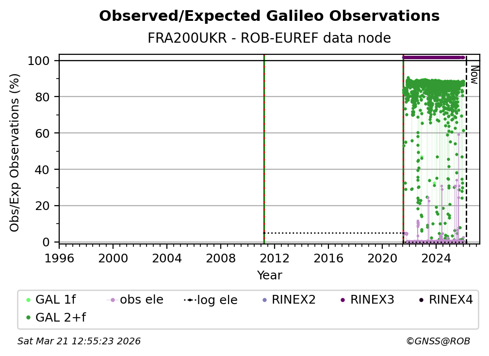 The plots below present the long-term tracking performance of the EPOS-GNSS station FRA200UKR based on the daily RINEX data available from the ROB-EUREF EPOS-GNSS data node. The data quality metrics have been computed at the data node using the G-Nut/Anubis software.