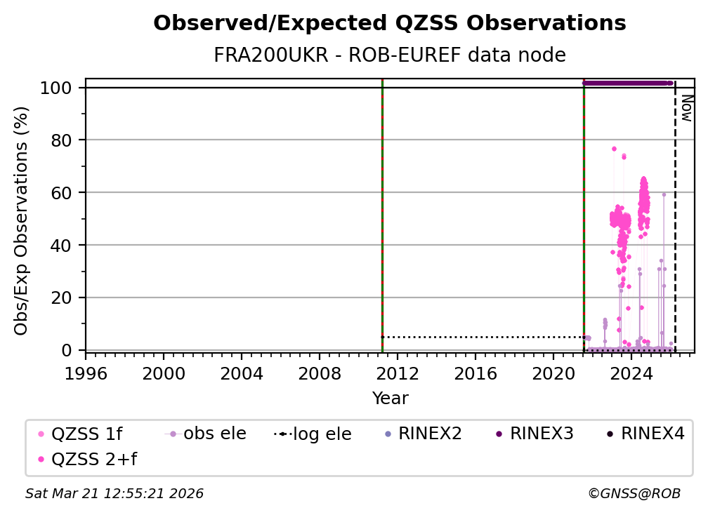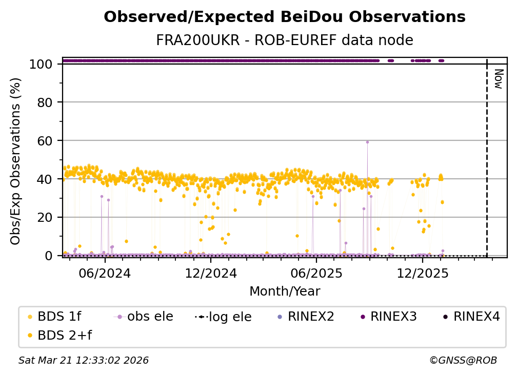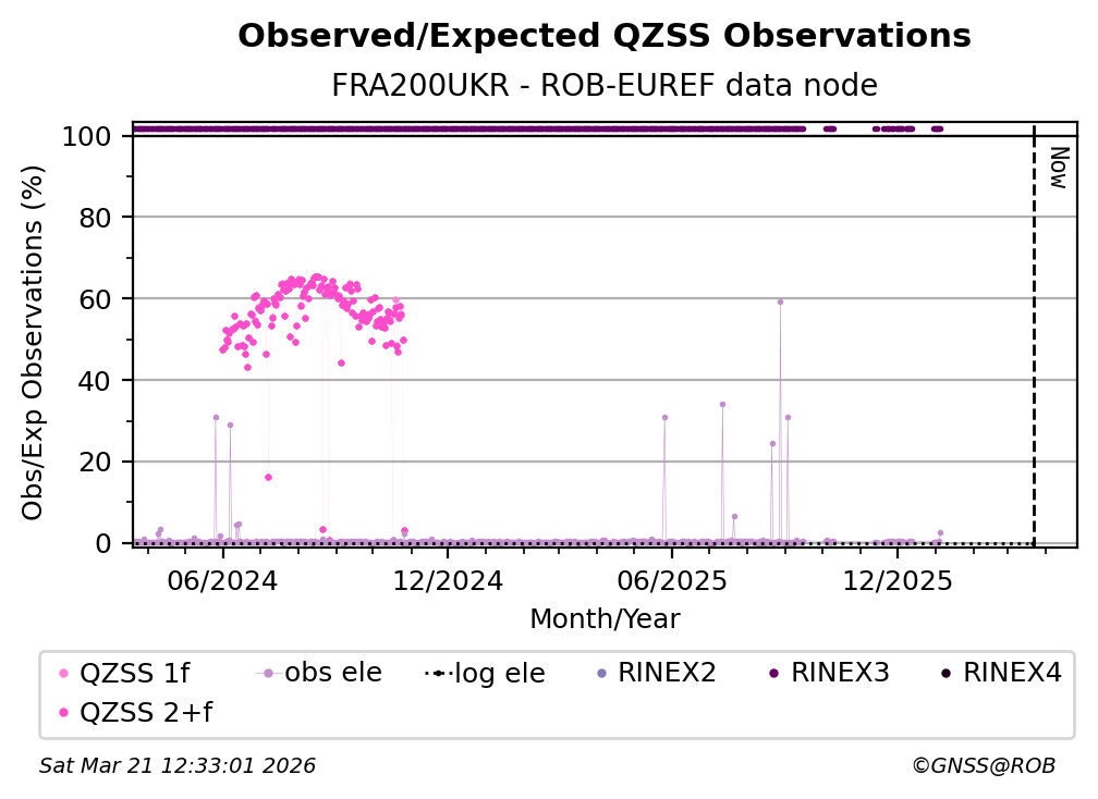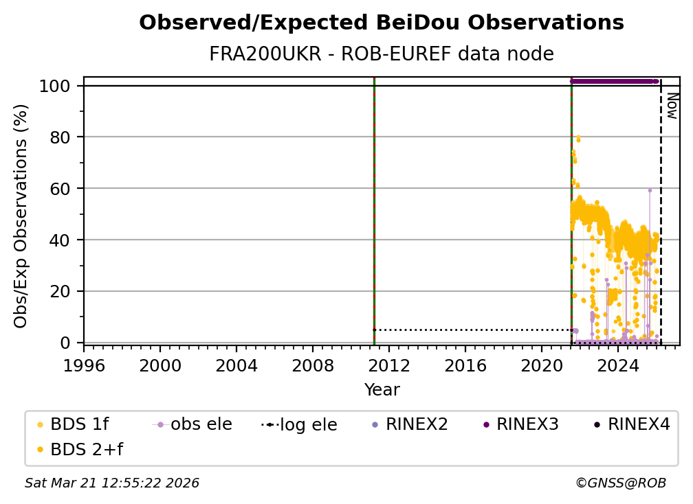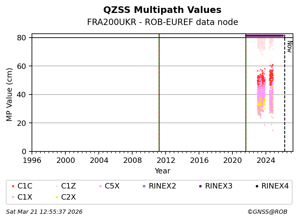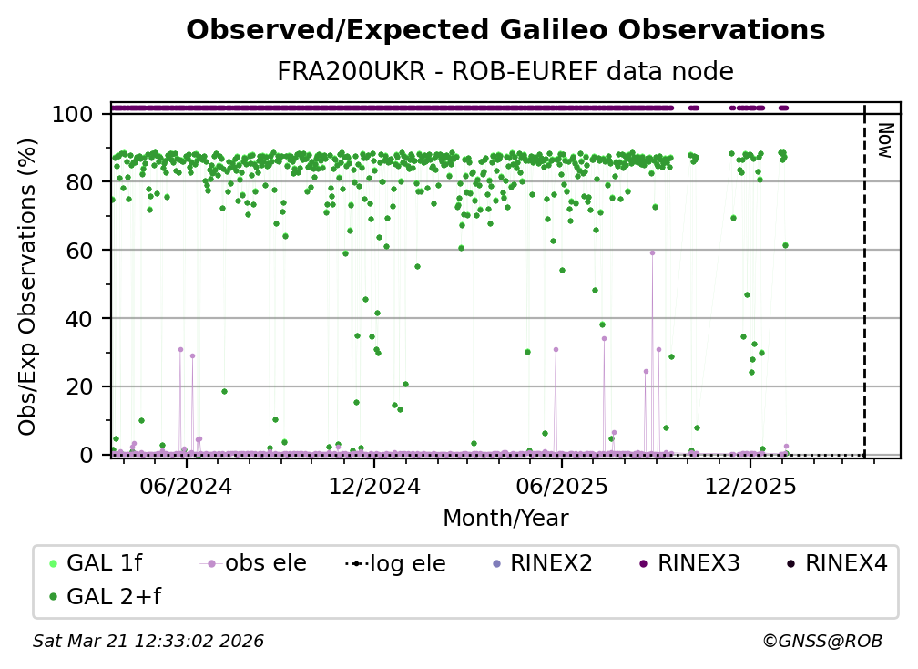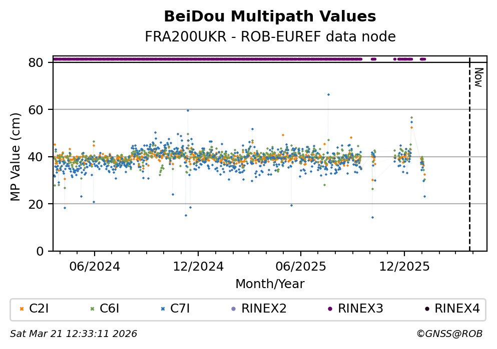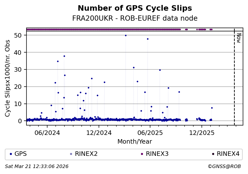 The plots below present the long-term tracking performance of the EPOS-GNSS station FRA200UKR based on the daily RINEX data available from the ROB-EUREF EPOS-GNSS data node. The data quality metrics have been computed at the data node using the G-Nut/Anubis software.