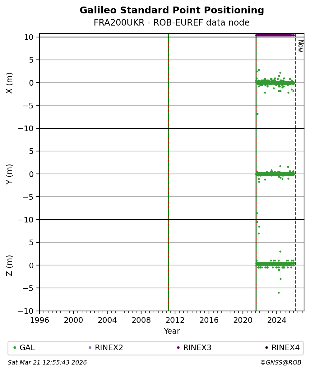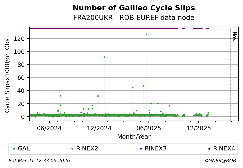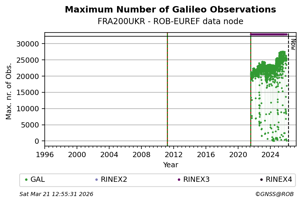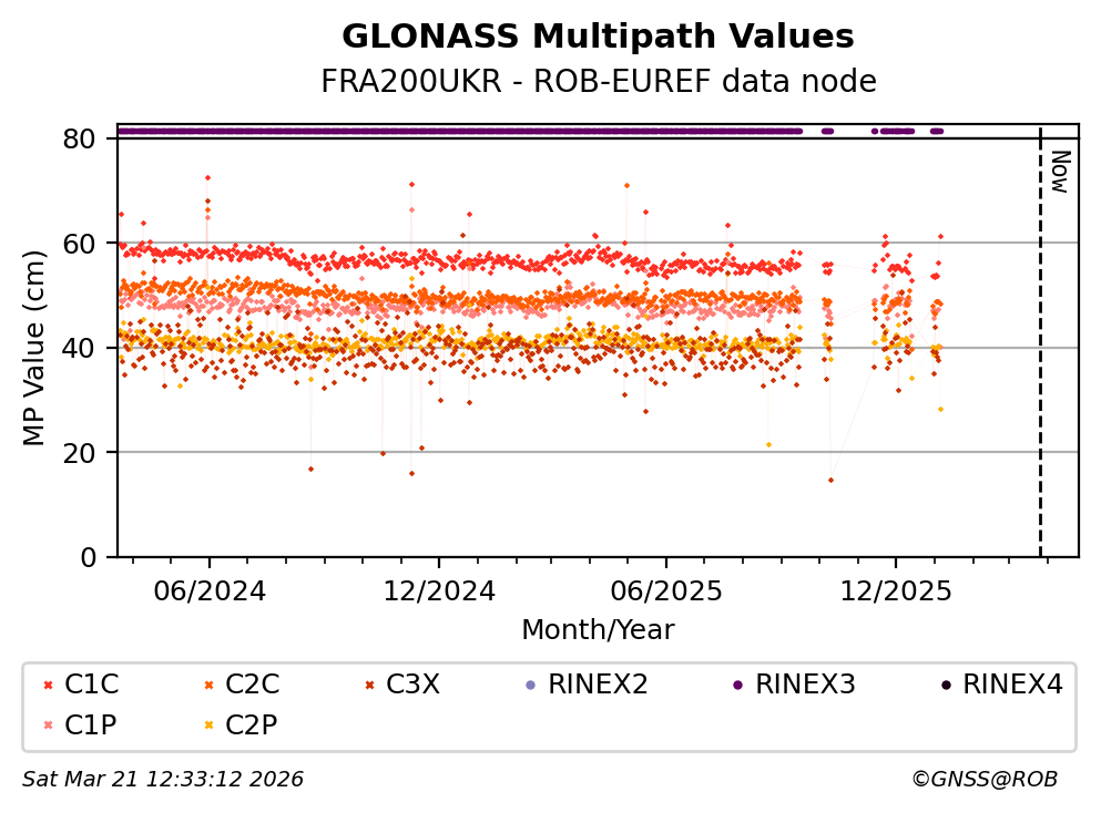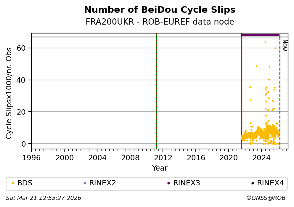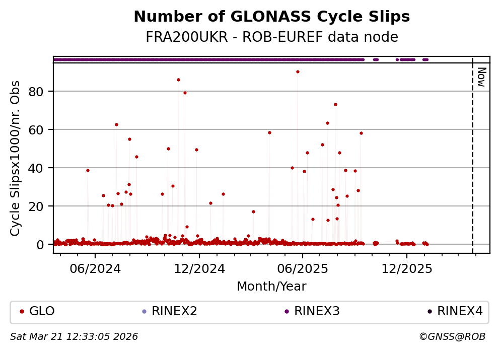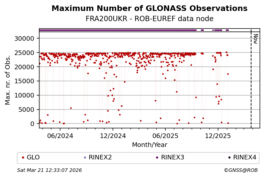 The plots below present the long-term tracking performance of the EPOS-GNSS station FRA200UKR based on the daily RINEX data available from the ROB-EUREF EPOS-GNSS data node. The data quality metrics have been computed at the data node using the G-Nut/Anubis software.