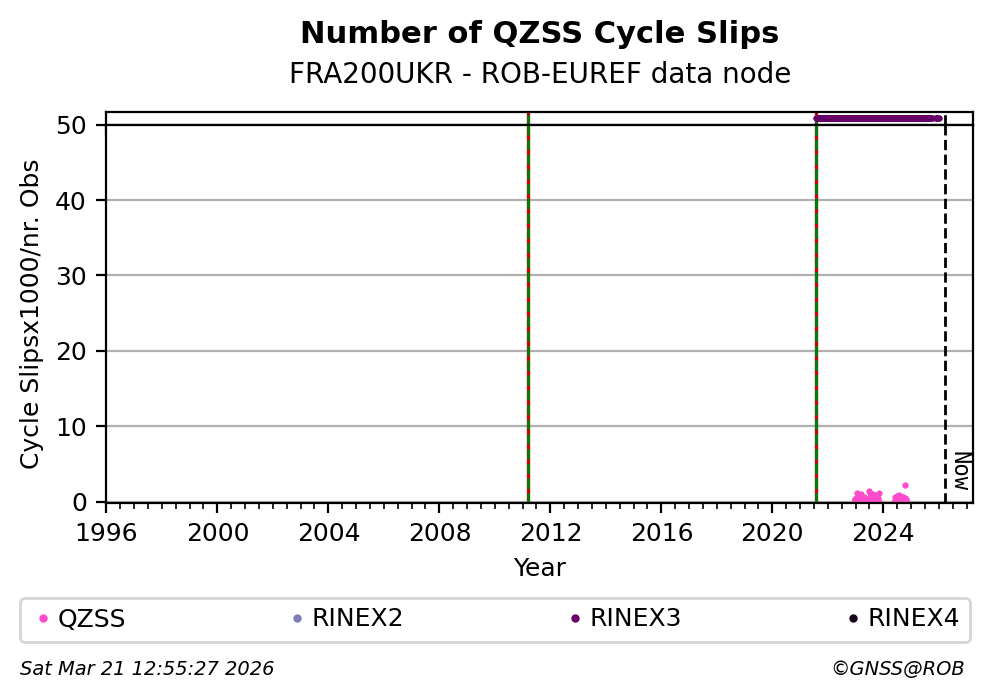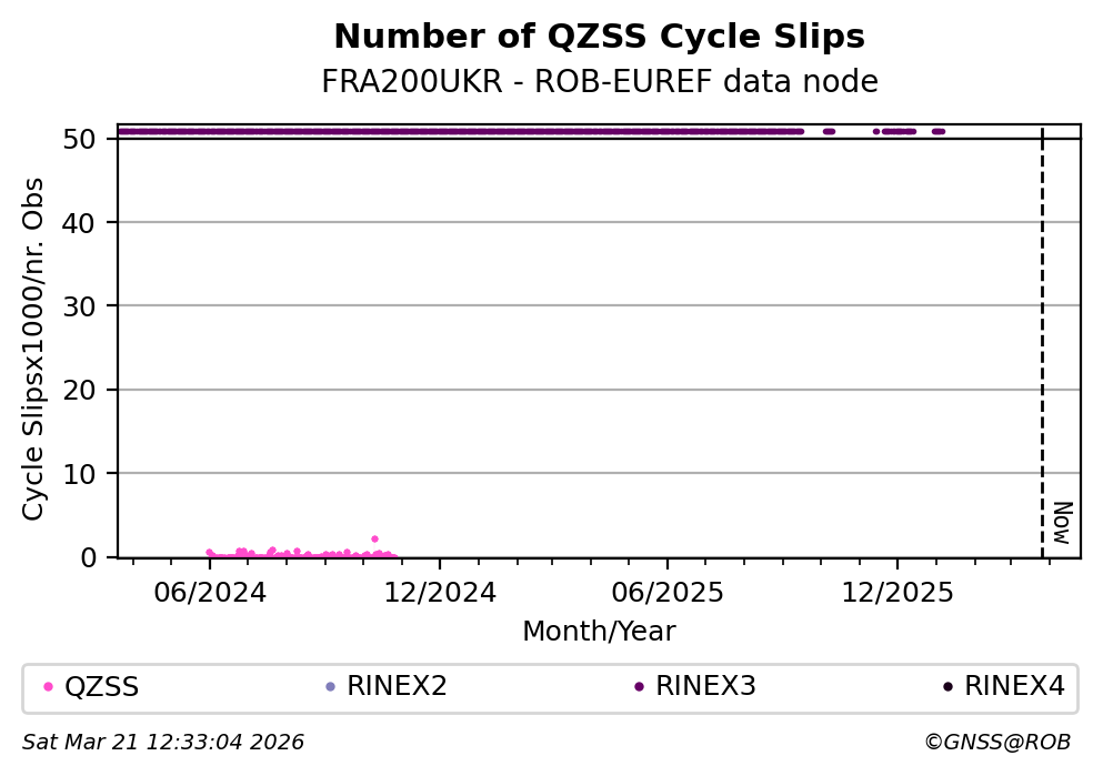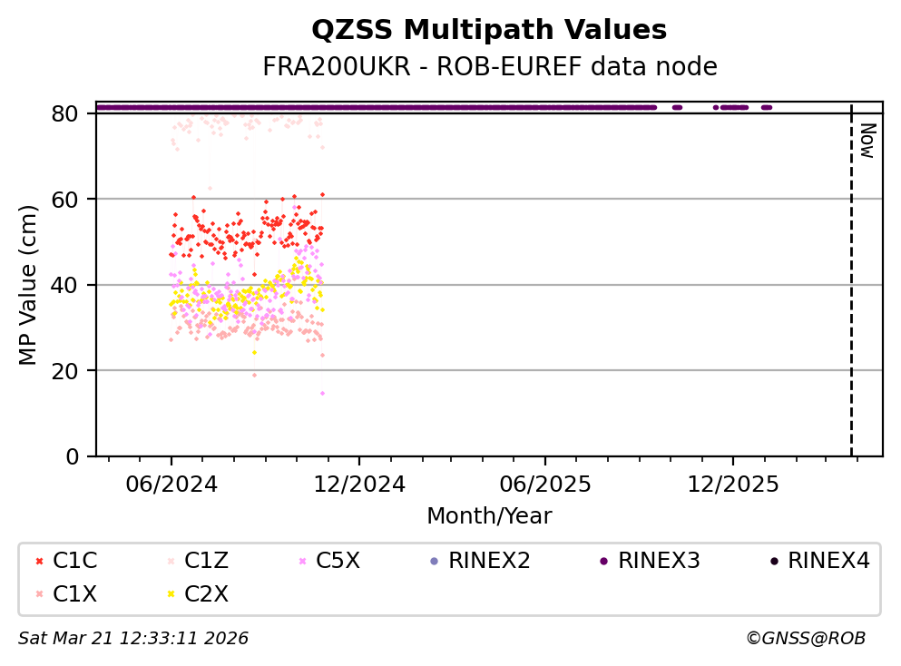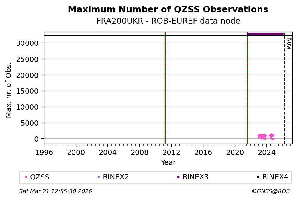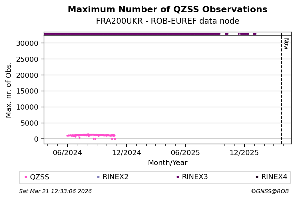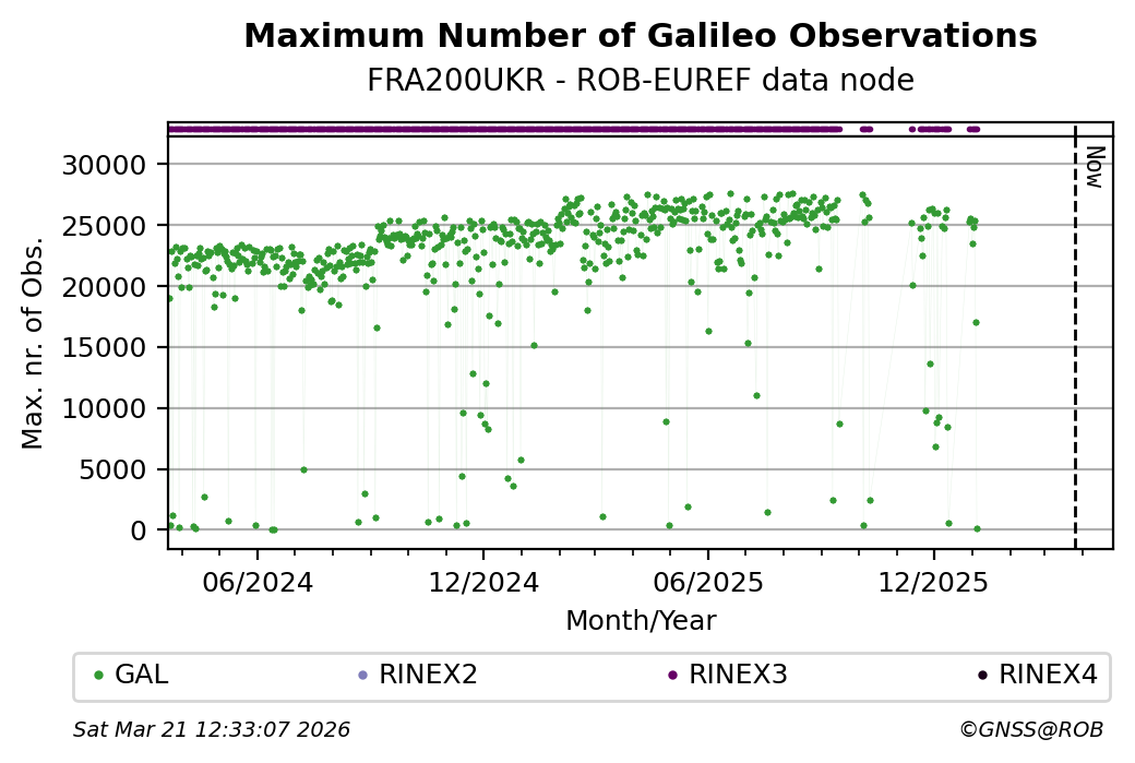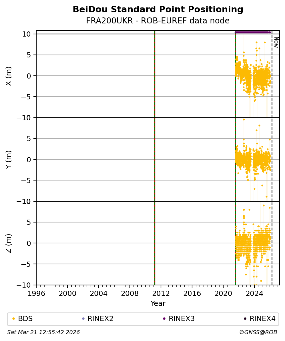 The plots below present the long-term tracking performance of the EPOS-GNSS station FRA200UKR based on the daily RINEX data available from the ROB-EUREF EPOS-GNSS data node. The data quality metrics have been computed at the data node using the G-Nut/Anubis software.