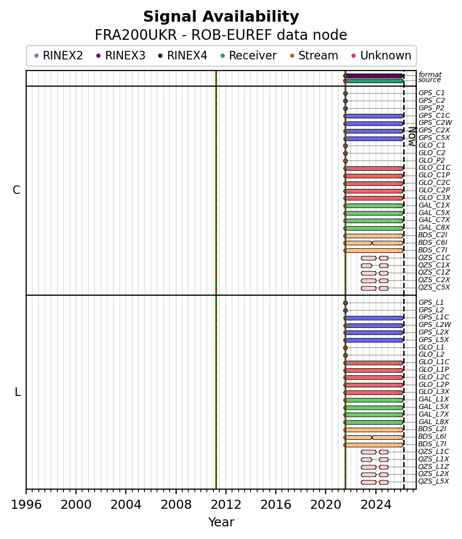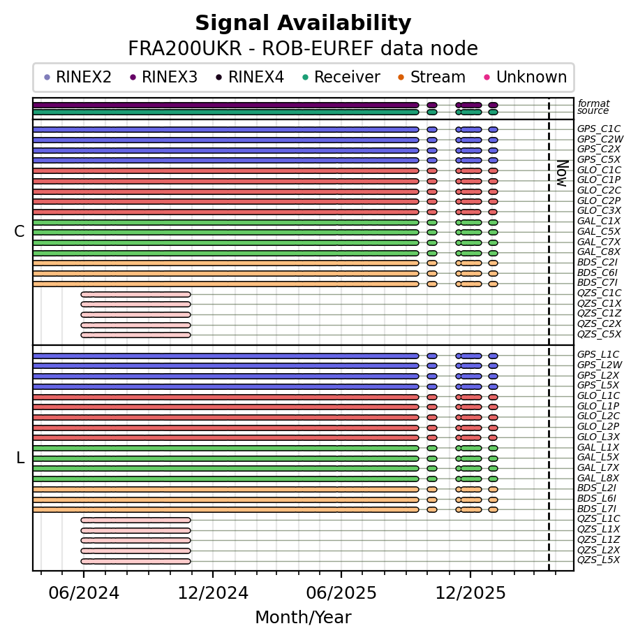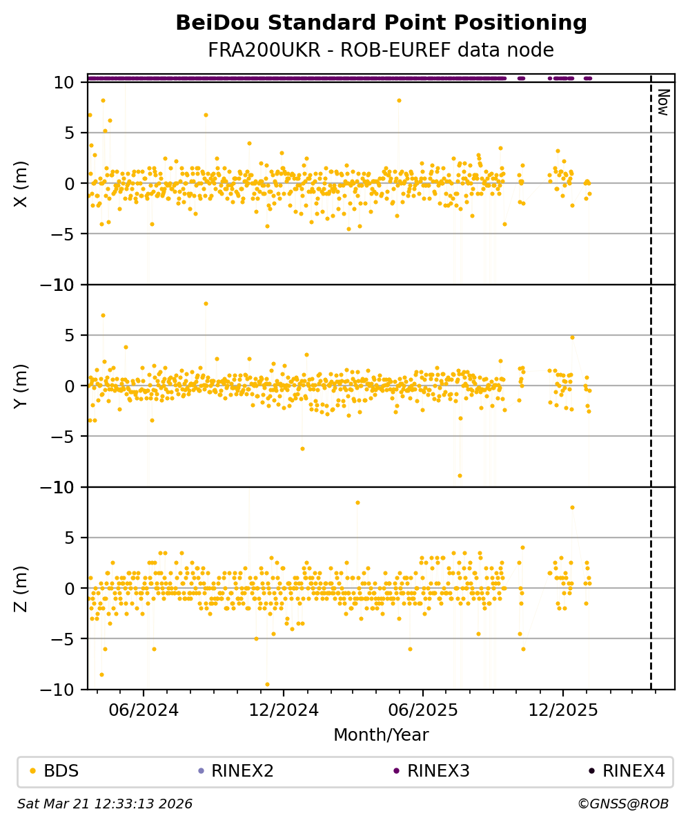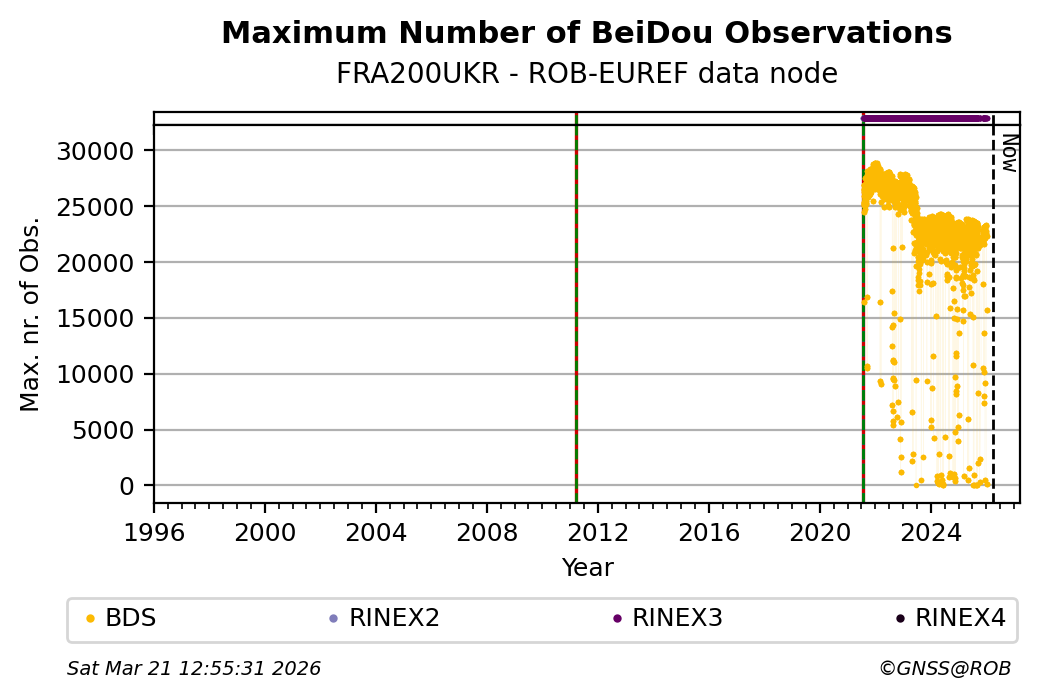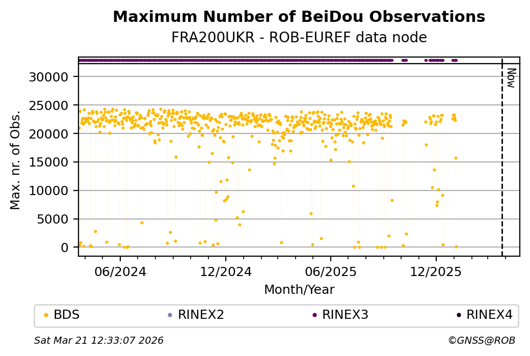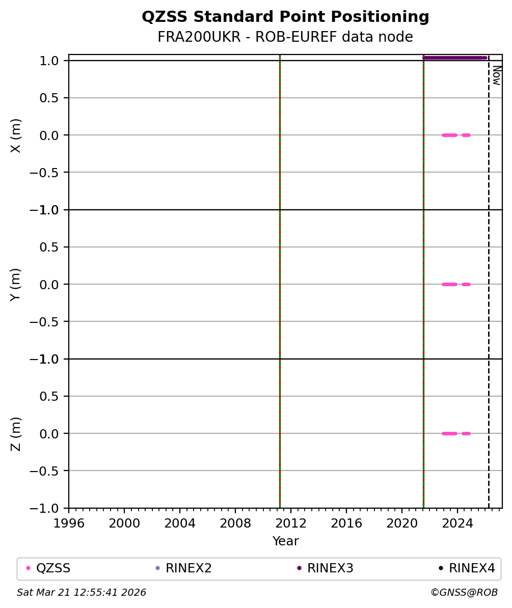 The plots below present the long-term tracking performance of the EPOS-GNSS station FRA200UKR based on the daily RINEX data available from the ROB-EUREF EPOS-GNSS data node. The data quality metrics have been computed at the data node using the G-Nut/Anubis software.