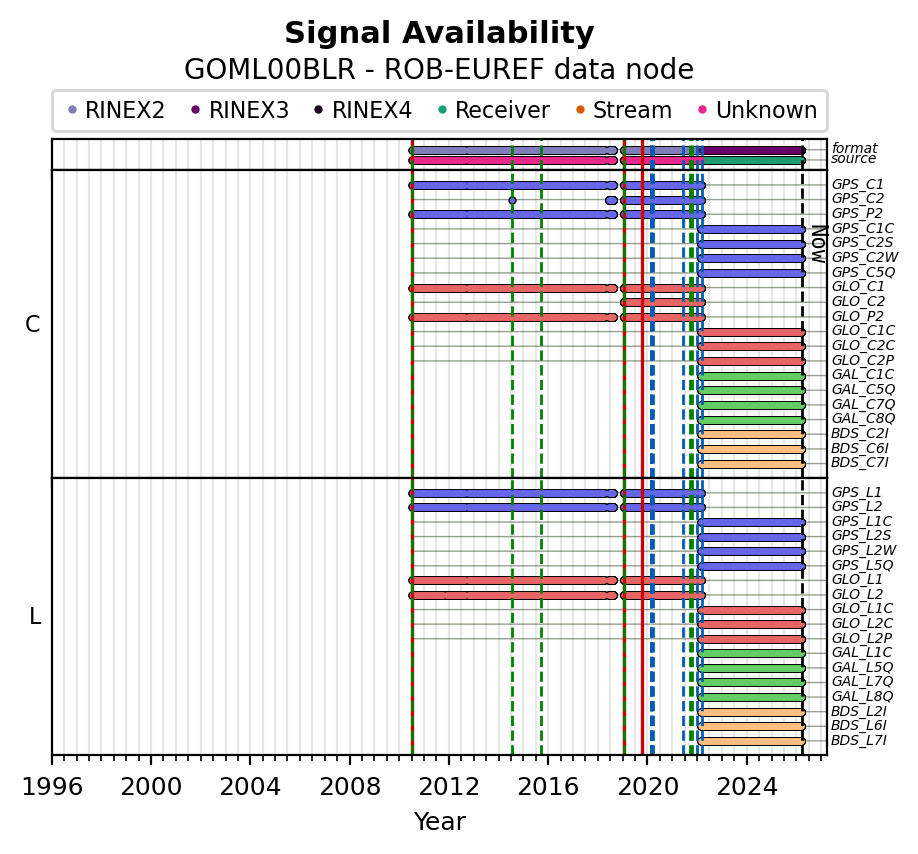 Red vertical lines, green and blue vertical dotted lines indicate respectively a change of antenna, receiver or receiver configuration (including firmware) as indicated by the station manager in the station site log available from the M3G GNSS Metadata Catalog. The purple points in the top of the plot indicate the daily RINEX data availability at the data node.