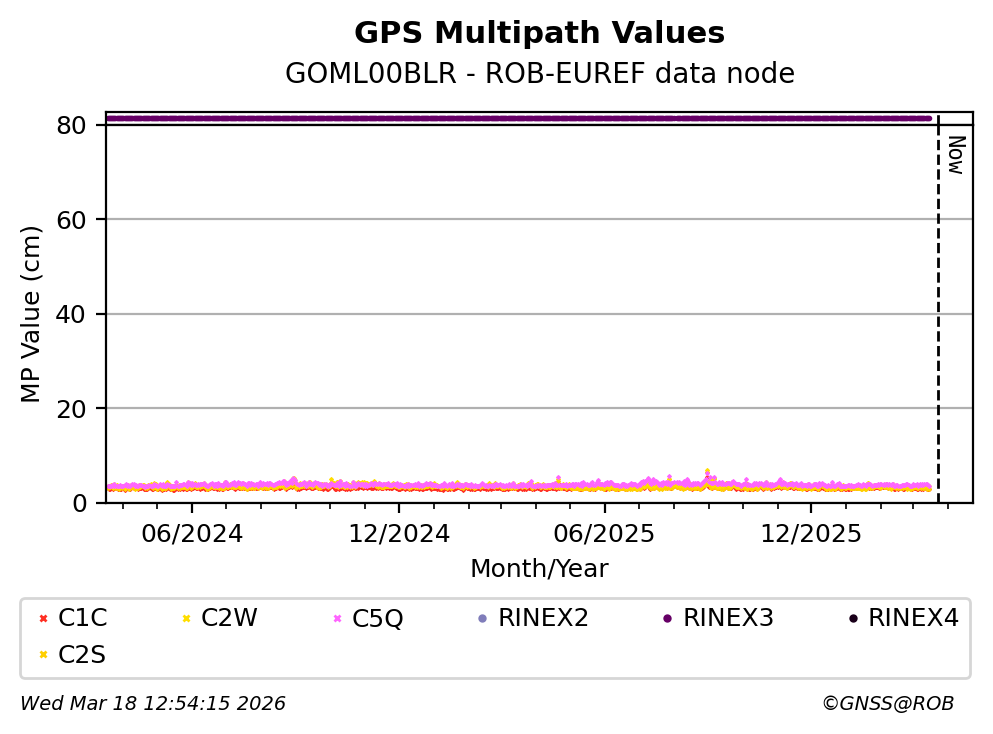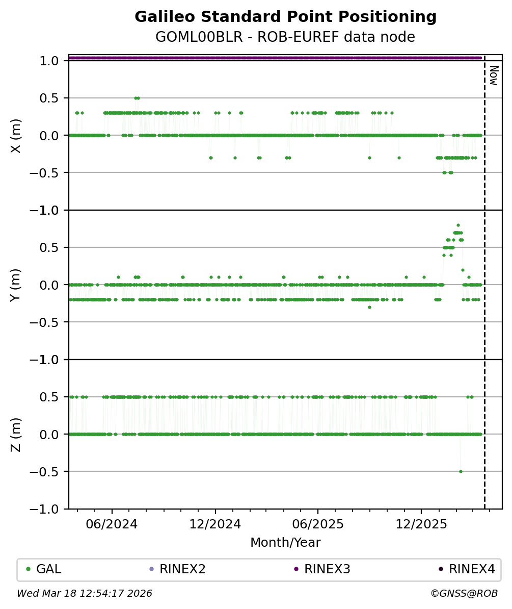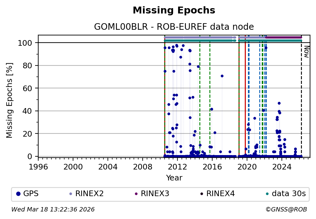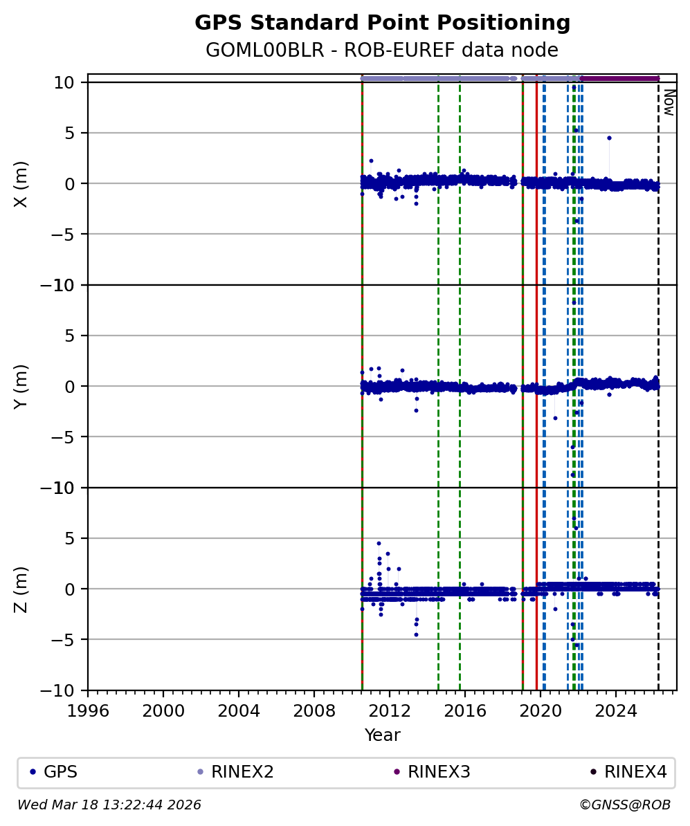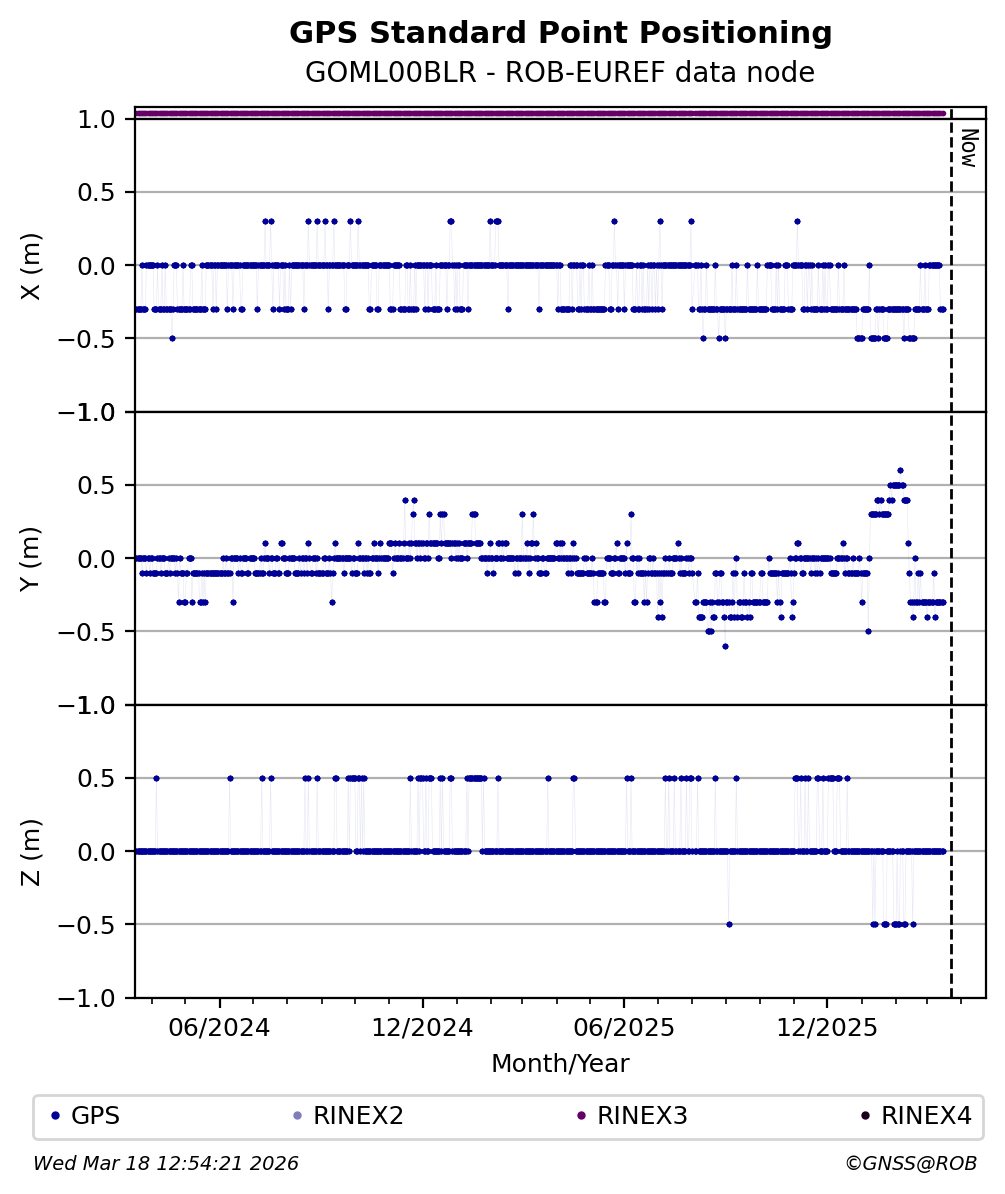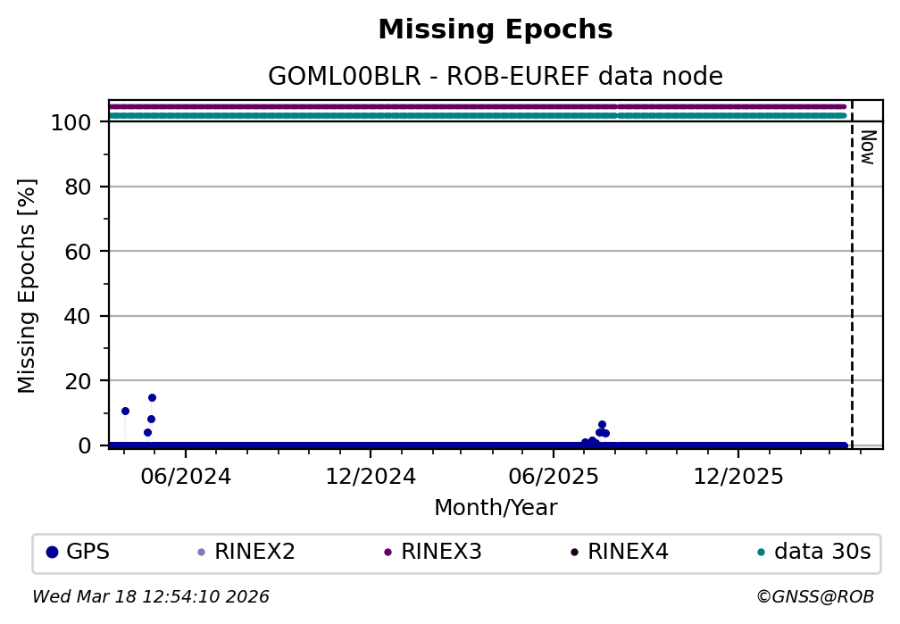 The plots below present the long-term tracking performance of the EPOS-GNSS station GOML00BLR based on the daily RINEX data available from the ROB-EUREF EPOS-GNSS data node. The data quality metrics have been computed at the data node using the G-Nut/Anubis software.