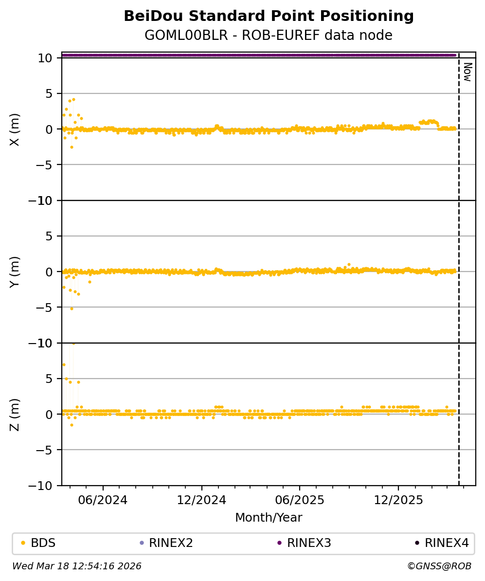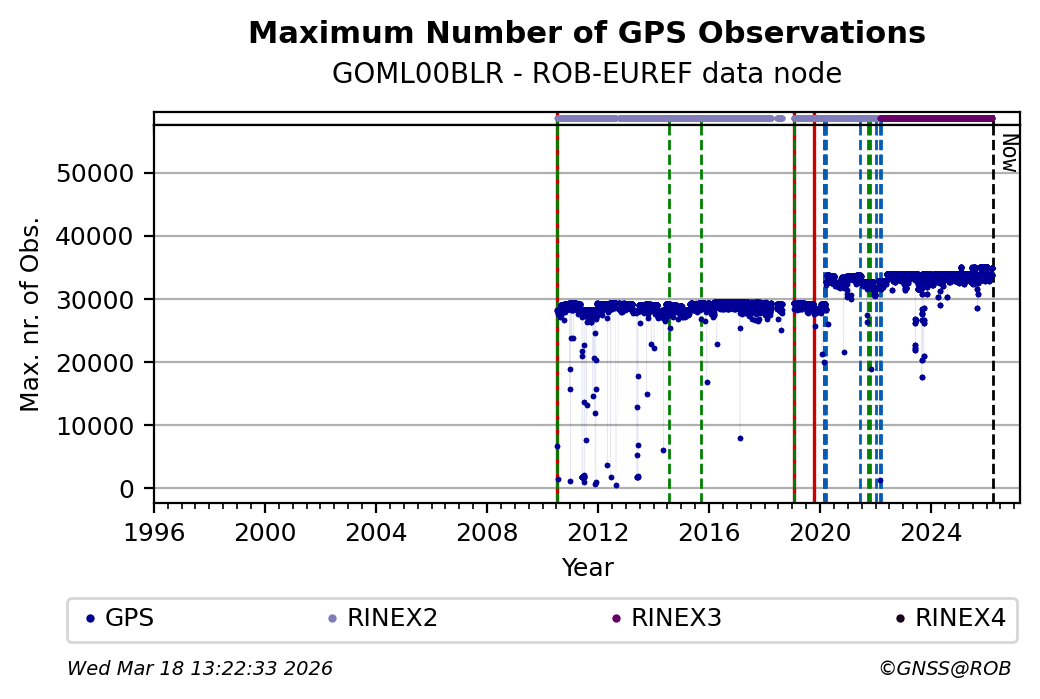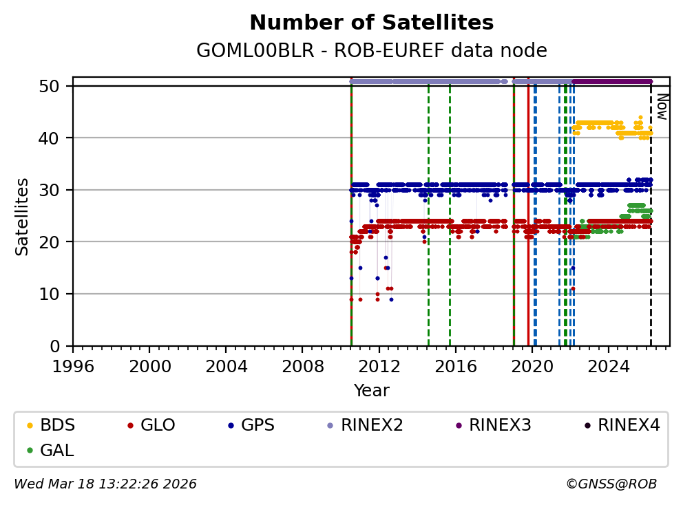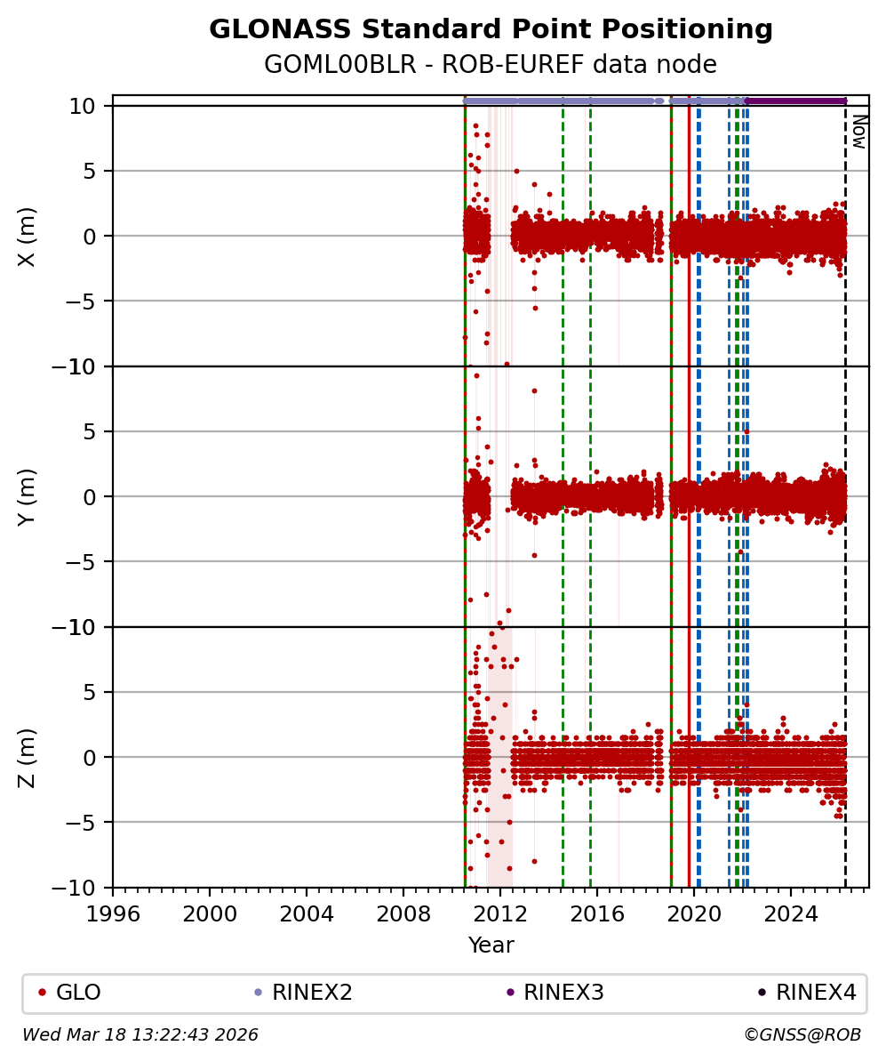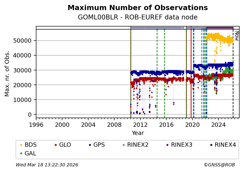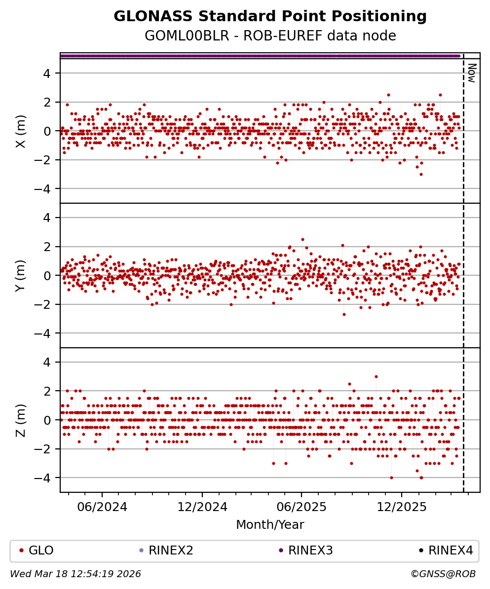 The plots below present the long-term tracking performance of the EPOS-GNSS station GOML00BLR based on the daily RINEX data available from the ROB-EUREF EPOS-GNSS data node. The data quality metrics have been computed at the data node using the G-Nut/Anubis software.