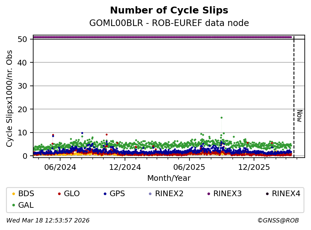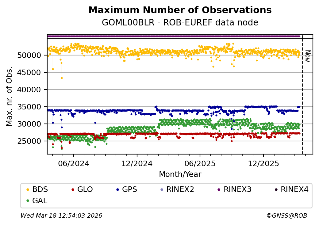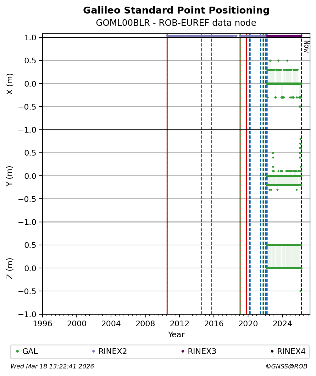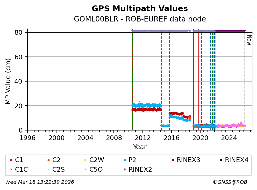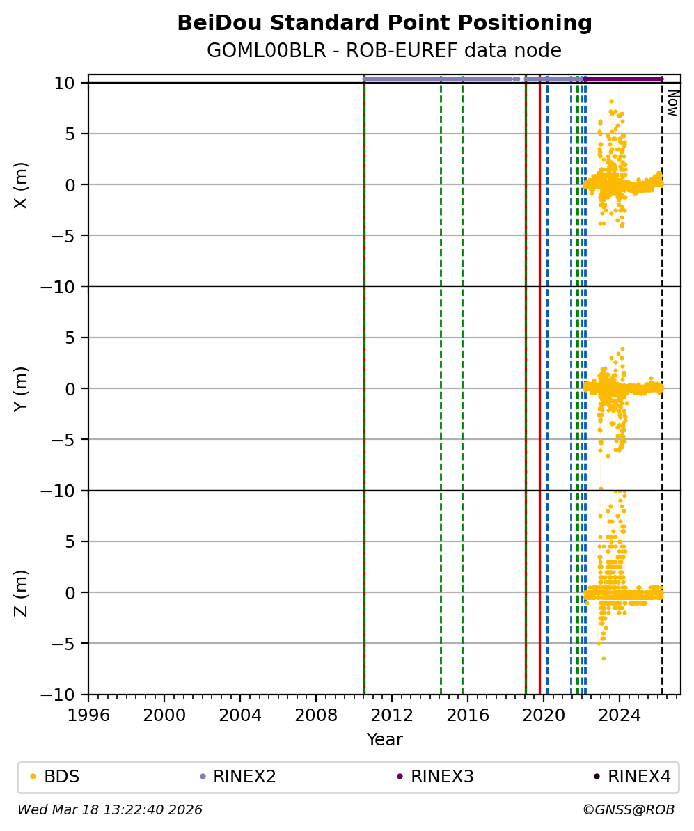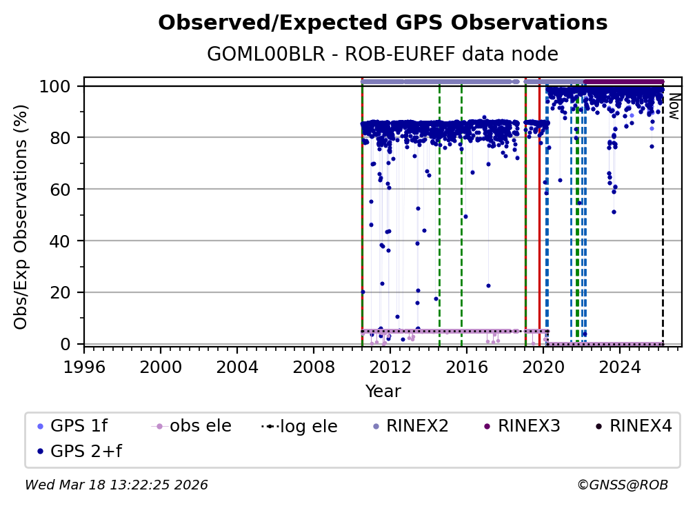 The plots below present the long-term tracking performance of the EPOS-GNSS station GOML00BLR based on the daily RINEX data available from the ROB-EUREF EPOS-GNSS data node. The data quality metrics have been computed at the data node using the G-Nut/Anubis software.