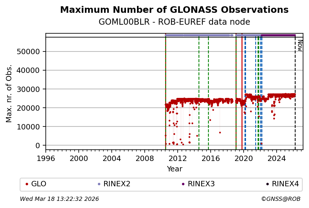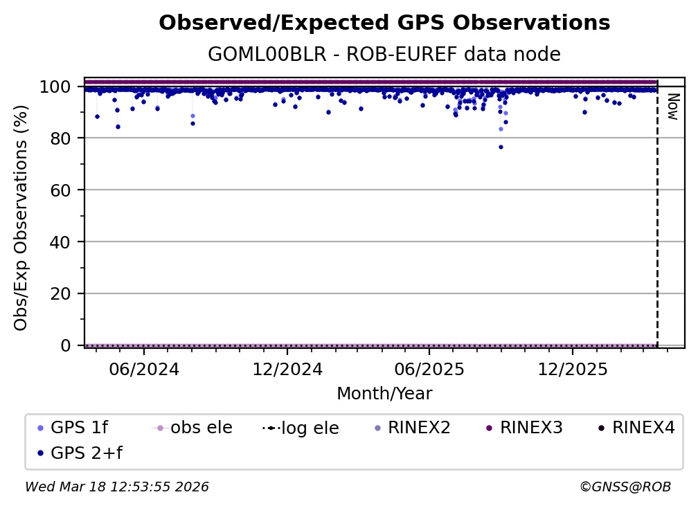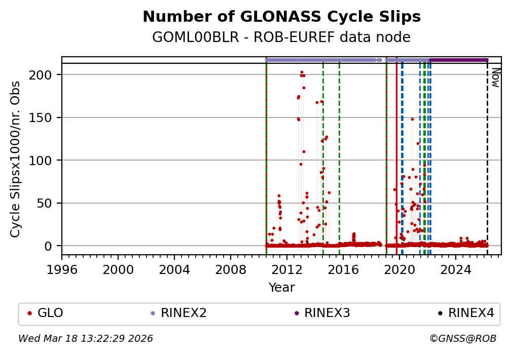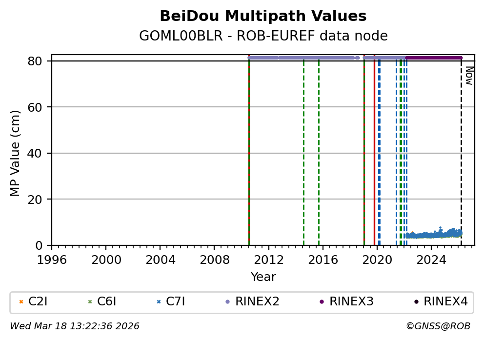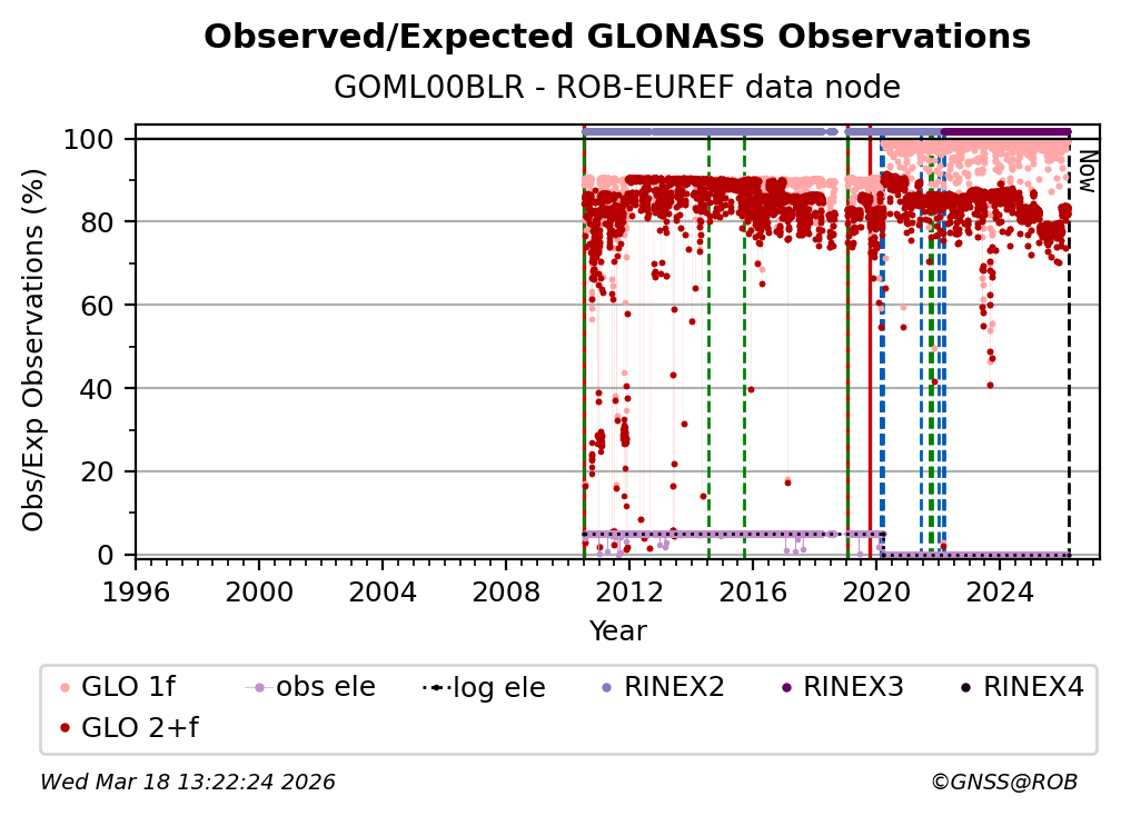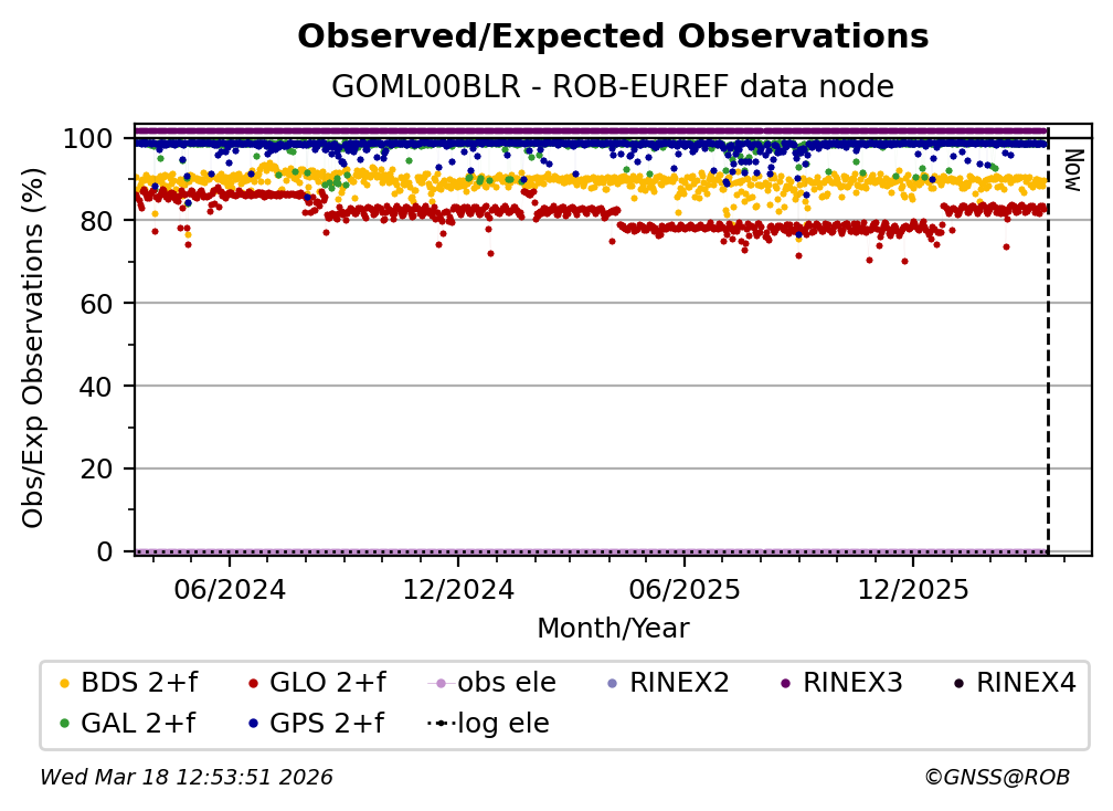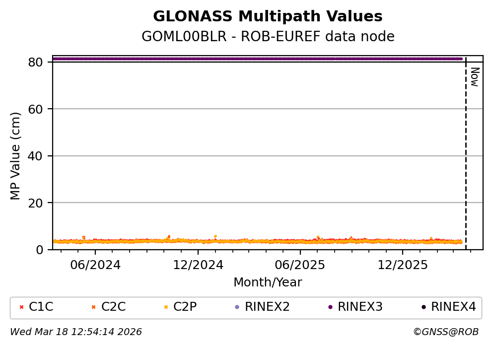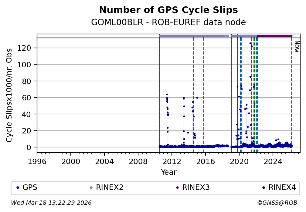 The plots below present the long-term tracking performance of the EPOS-GNSS station GOML00BLR based on the daily RINEX data available from the ROB-EUREF EPOS-GNSS data node. The data quality metrics have been computed at the data node using the G-Nut/Anubis software.
