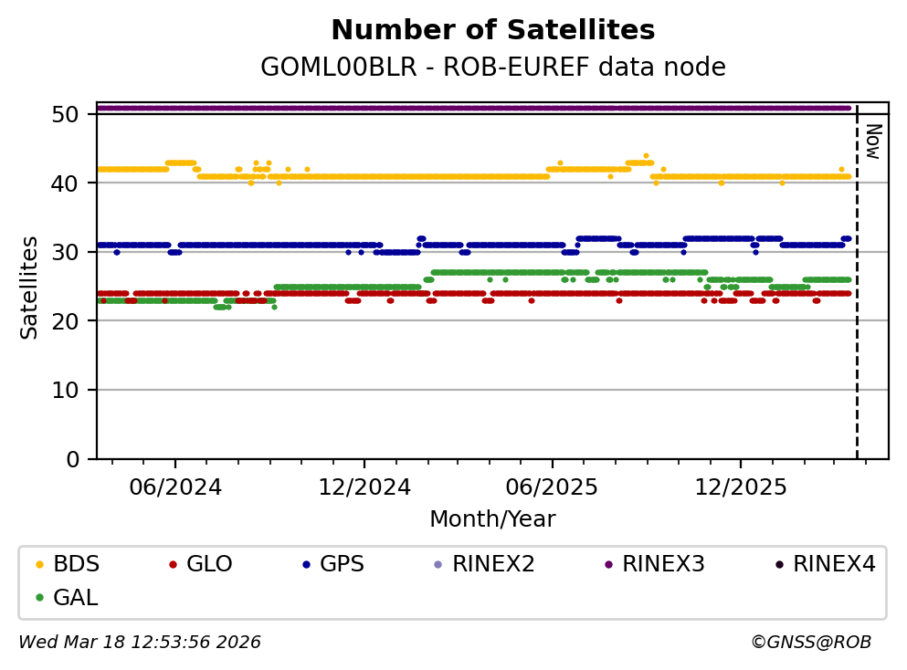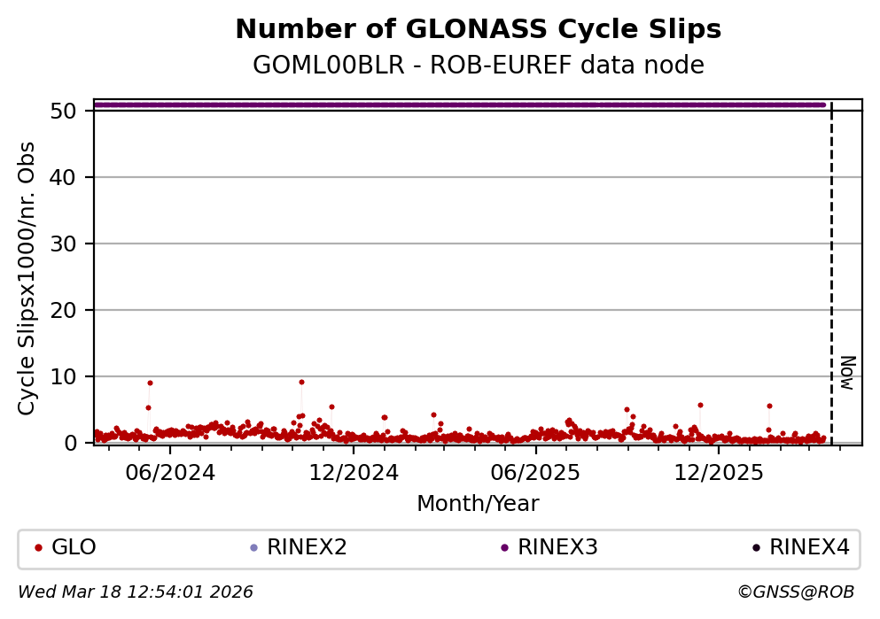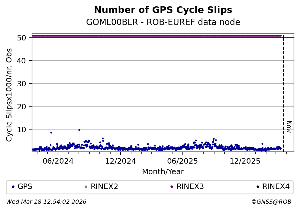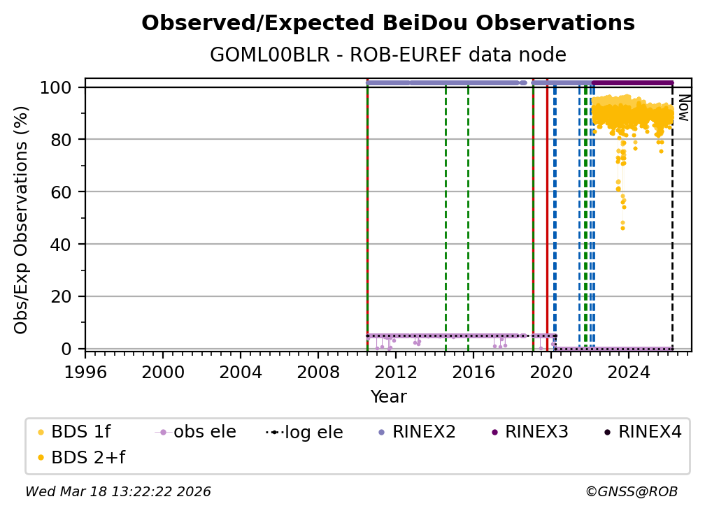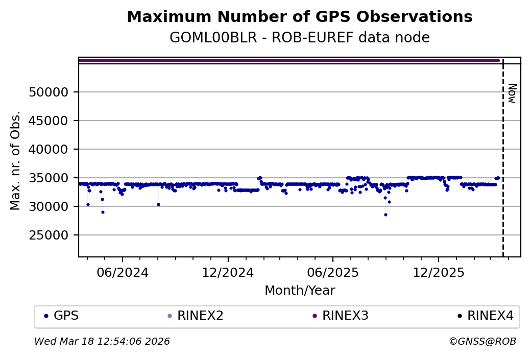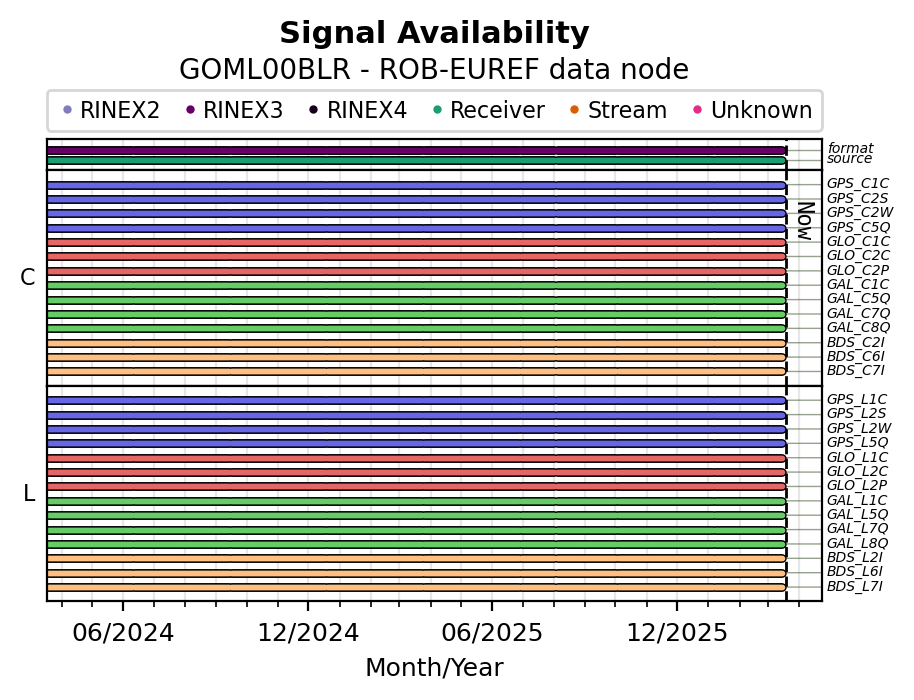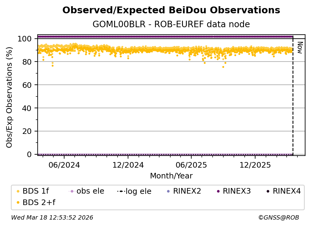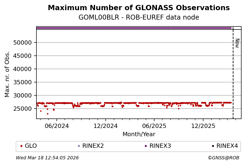 The plots below present the long-term tracking performance of the EPOS-GNSS station GOML00BLR based on the daily RINEX data available from the ROB-EUREF EPOS-GNSS data node. The data quality metrics have been computed at the data node using the G-Nut/Anubis software.