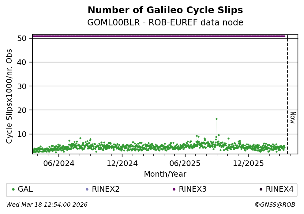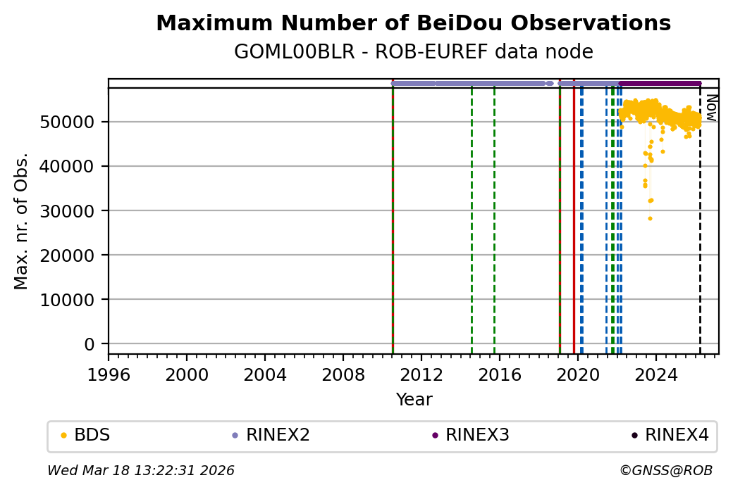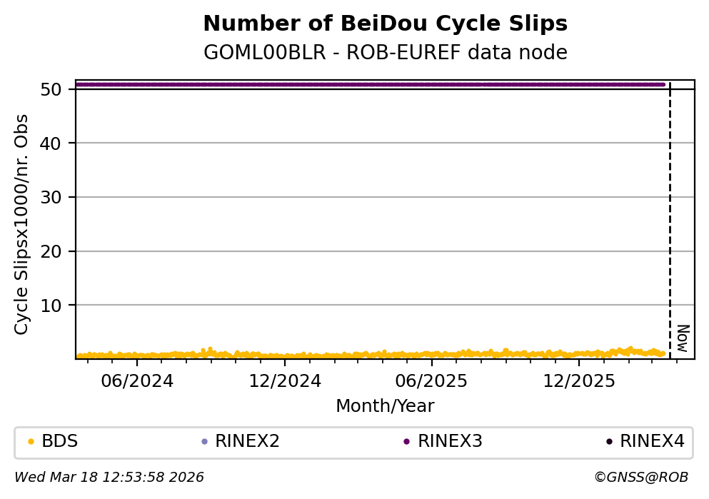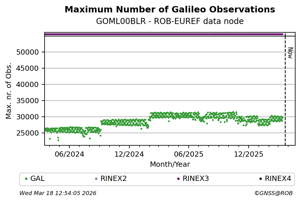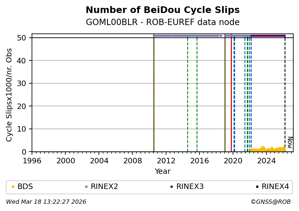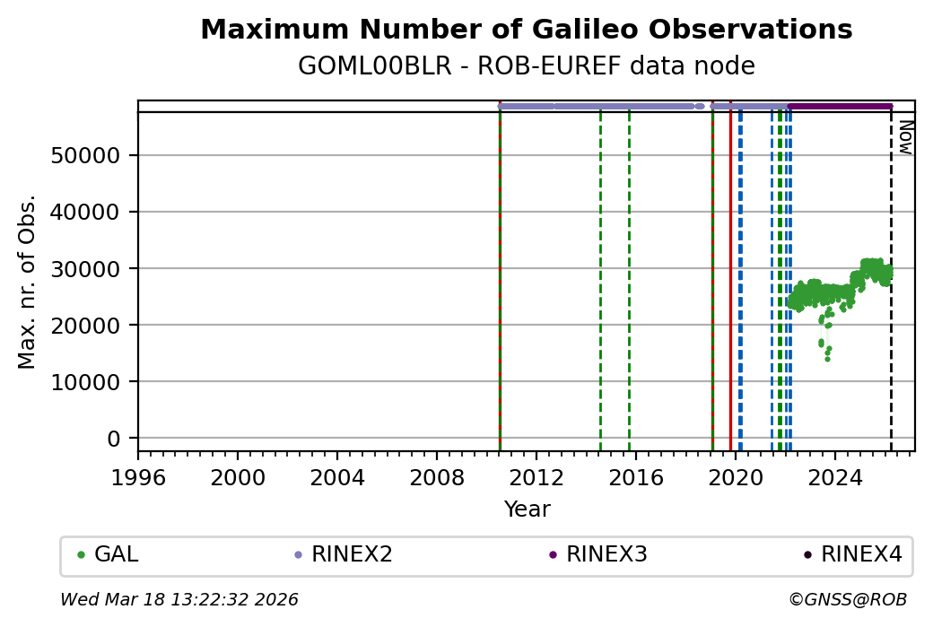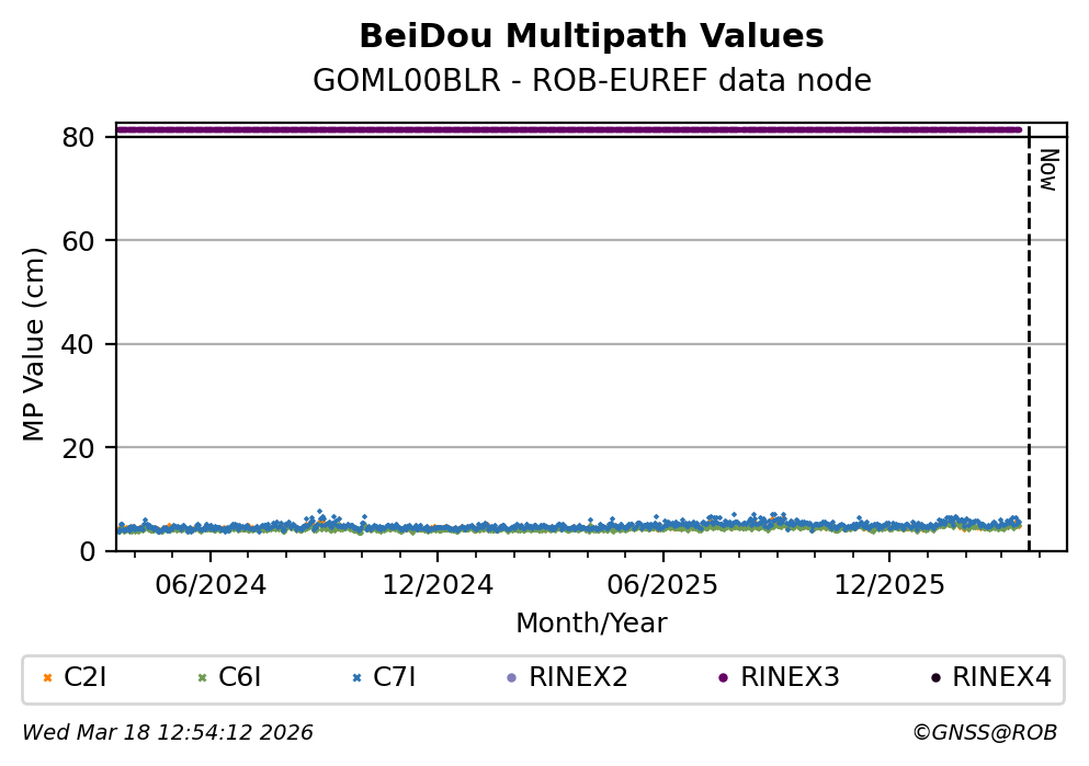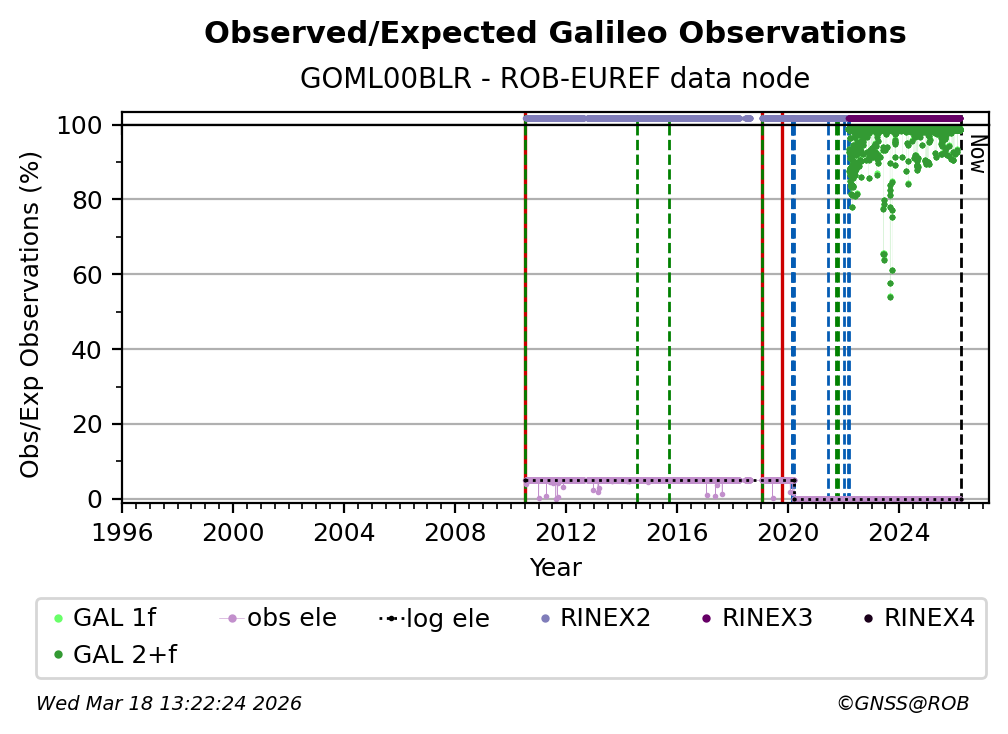 The plots below present the long-term tracking performance of the EPOS-GNSS station GOML00BLR based on the daily RINEX data available from the ROB-EUREF EPOS-GNSS data node. The data quality metrics have been computed at the data node using the G-Nut/Anubis software.