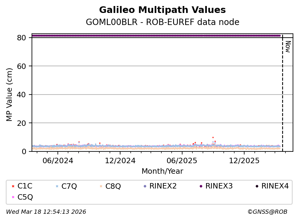 These plots display the daily mean of code multipath per frequency band and satellite constellation. Code multipath statistics are calculated for all pseudorange codes of all GNSS satellites providing dual-frequency carrier-phase observations. The code multipath characterizes the quality of the observed signal and the site environment.