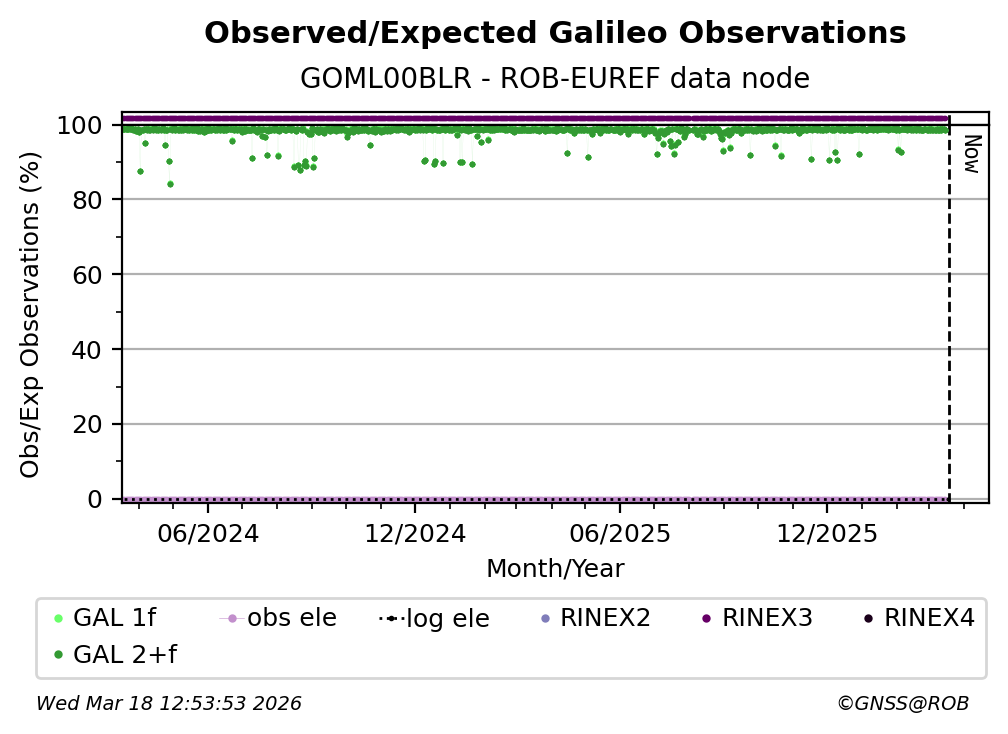 The percentage corresponds, for each constellation tracked by the station, to the ratio of the number of observations in the daily RINEX file with respect to the number of expected observations: