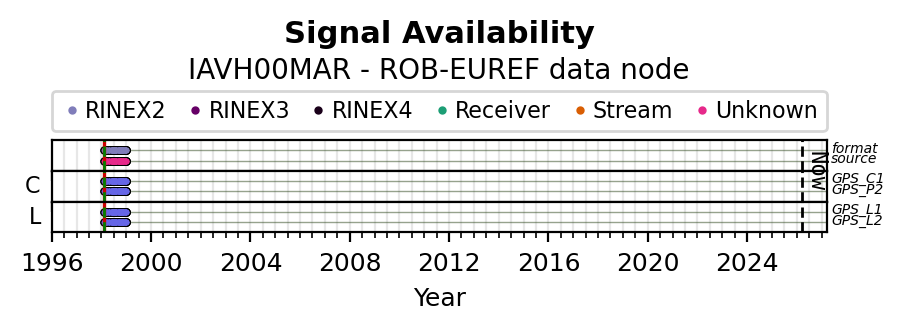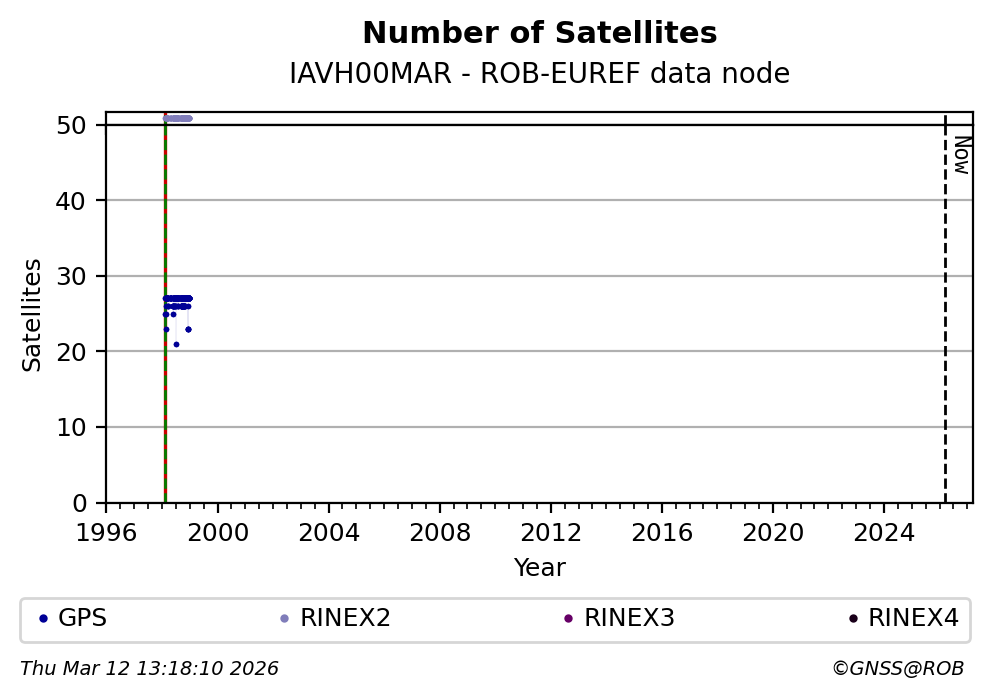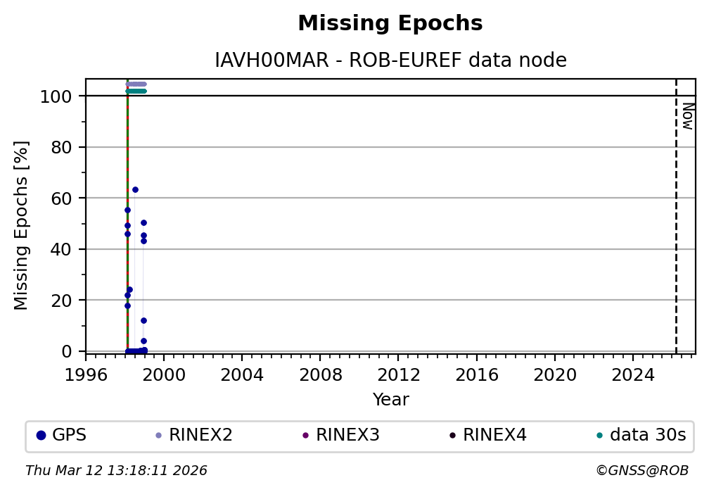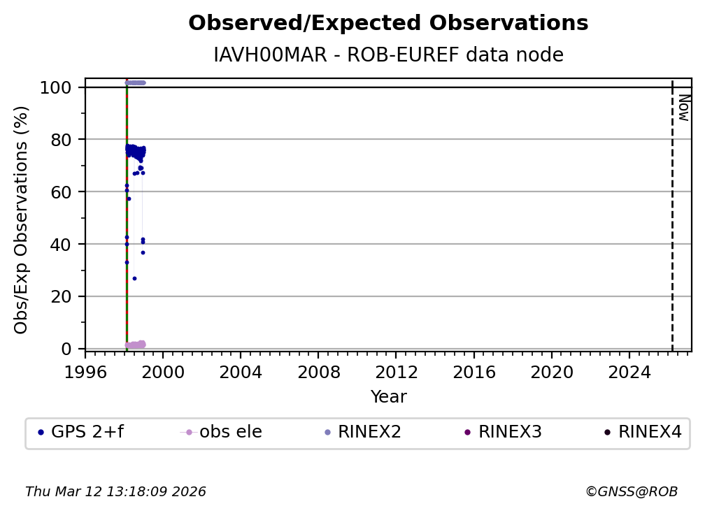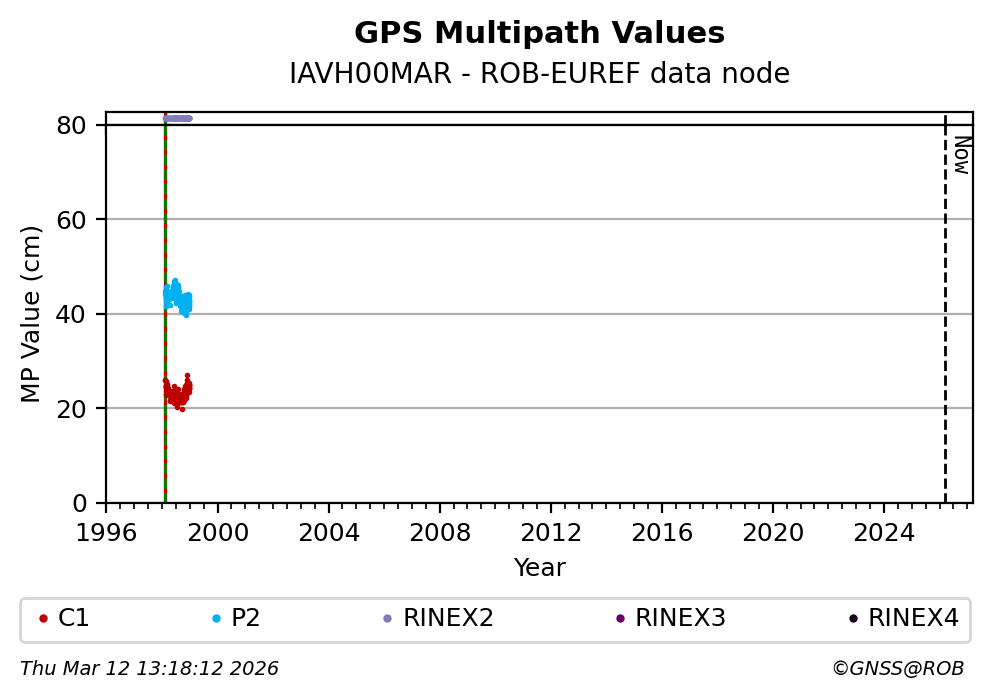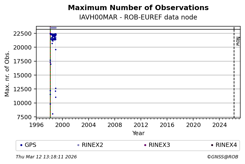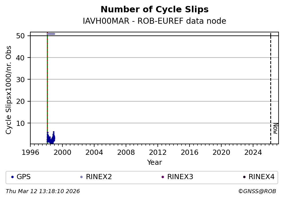 The plots below present the long-term tracking performance of the EPOS-GNSS station IAVH00MAR based on the daily RINEX data available from the ROB-EUREF EPOS-GNSS data node. The data quality metrics have been computed at the data node using the G-Nut/Anubis software. Input files are the daily RINEX (V2 or V3) observation files available from ROB-EUREF EPOS-GNSS data node.