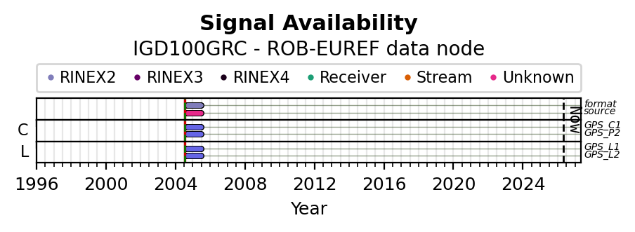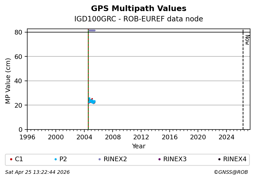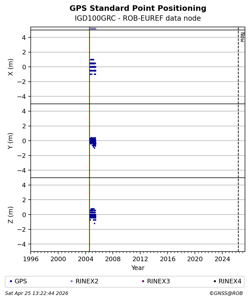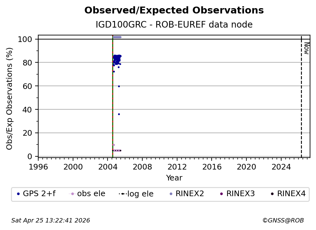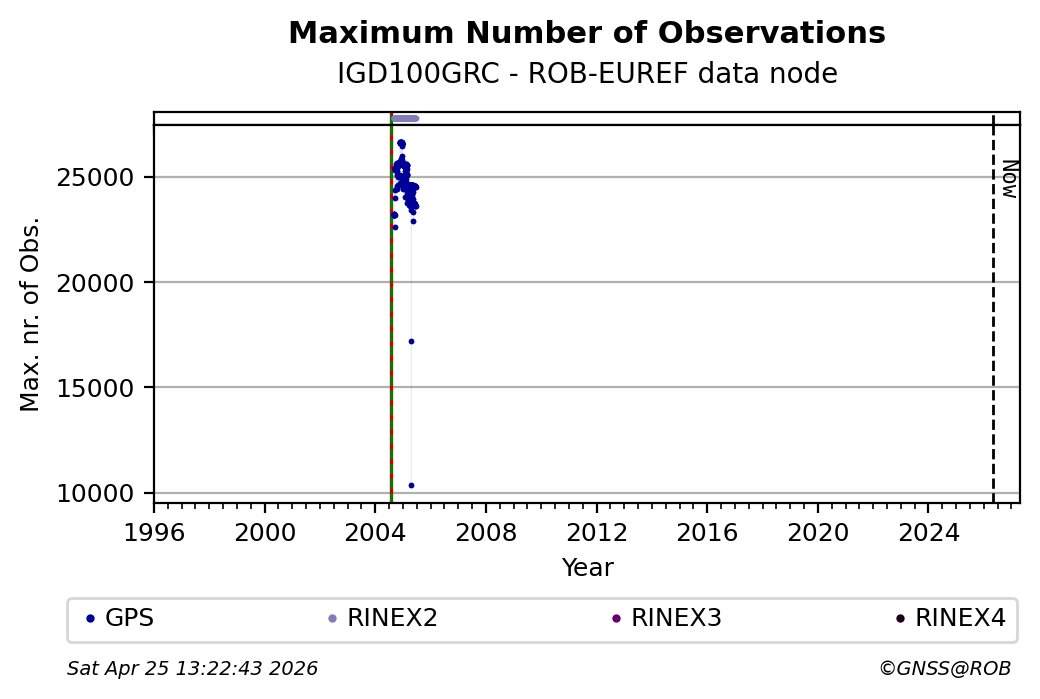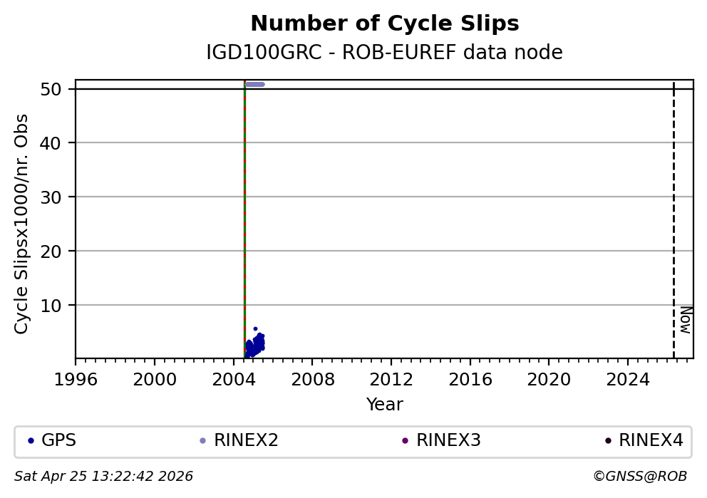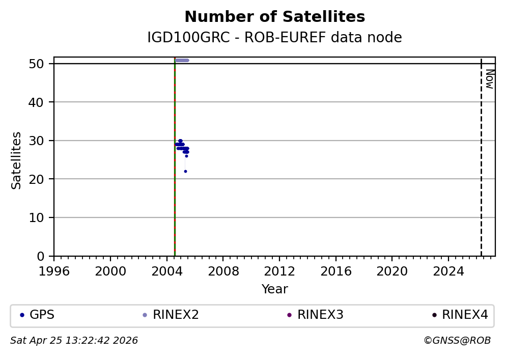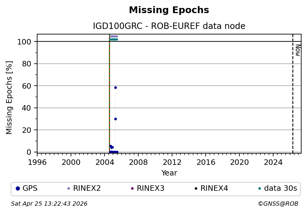 The plots below present the long-term tracking performance of the EPOS-GNSS station IGD100GRC based on the daily RINEX data available from the ROB-EUREF EPOS-GNSS data node. The data quality metrics have been computed at the data node using the G-Nut/Anubis software. Input files are the daily RINEX (V2 or V3) observation files available from ROB-EUREF EPOS-GNSS data node.