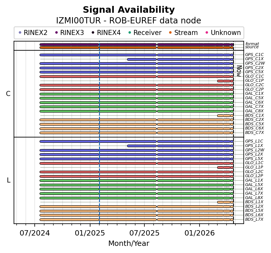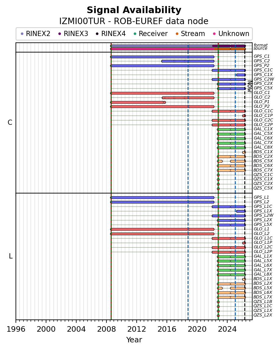 Red vertical lines, green and blue vertical dotted lines indicate respectively a change of antenna, receiver or receiver configuration (including firmware) as indicated by the station manager in the station site log available from the M3G GNSS Metadata Catalog. The purple points in the top of the plot indicate the daily RINEX data availability at the data node.