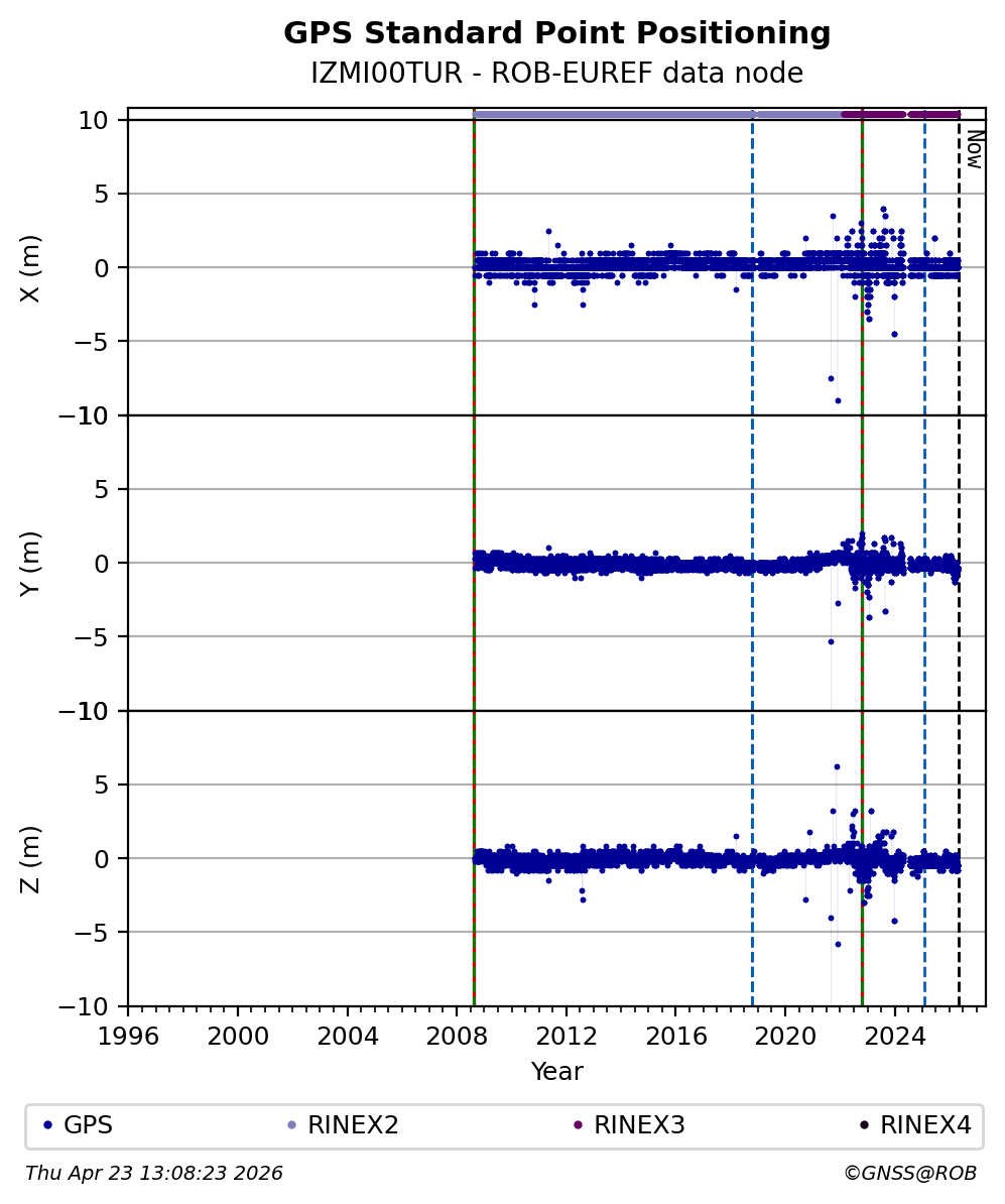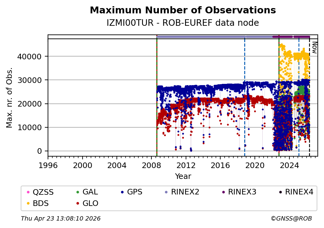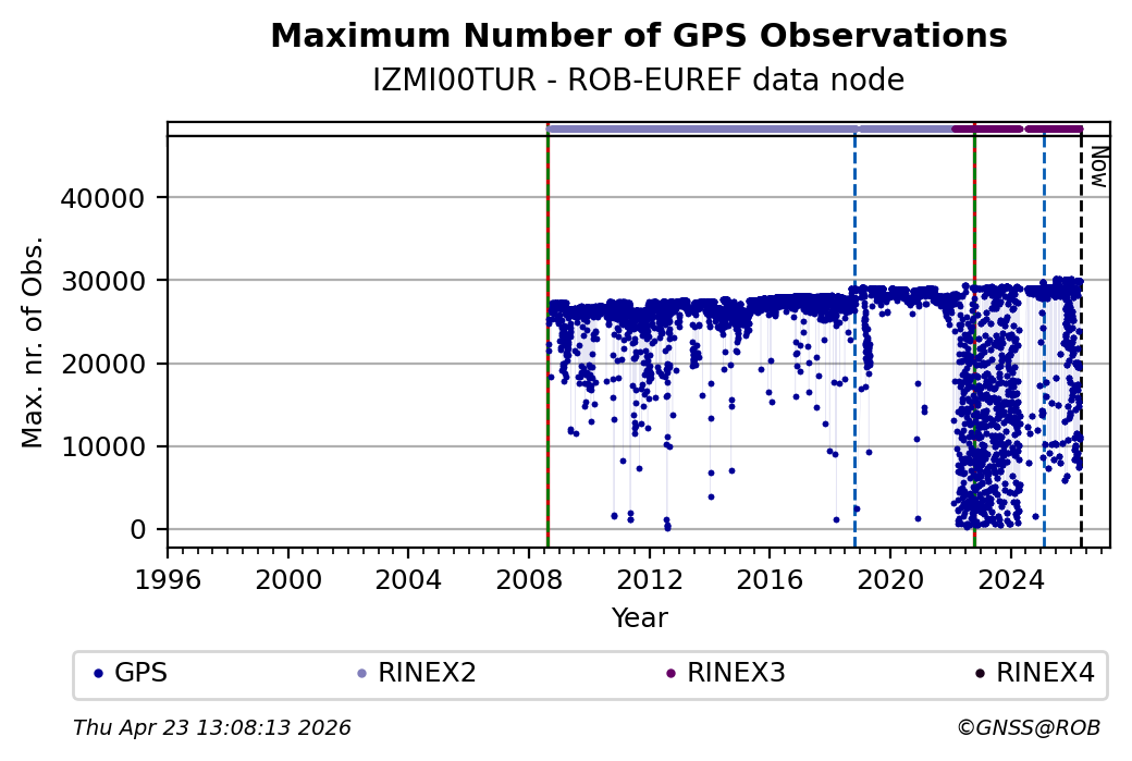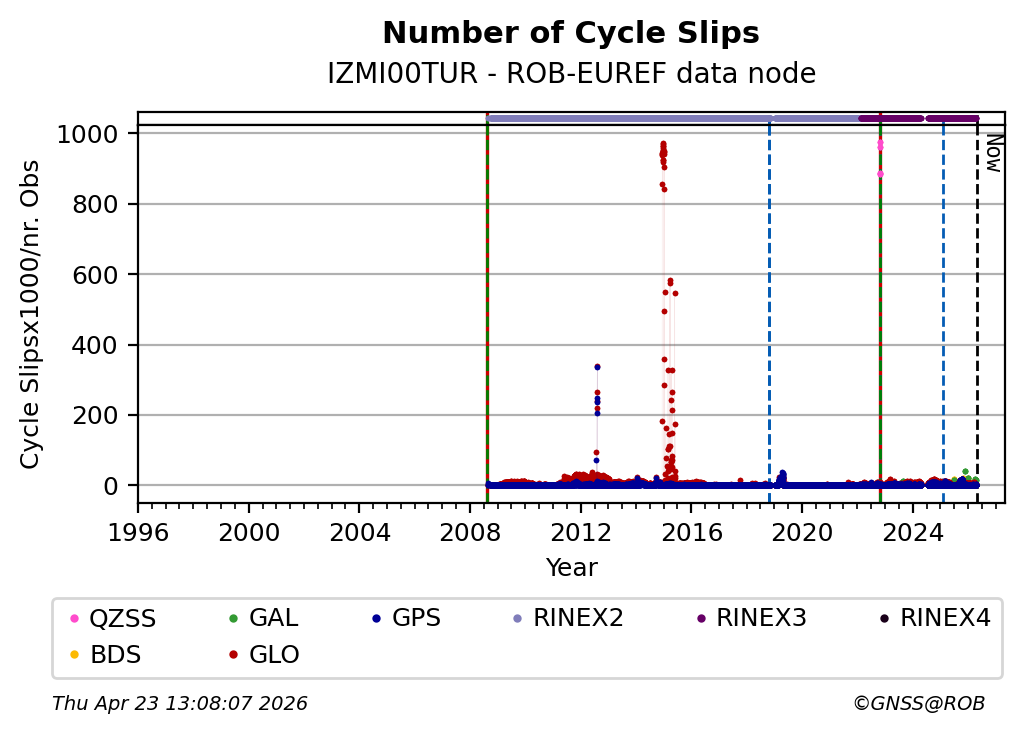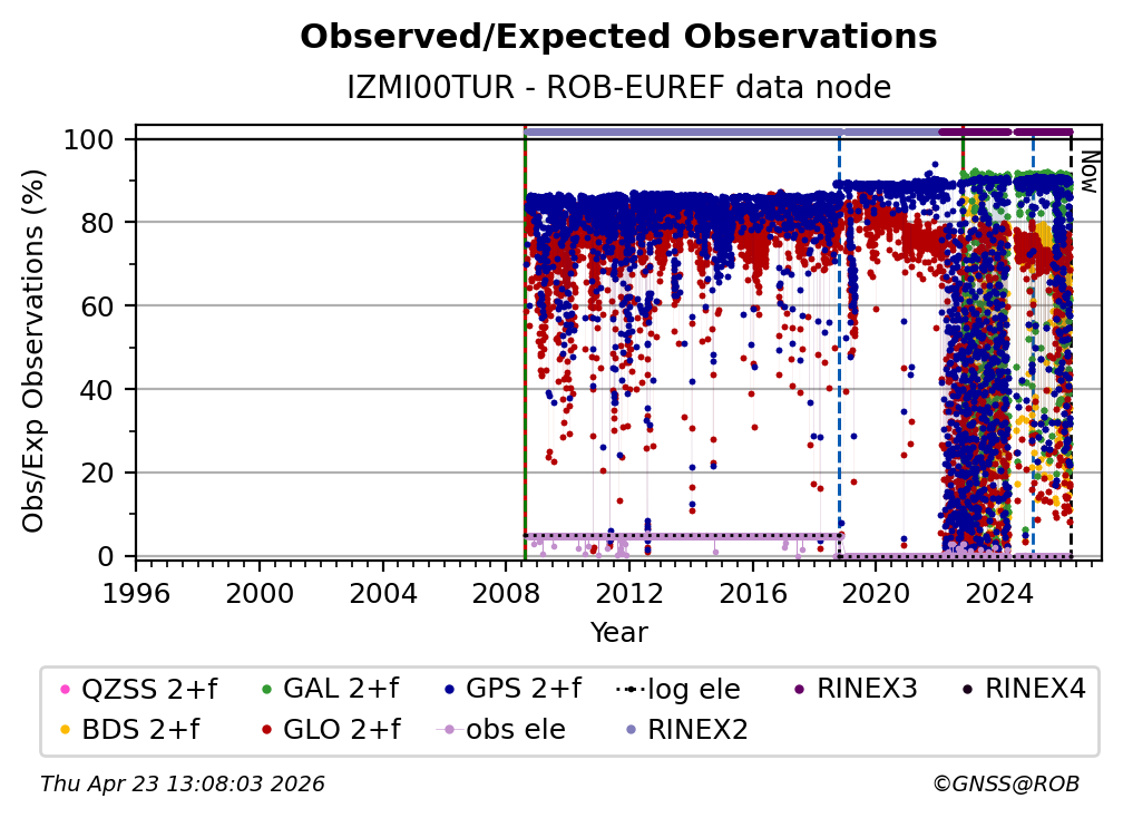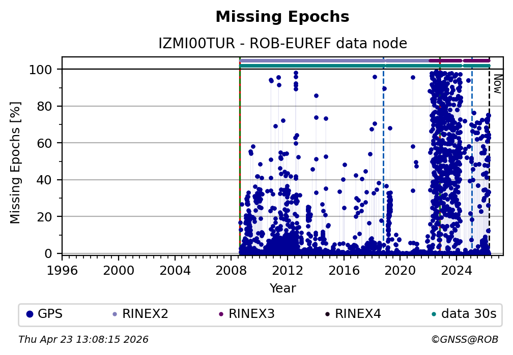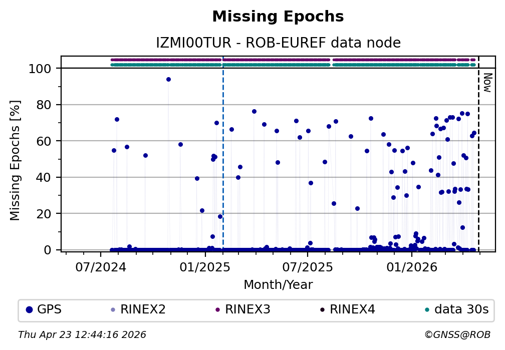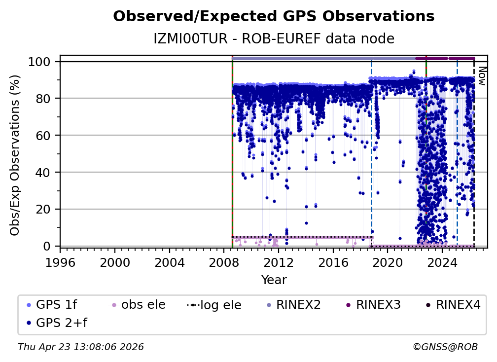 The plots below present the long-term tracking performance of the EPOS-GNSS station IZMI00TUR based on the daily RINEX data available from the ROB-EUREF EPOS-GNSS data node. The data quality metrics have been computed at the data node using the G-Nut/Anubis software.