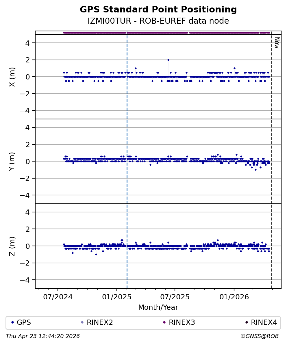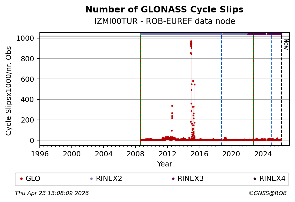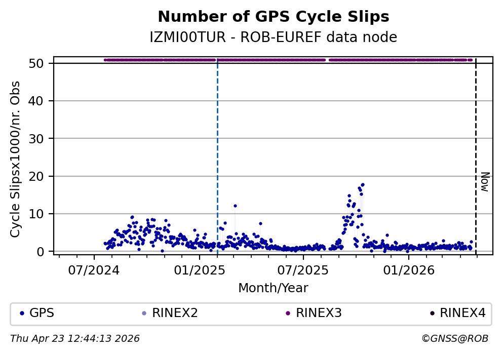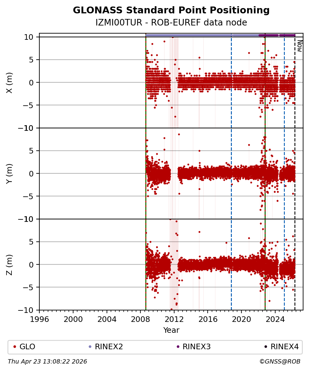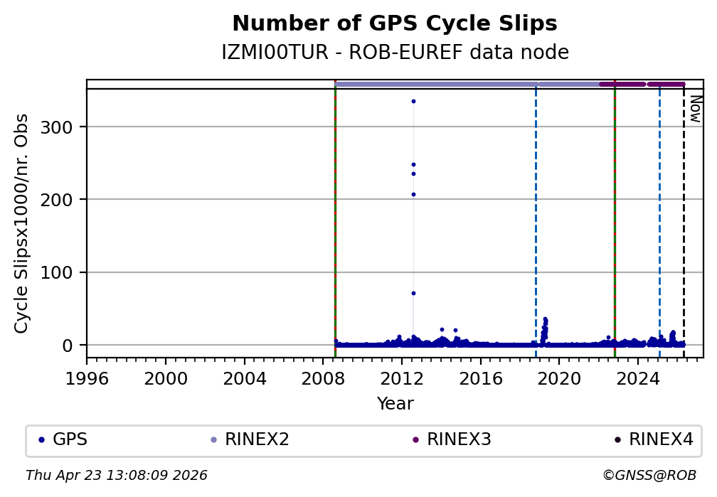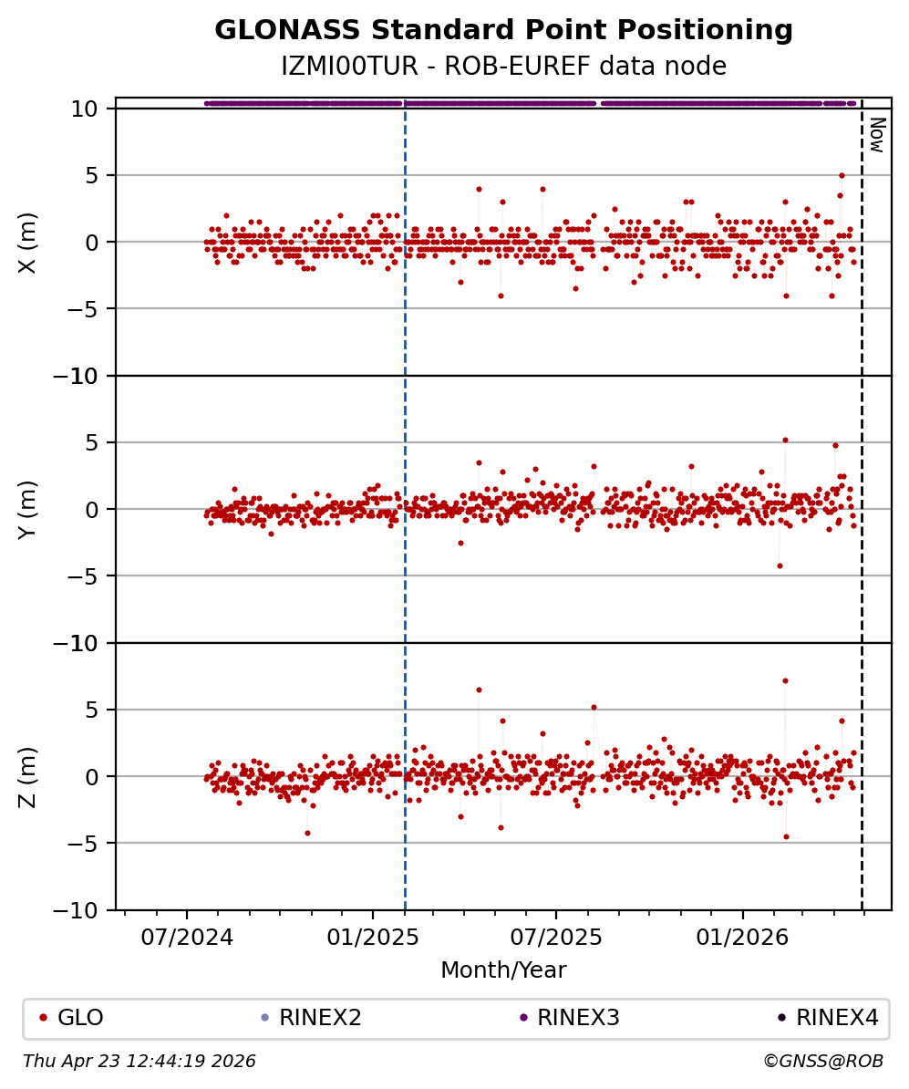 The plots below present the long-term tracking performance of the EPOS-GNSS station IZMI00TUR based on the daily RINEX data available from the ROB-EUREF EPOS-GNSS data node. The data quality metrics have been computed at the data node using the G-Nut/Anubis software.