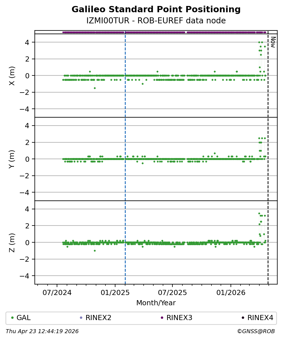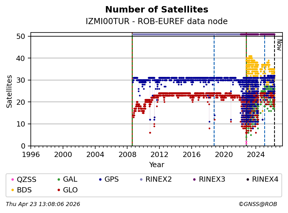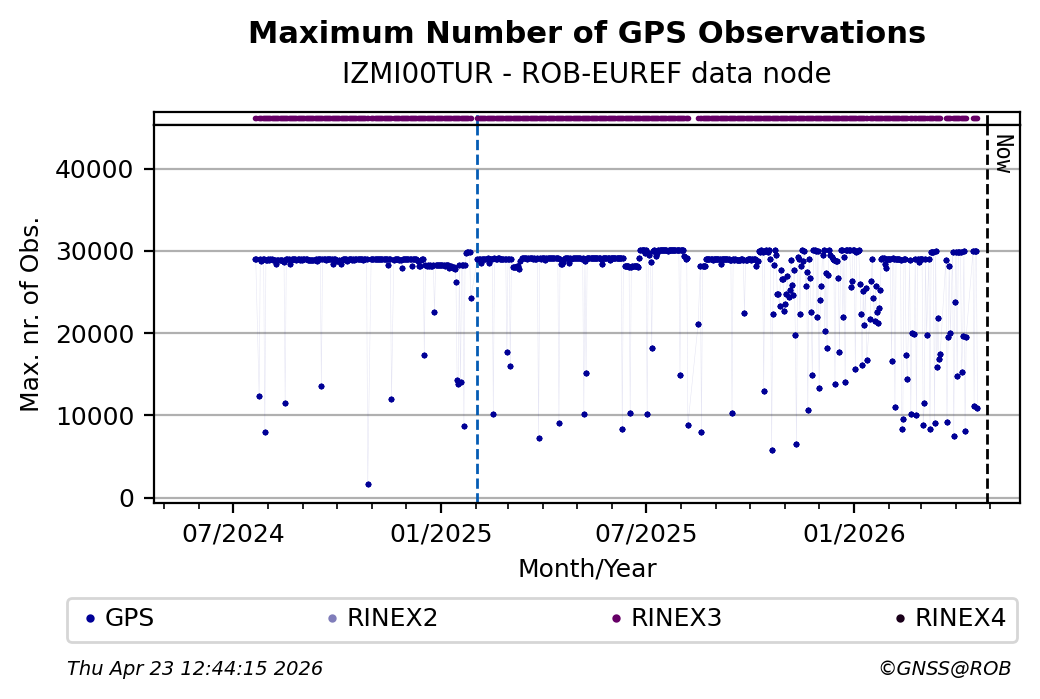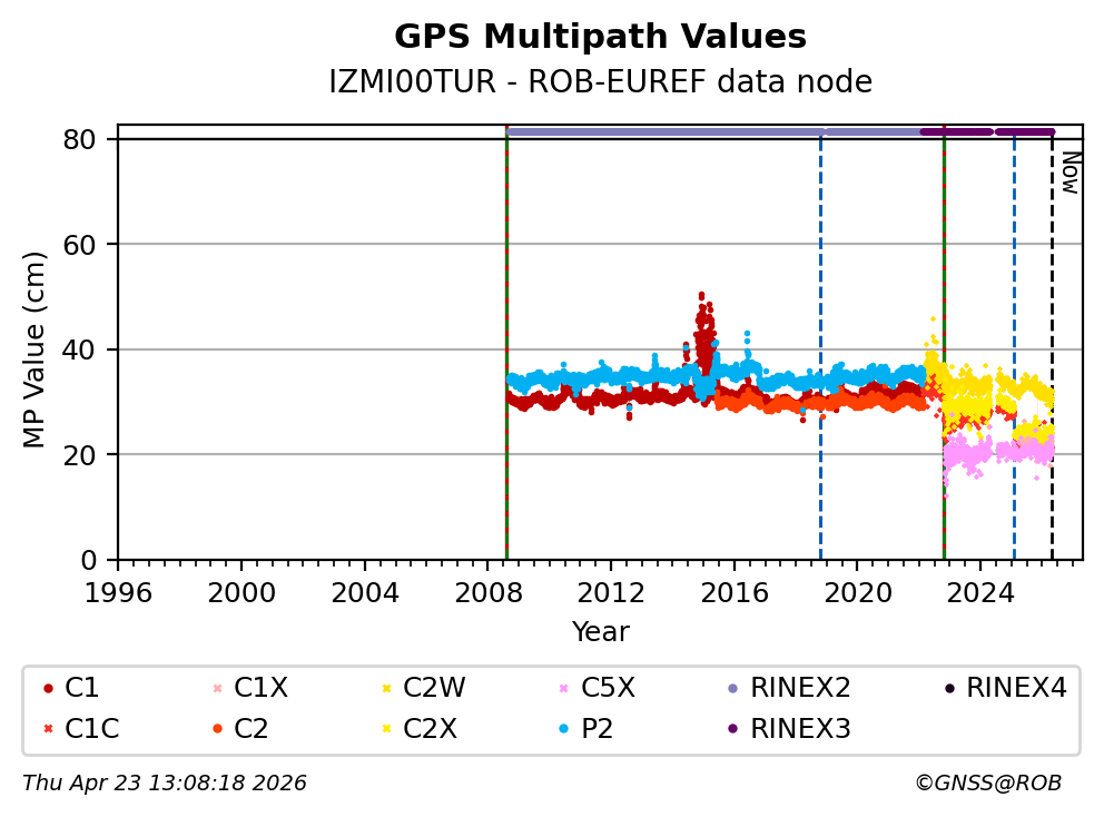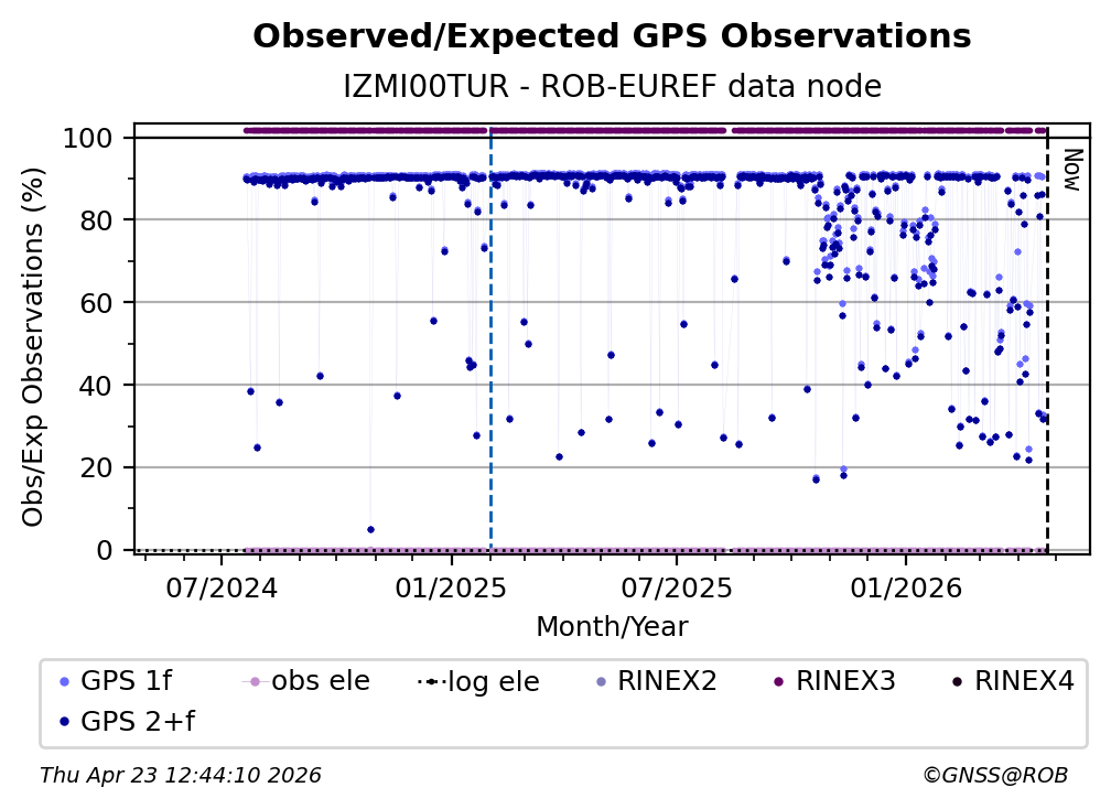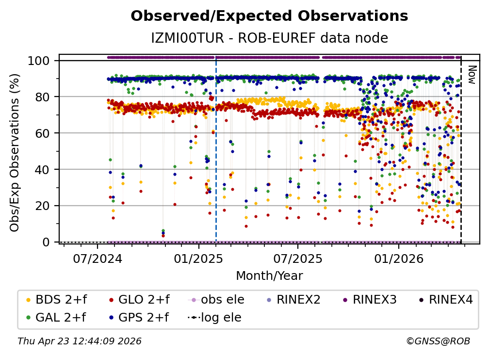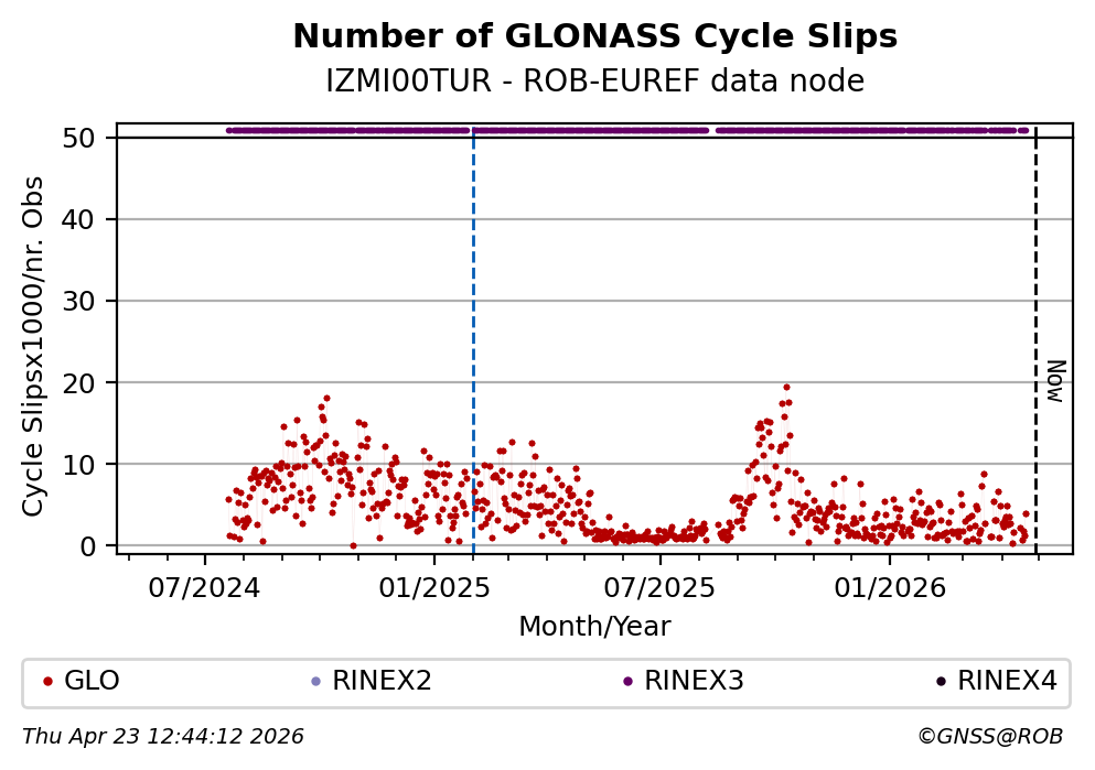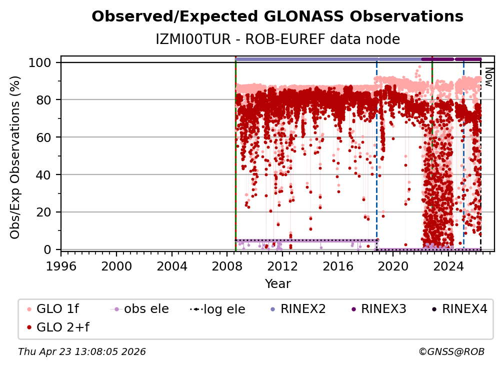 The plots below present the long-term tracking performance of the EPOS-GNSS station IZMI00TUR based on the daily RINEX data available from the ROB-EUREF EPOS-GNSS data node. The data quality metrics have been computed at the data node using the G-Nut/Anubis software.