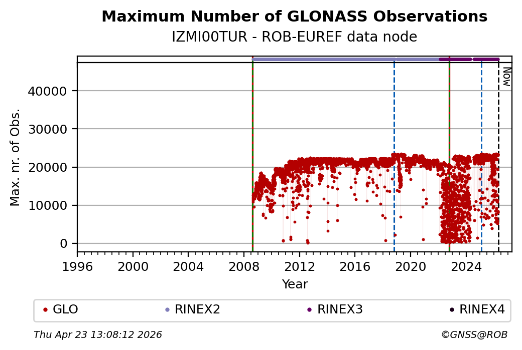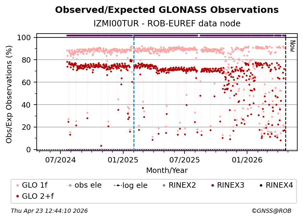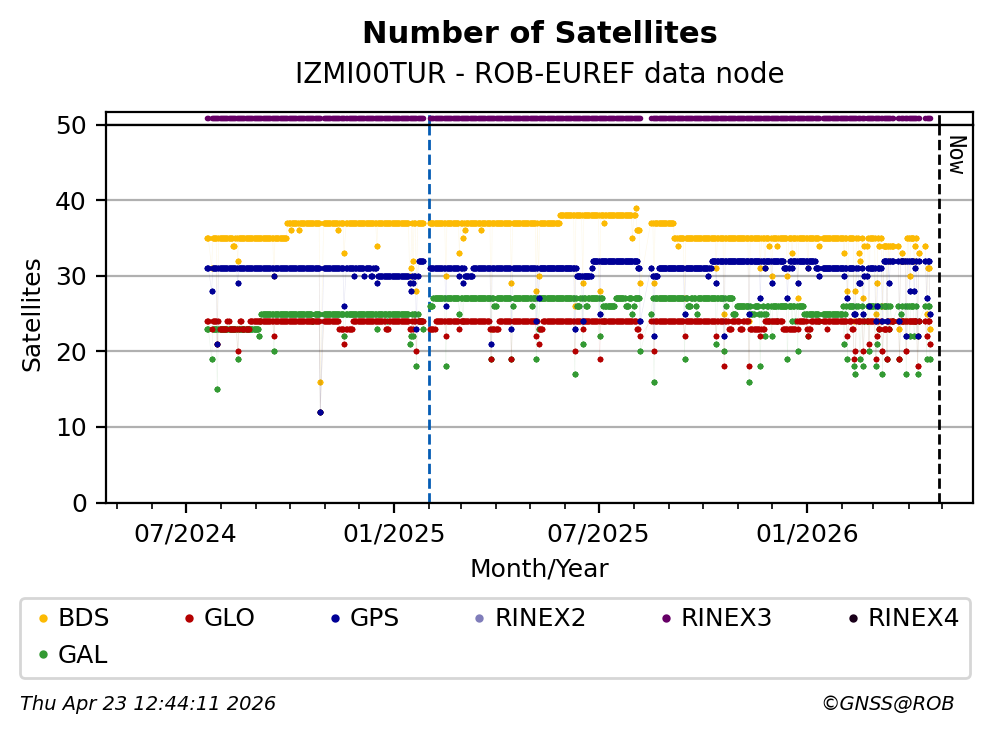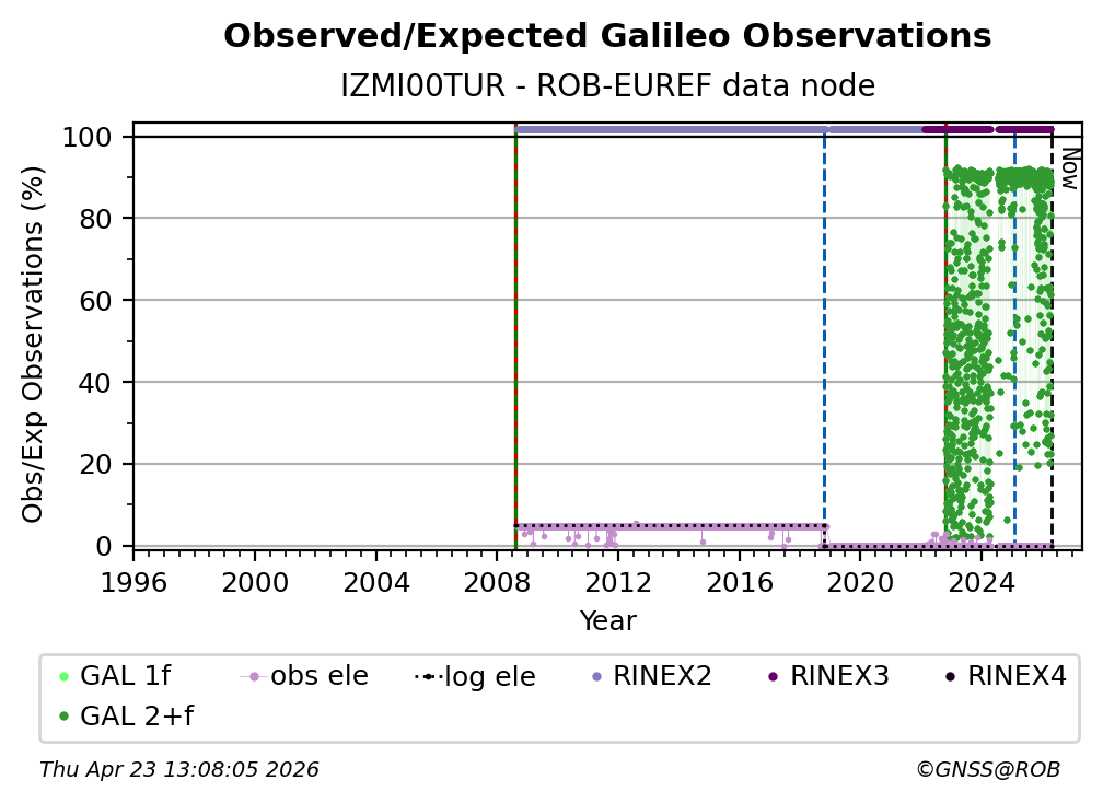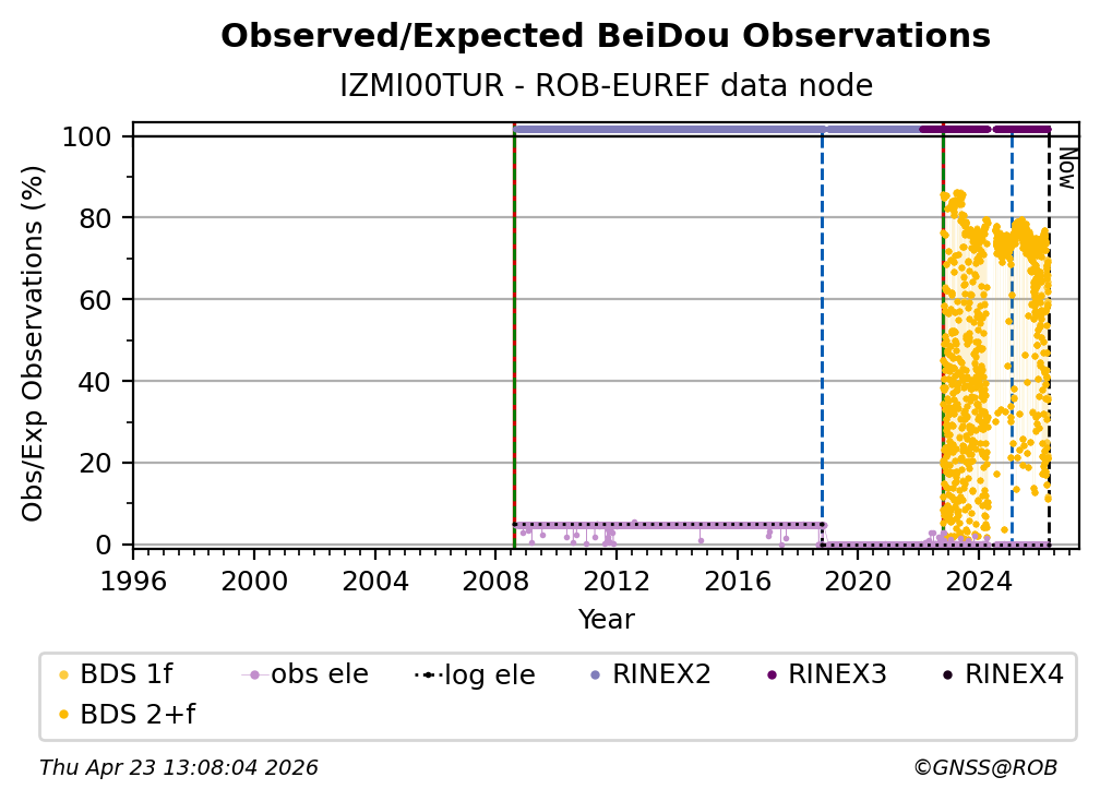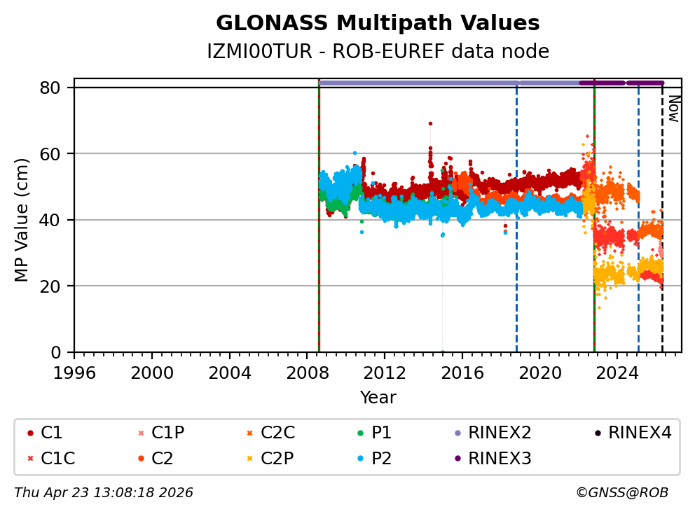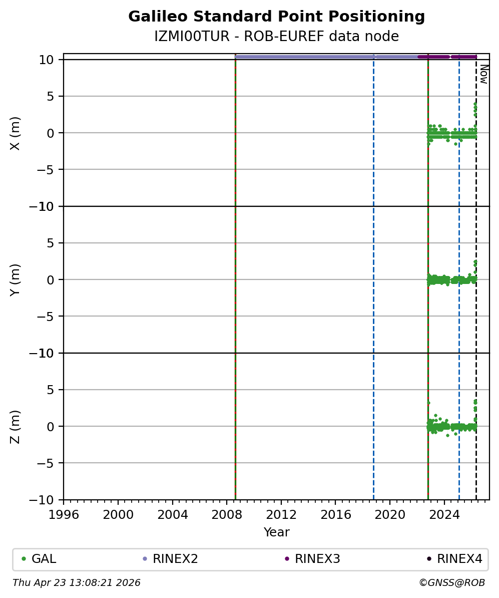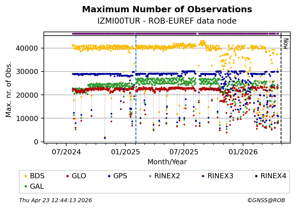 The plots below present the long-term tracking performance of the EPOS-GNSS station IZMI00TUR based on the daily RINEX data available from the ROB-EUREF EPOS-GNSS data node. The data quality metrics have been computed at the data node using the G-Nut/Anubis software.