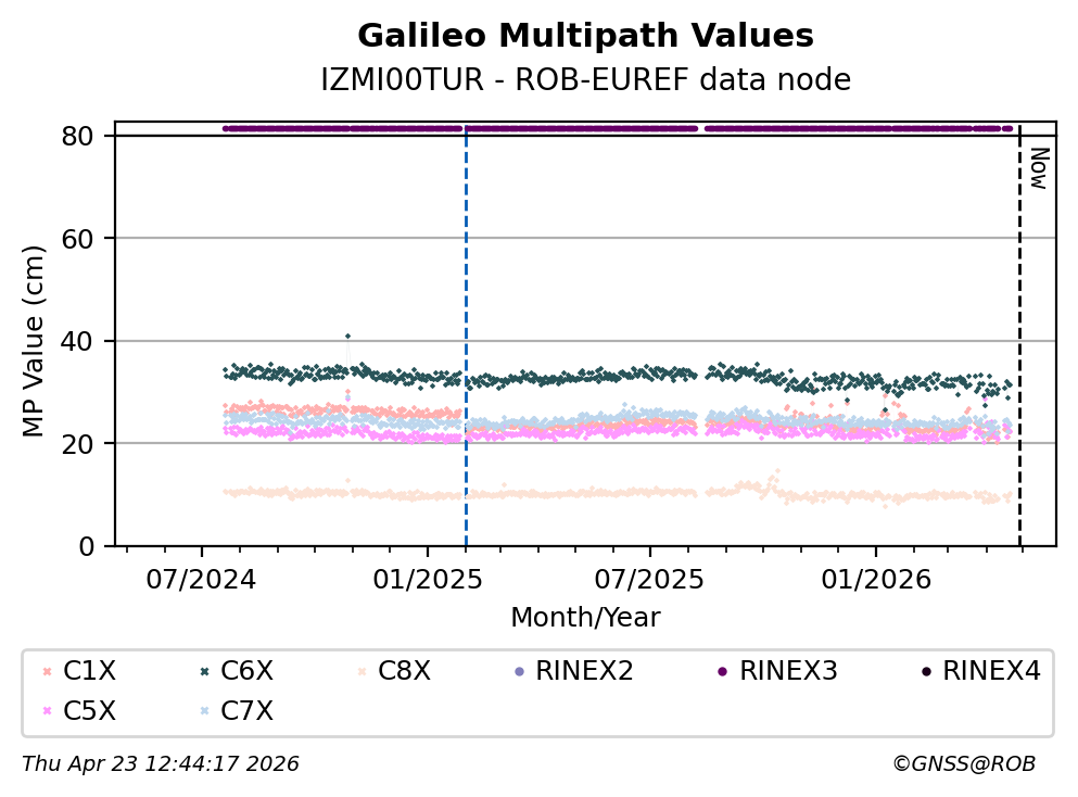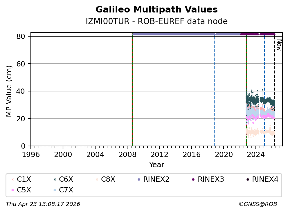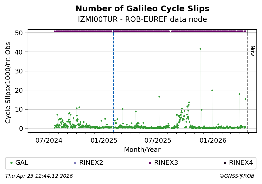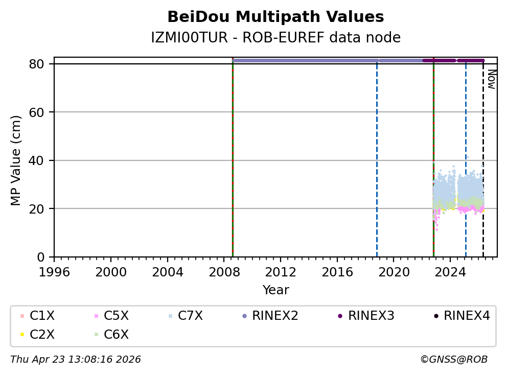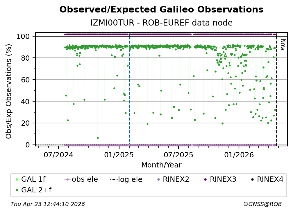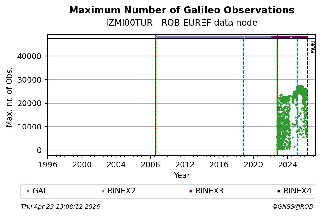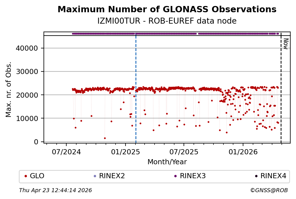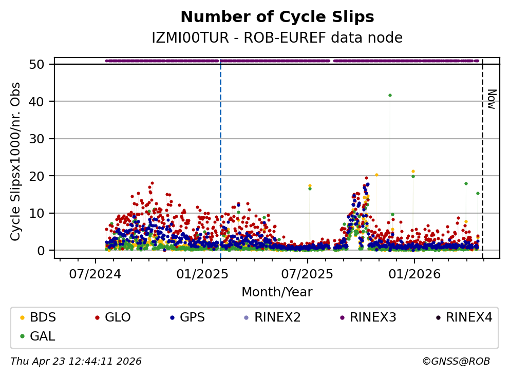The plots below present the long-term tracking performance of the EPOS-GNSS station IZMI00TUR based on the daily RINEX data available from the ROB-EUREF EPOS-GNSS data node. The data quality metrics have been computed at the data node using the G-Nut/Anubis software.
