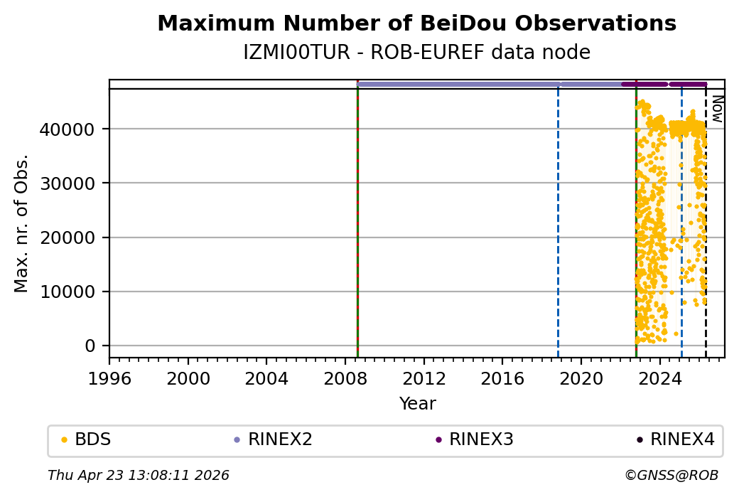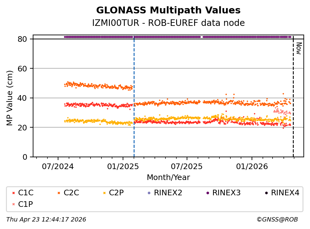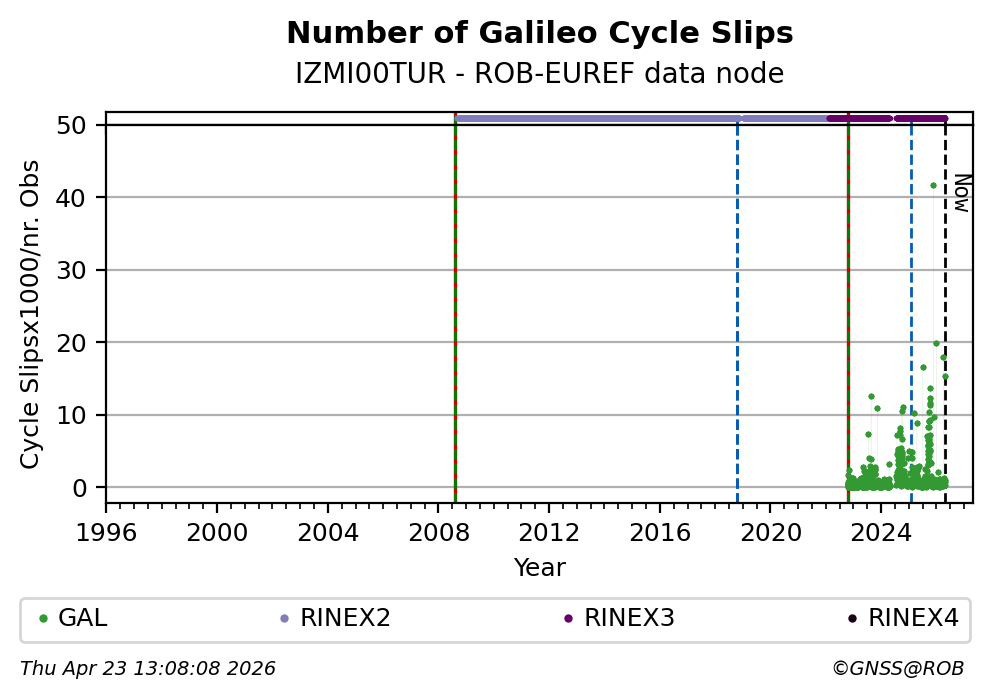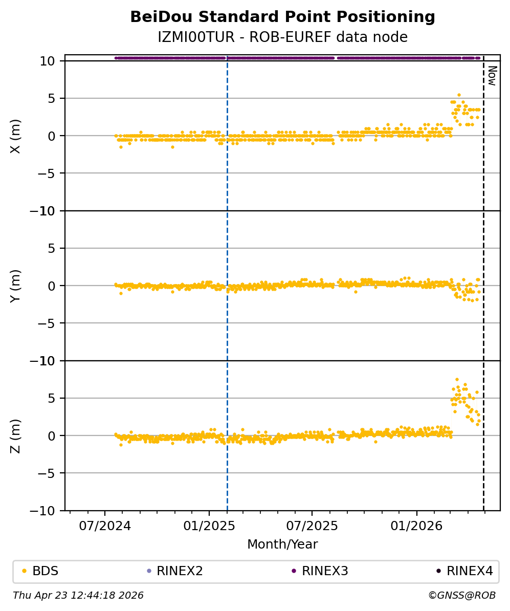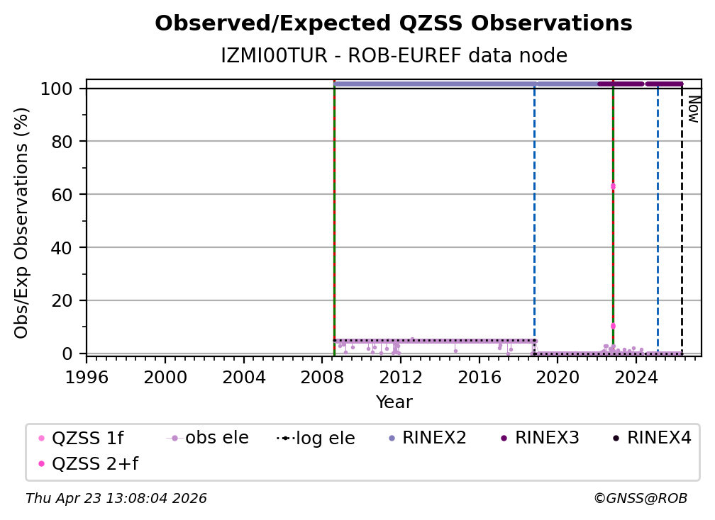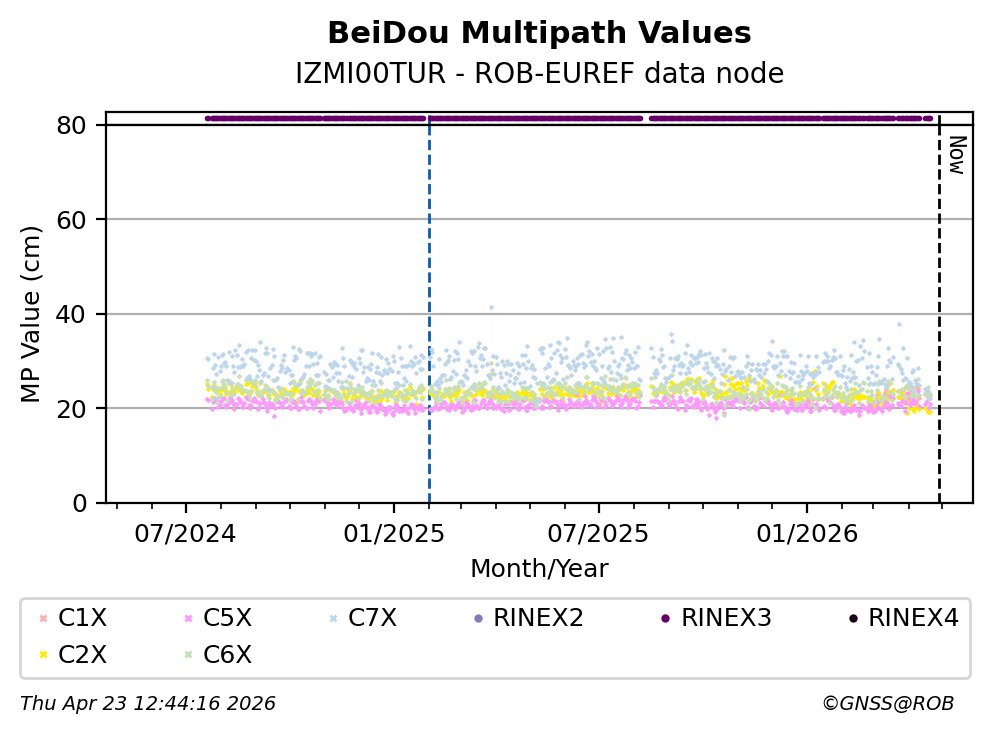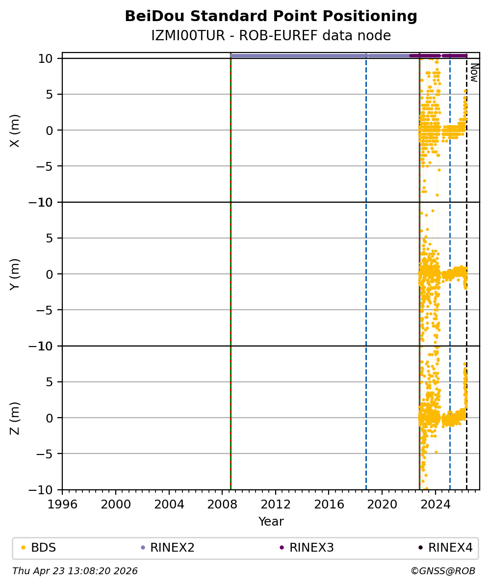 The plots below present the long-term tracking performance of the EPOS-GNSS station IZMI00TUR based on the daily RINEX data available from the ROB-EUREF EPOS-GNSS data node. The data quality metrics have been computed at the data node using the G-Nut/Anubis software.