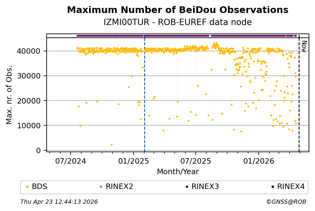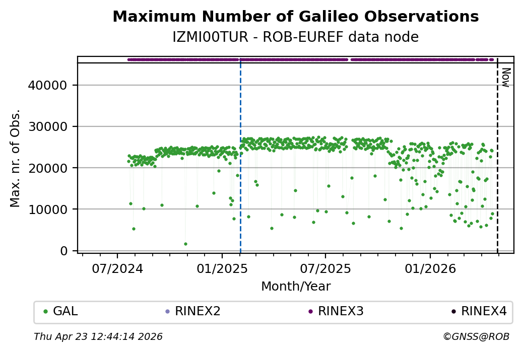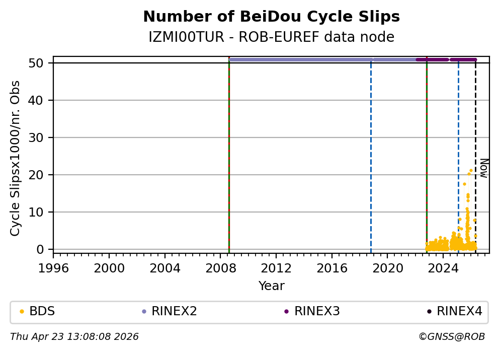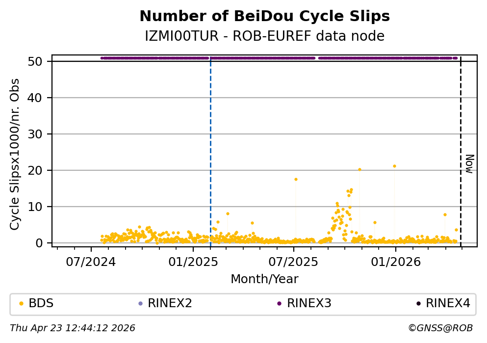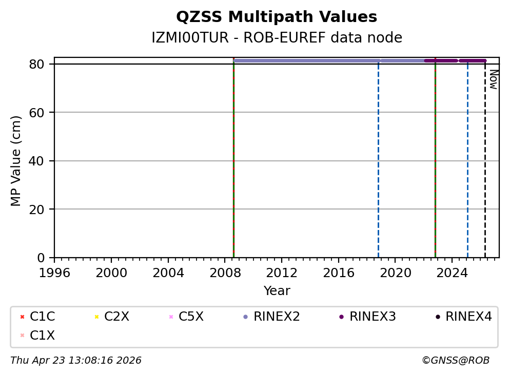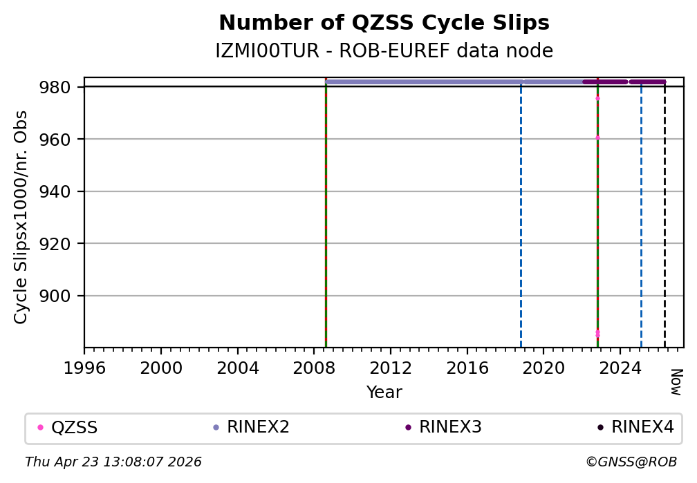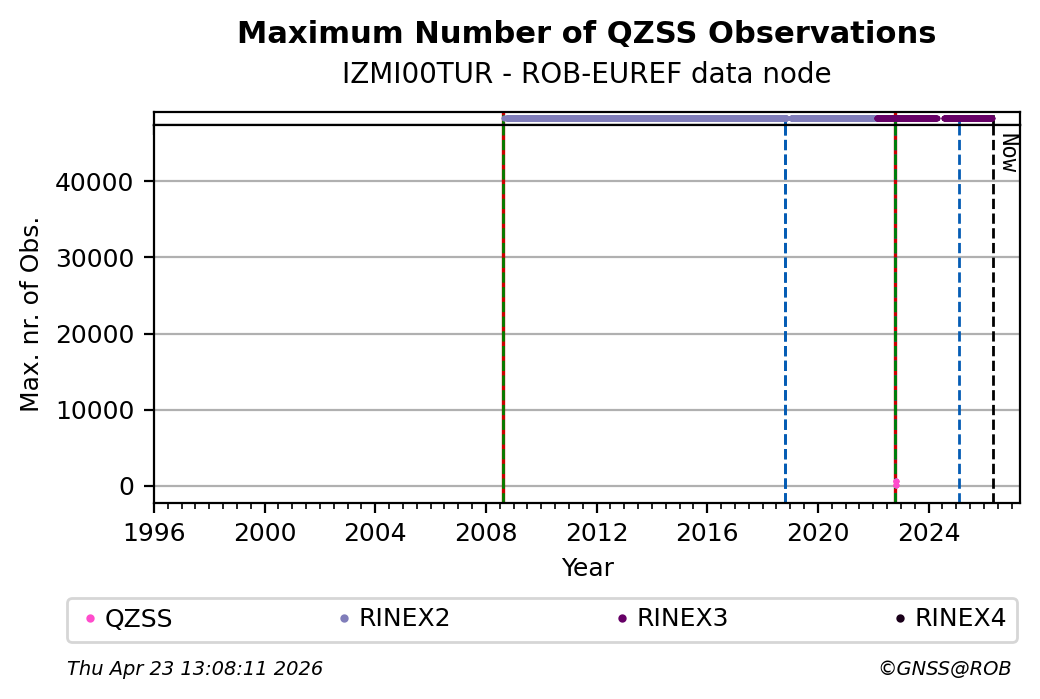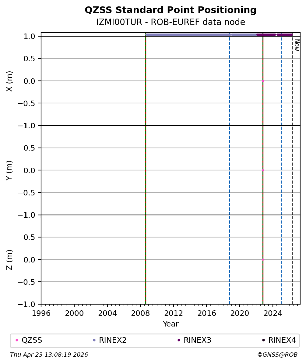 The plots below present the long-term tracking performance of the EPOS-GNSS station IZMI00TUR based on the daily RINEX data available from the ROB-EUREF EPOS-GNSS data node. The data quality metrics have been computed at the data node using the G-Nut/Anubis software.