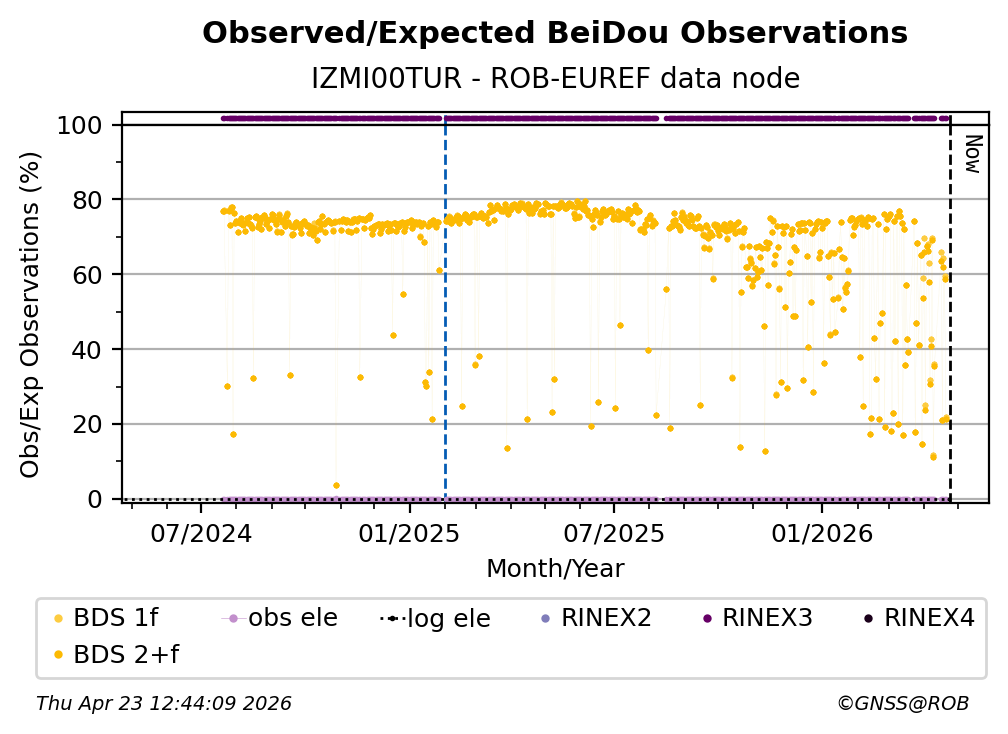 The percentage corresponds, for each constellation tracked by the station, to the ratio of the number of observations in the daily RINEX file with respect to the number of expected observations: