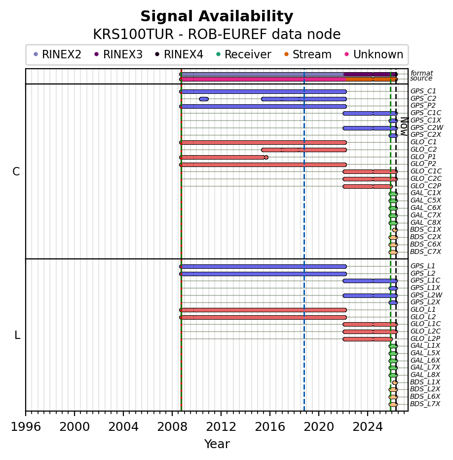 Red vertical lines, green and blue vertical dotted lines indicate respectively a change of antenna, receiver or receiver configuration (including firmware) as indicated by the station manager in the station site log available from the M3G GNSS Metadata Catalog. The purple points in the top of the plot indicate the daily RINEX data availability at the data node.