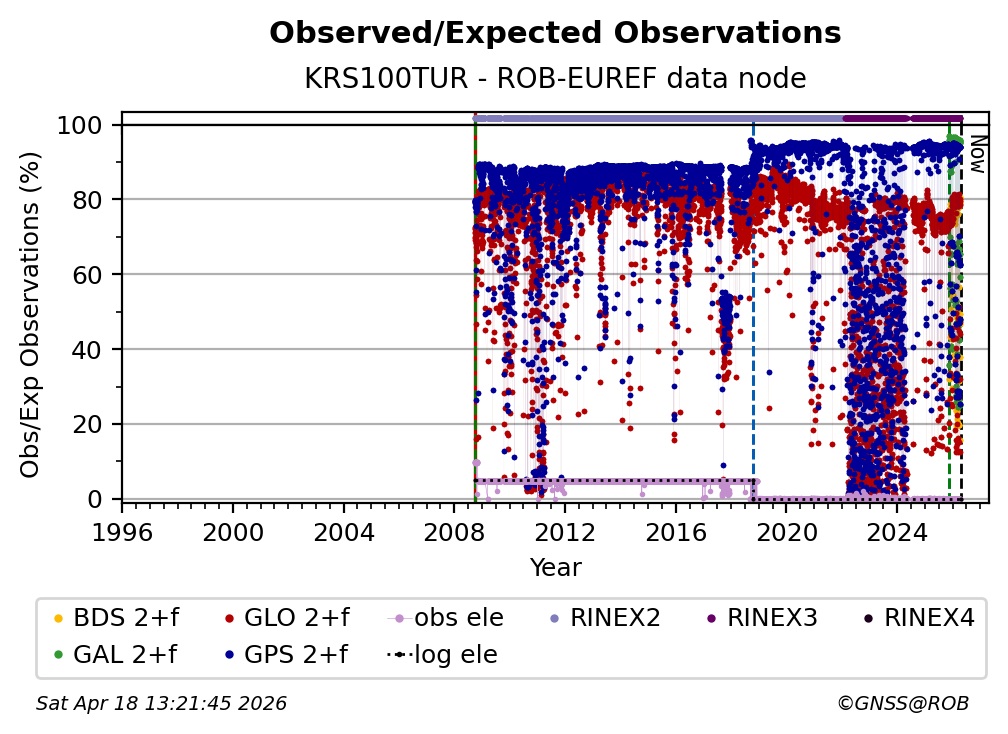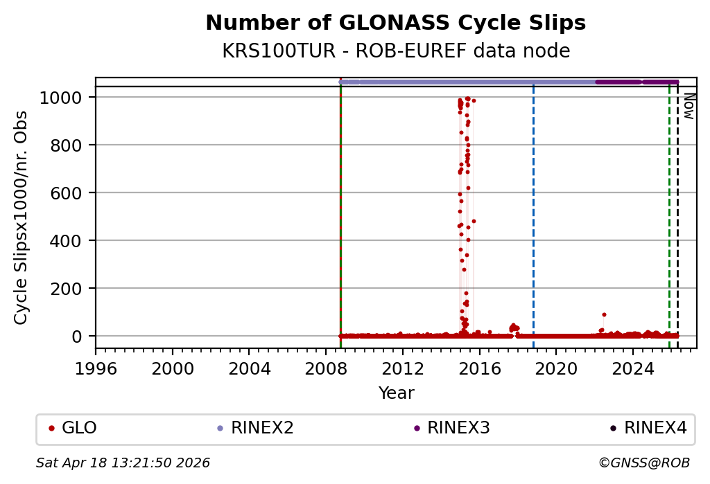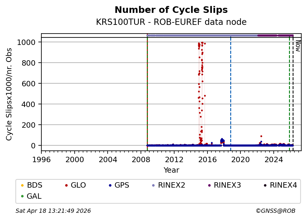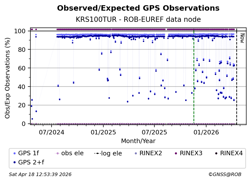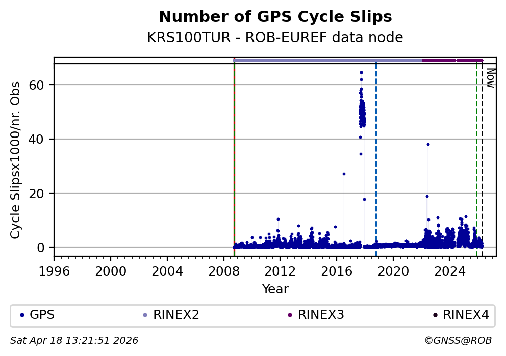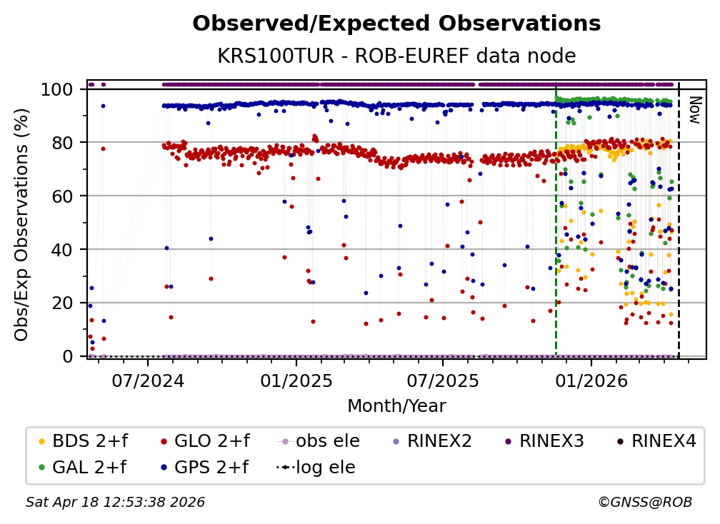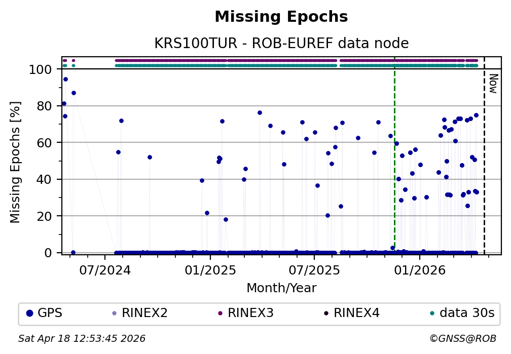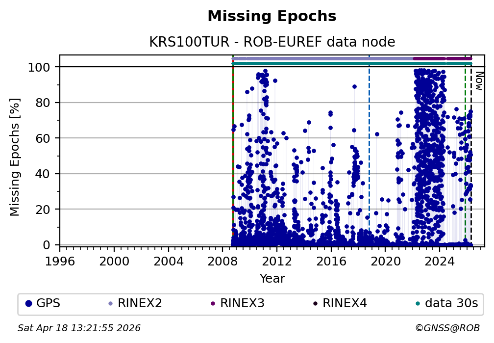 The plots below present the long-term tracking performance of the EPOS-GNSS station KRS100TUR based on the daily RINEX data available from the ROB-EUREF EPOS-GNSS data node. The data quality metrics have been computed at the data node using the G-Nut/Anubis software.