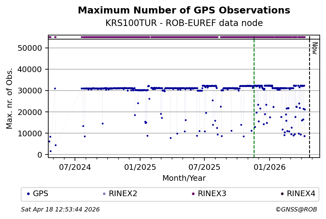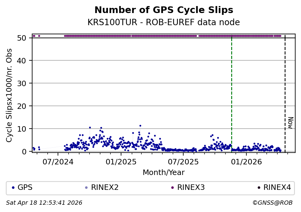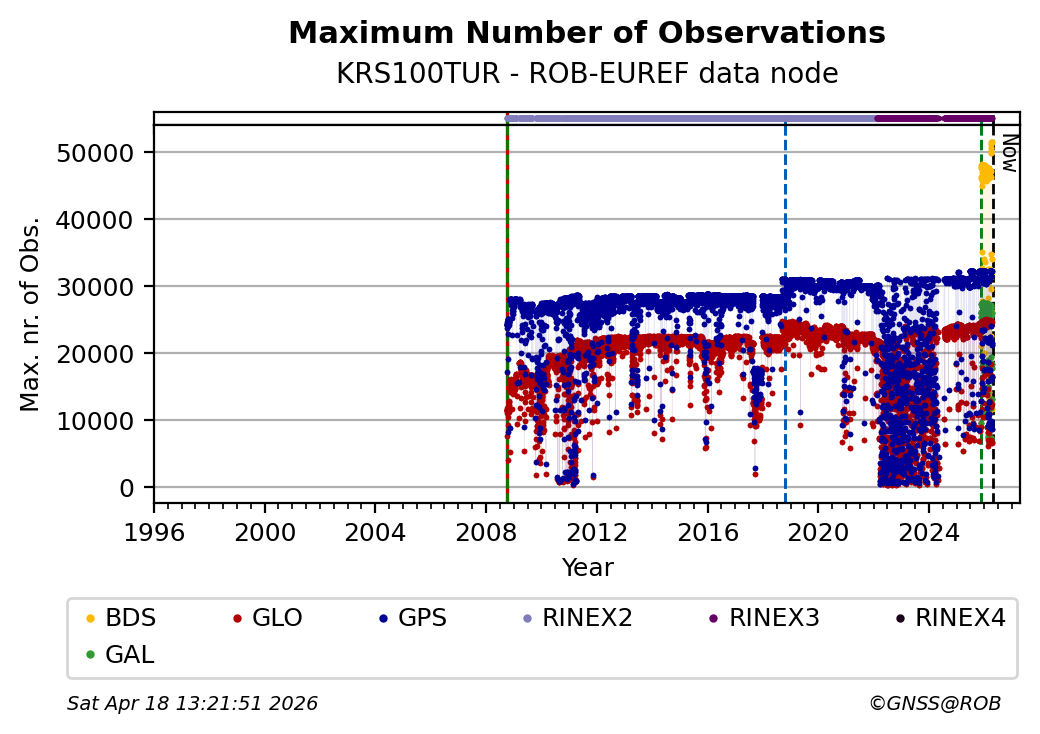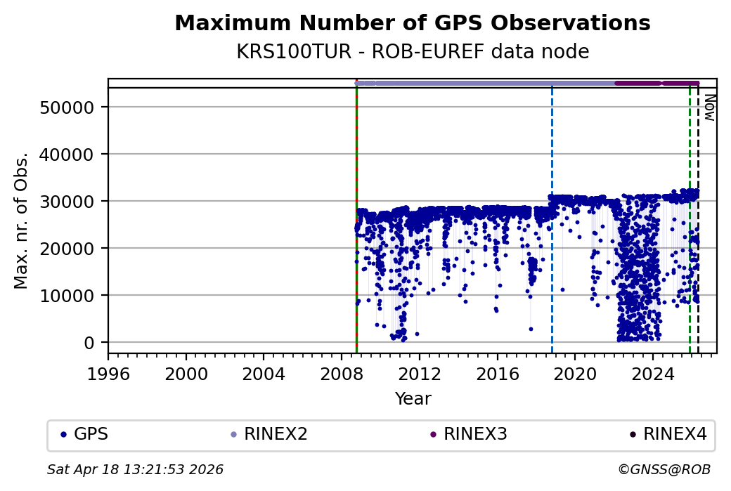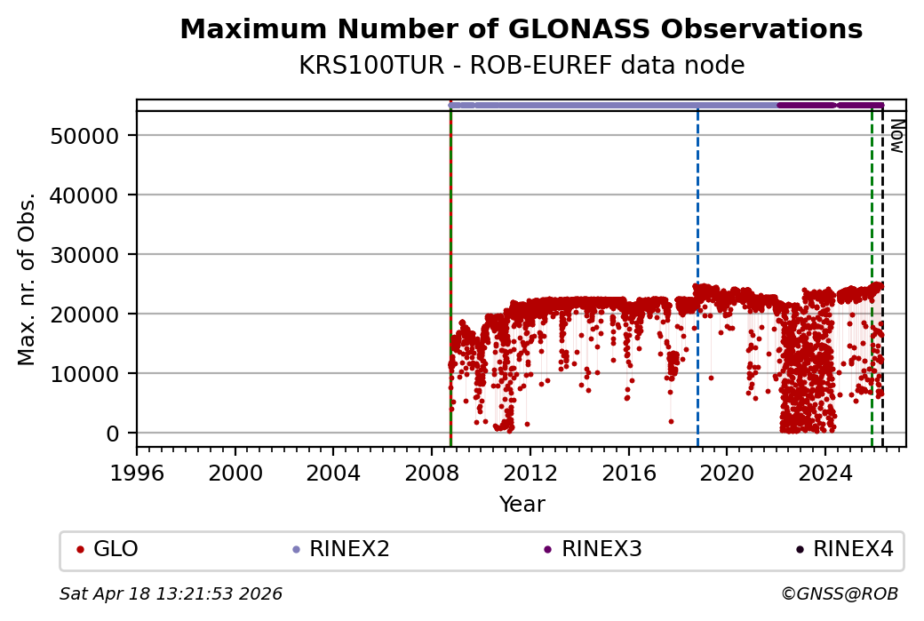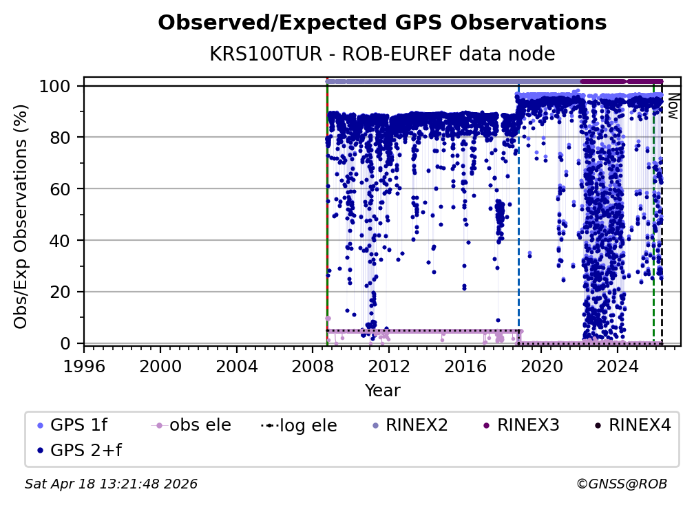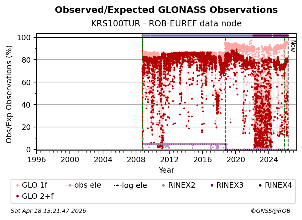 The plots below present the long-term tracking performance of the EPOS-GNSS station KRS100TUR based on the daily RINEX data available from the ROB-EUREF EPOS-GNSS data node. The data quality metrics have been computed at the data node using the G-Nut/Anubis software.