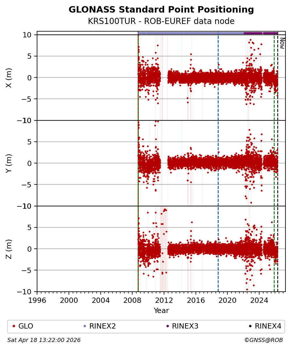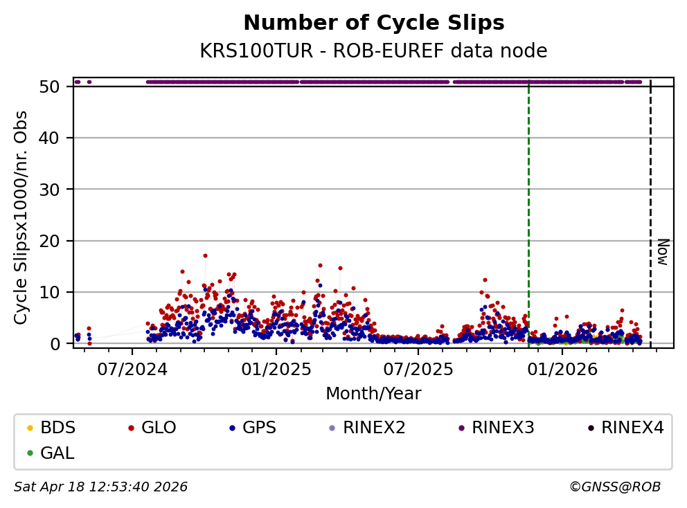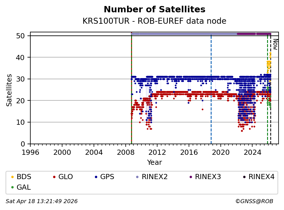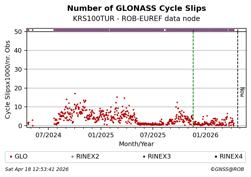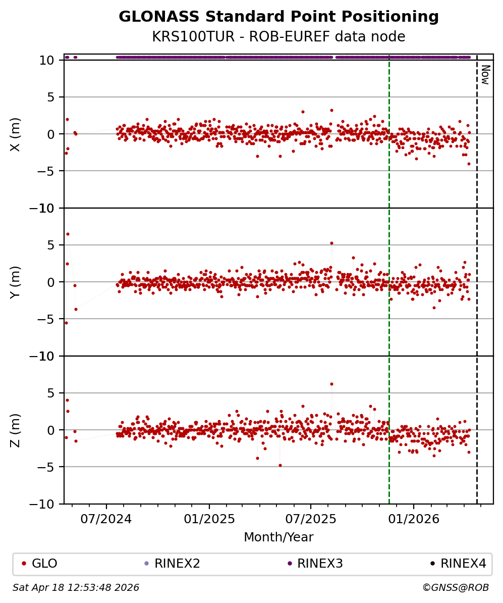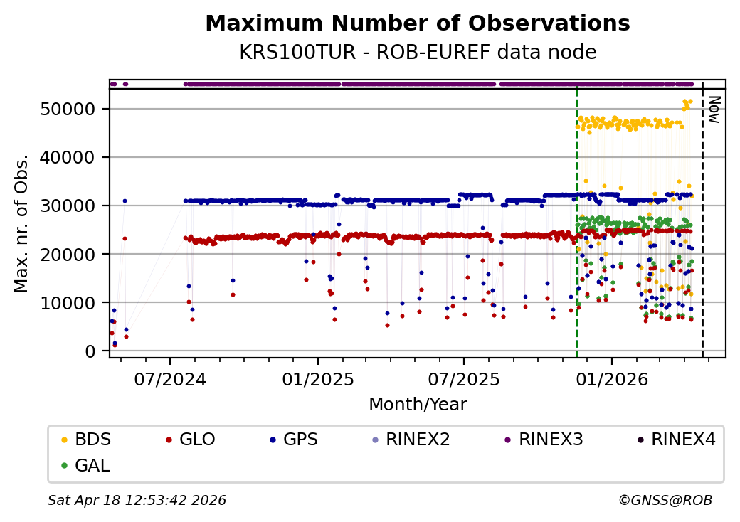 The plots below present the long-term tracking performance of the EPOS-GNSS station KRS100TUR based on the daily RINEX data available from the ROB-EUREF EPOS-GNSS data node. The data quality metrics have been computed at the data node using the G-Nut/Anubis software.