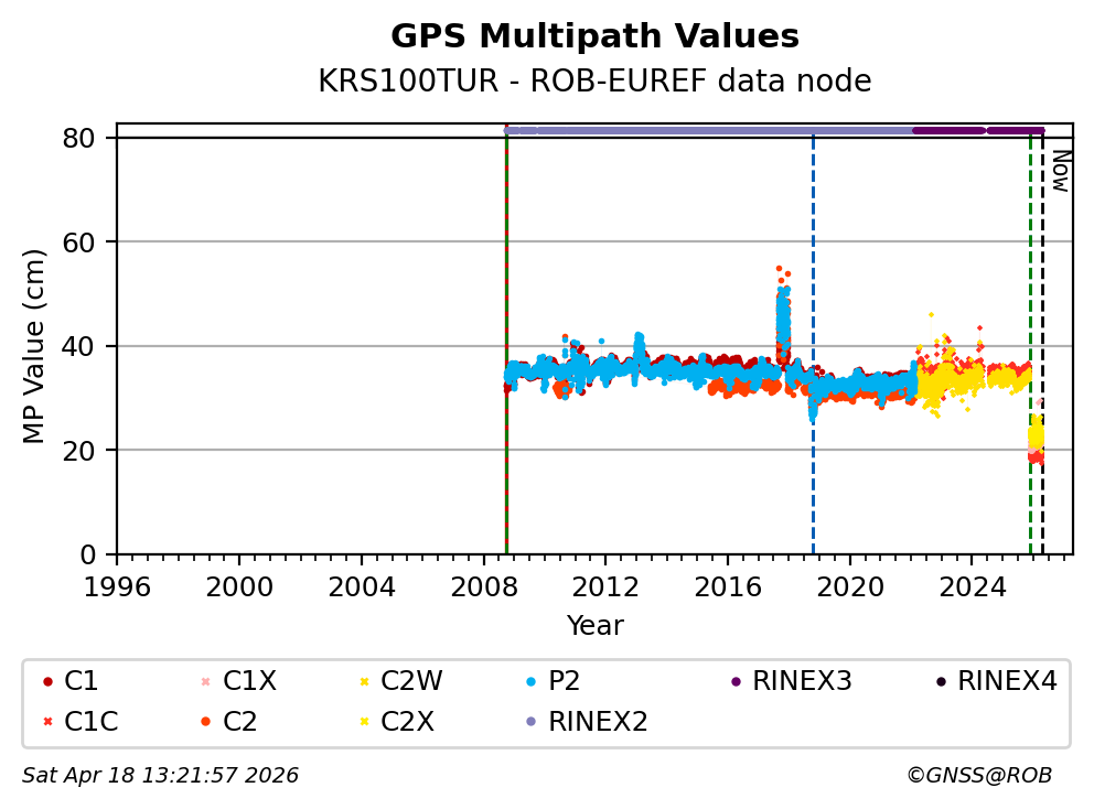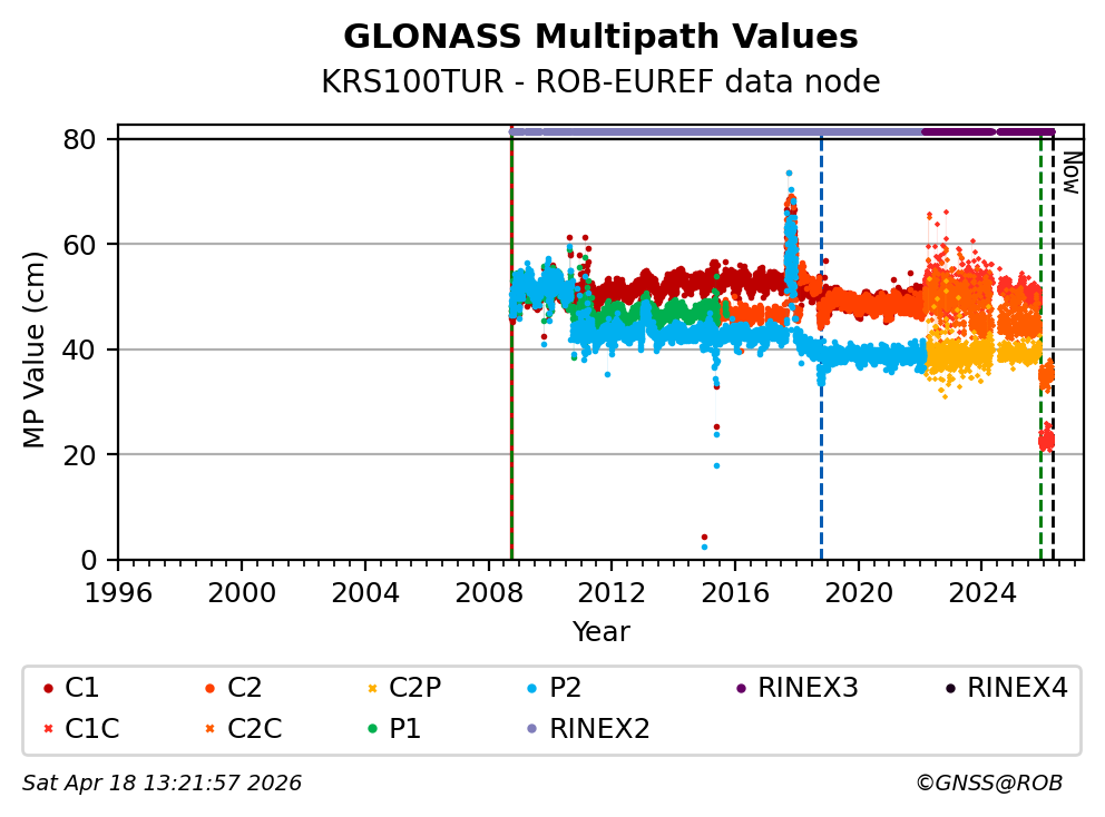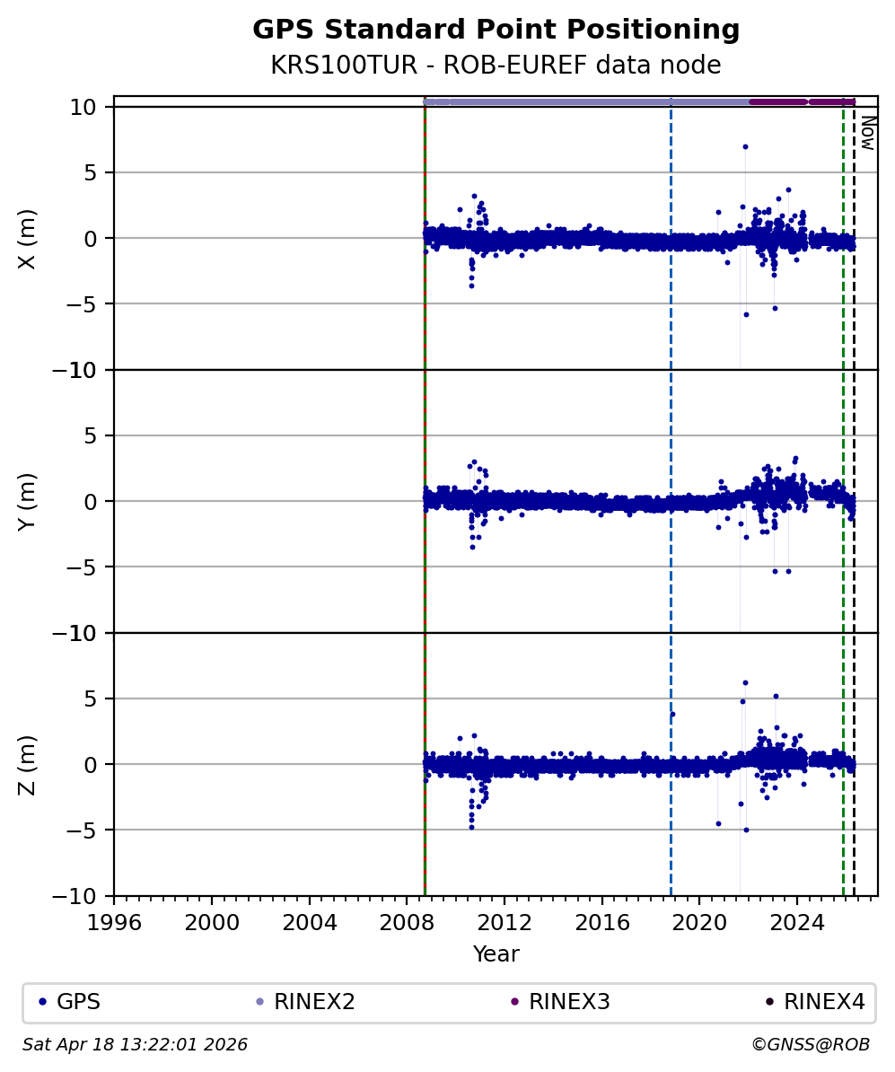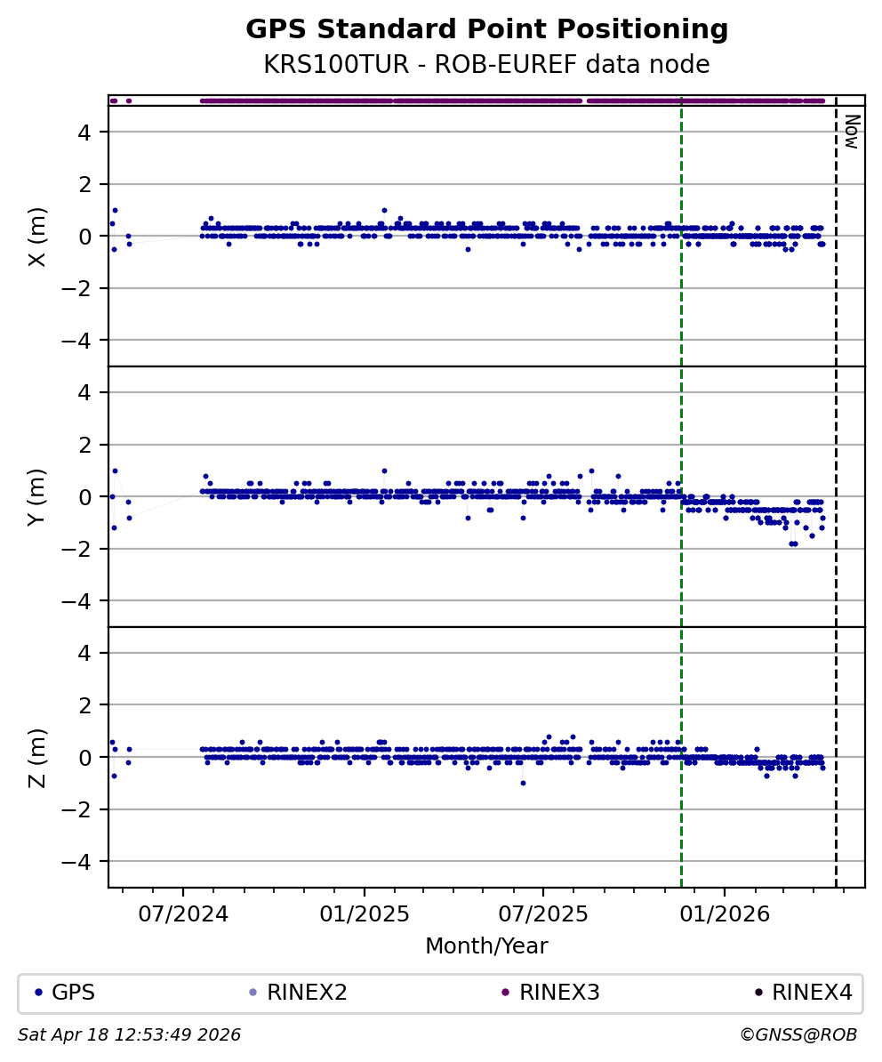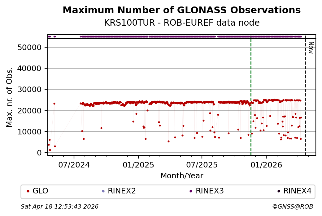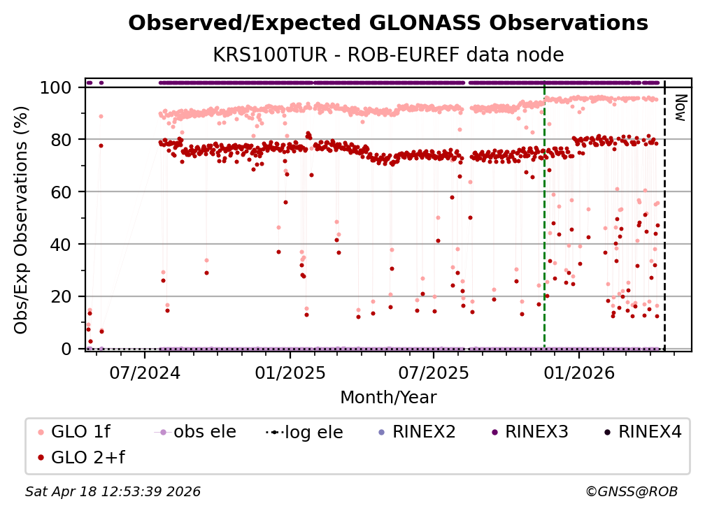 The plots below present the long-term tracking performance of the EPOS-GNSS station KRS100TUR based on the daily RINEX data available from the ROB-EUREF EPOS-GNSS data node. The data quality metrics have been computed at the data node using the G-Nut/Anubis software.