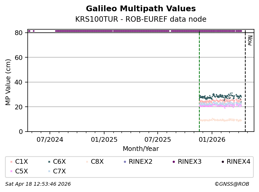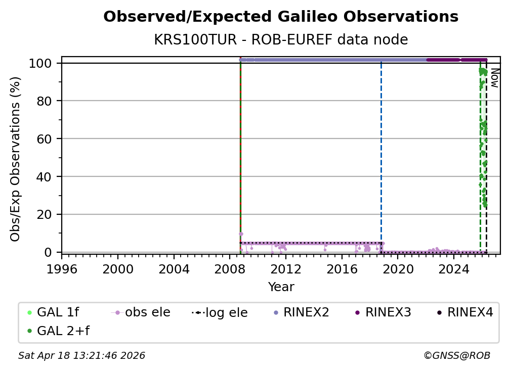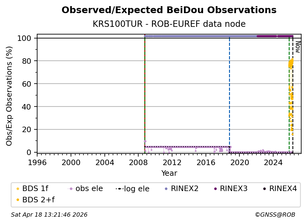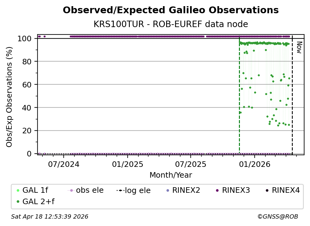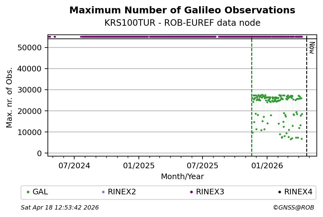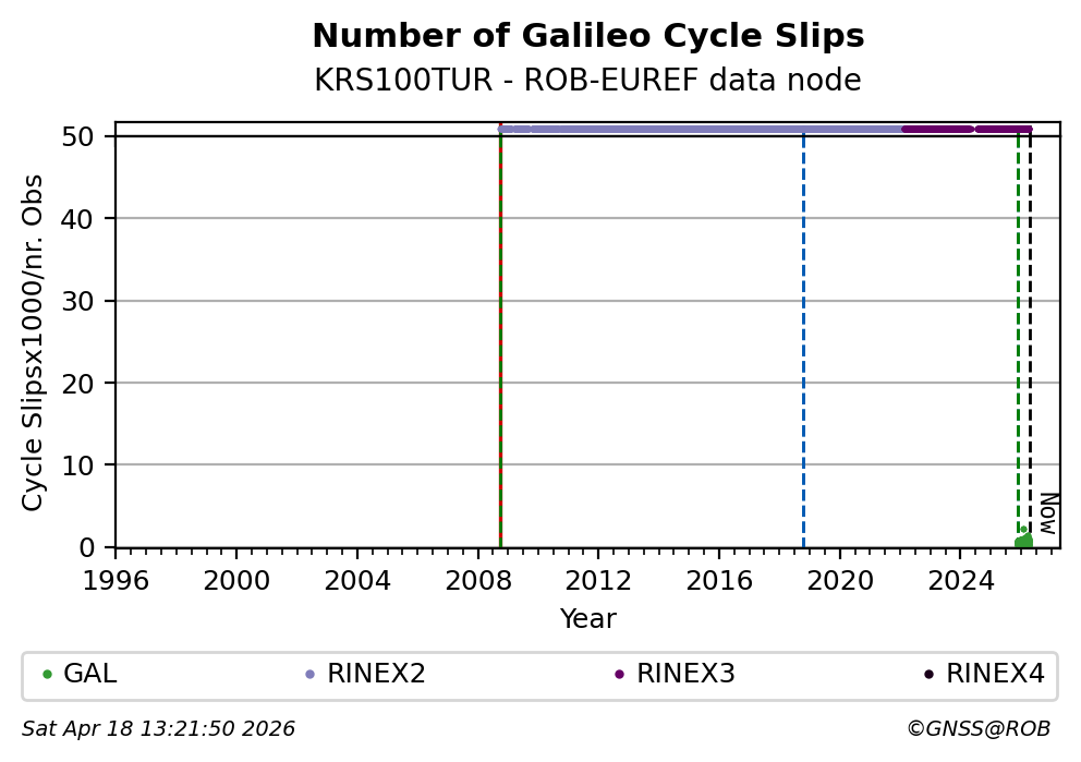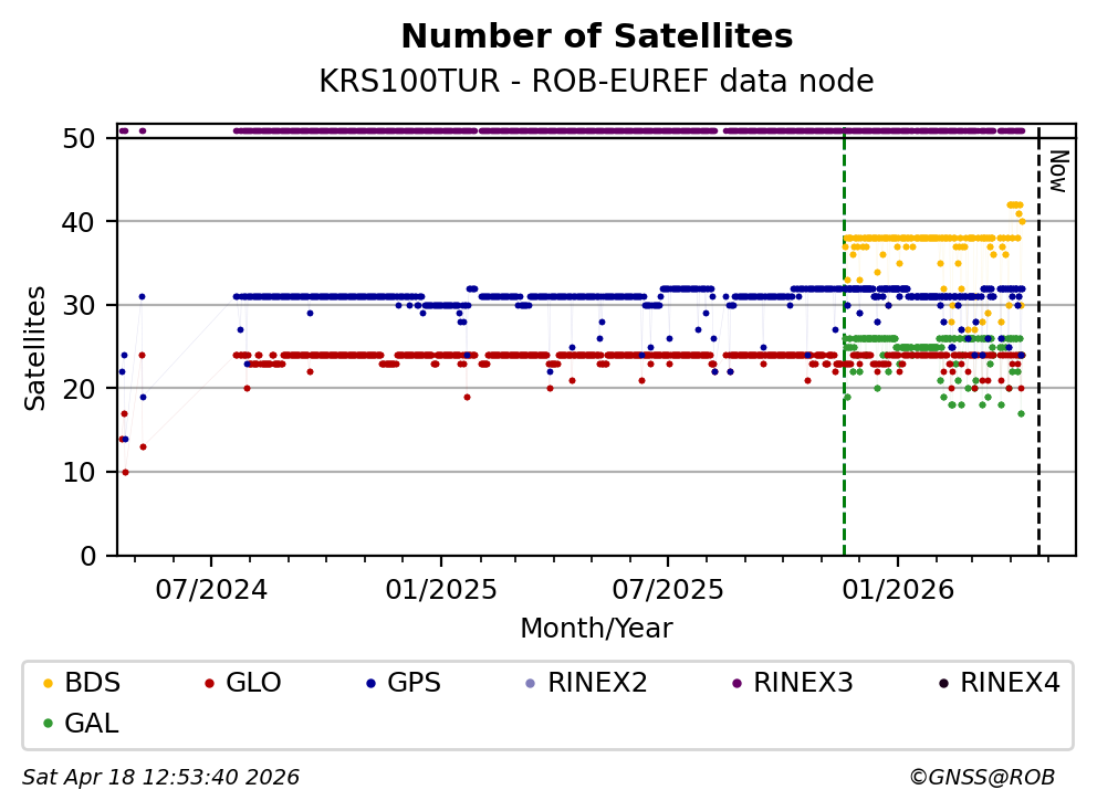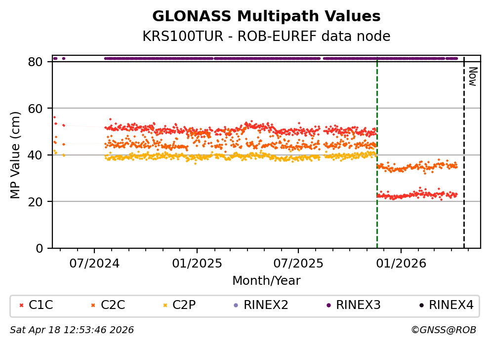 The plots below present the long-term tracking performance of the EPOS-GNSS station KRS100TUR based on the daily RINEX data available from the ROB-EUREF EPOS-GNSS data node. The data quality metrics have been computed at the data node using the G-Nut/Anubis software.