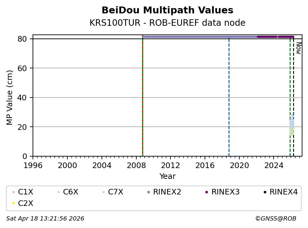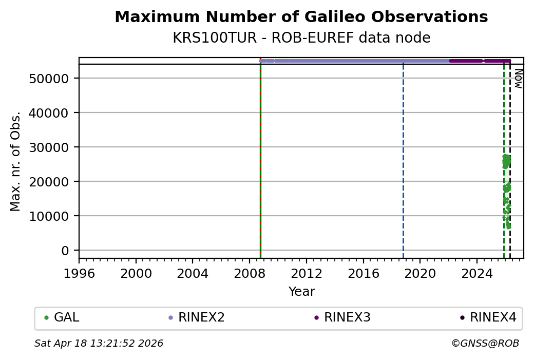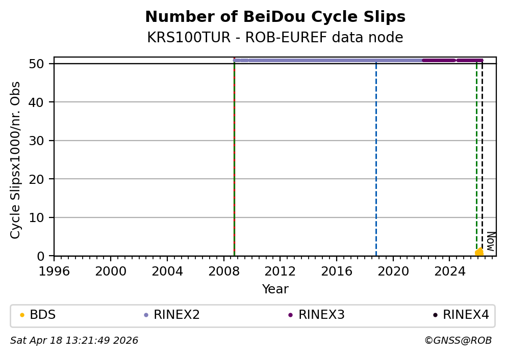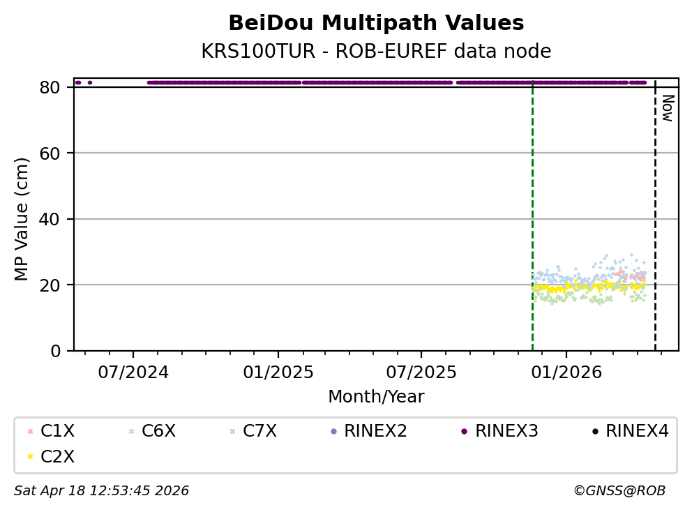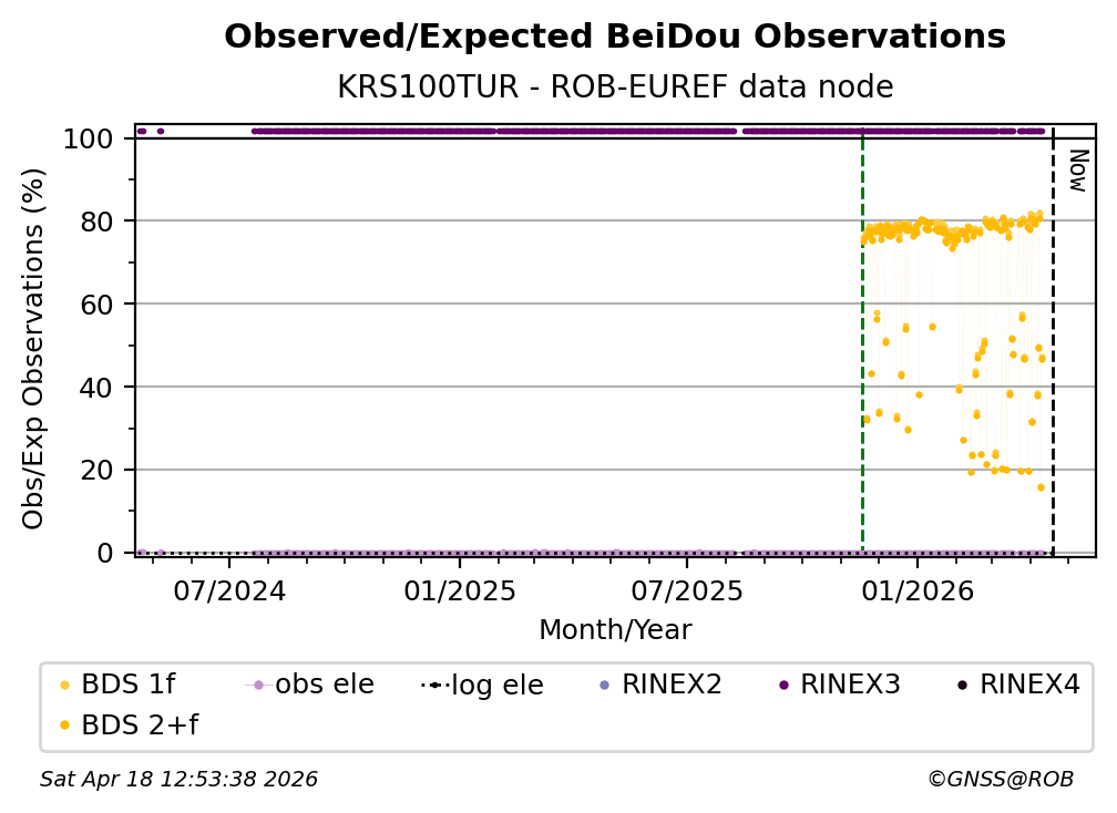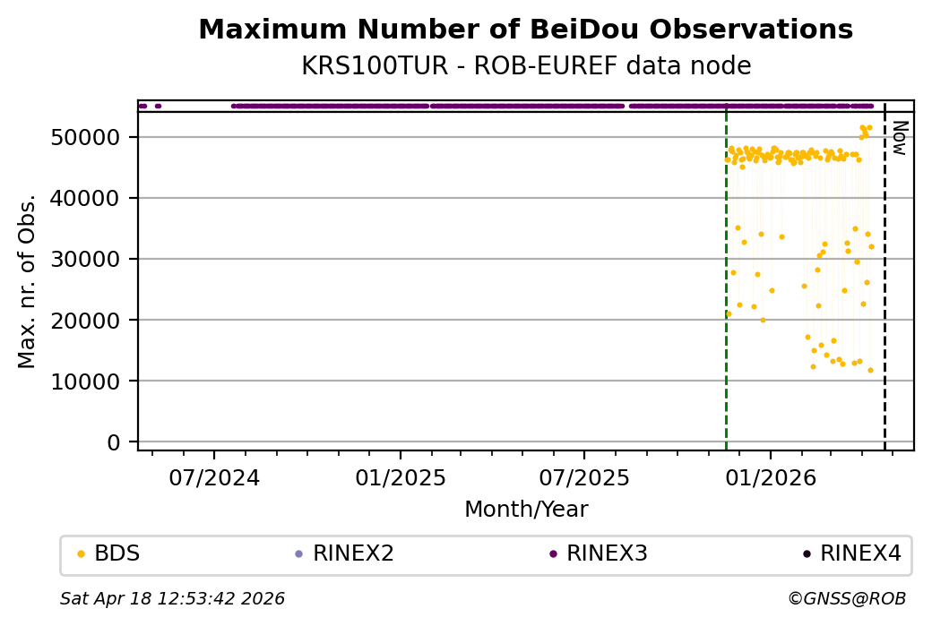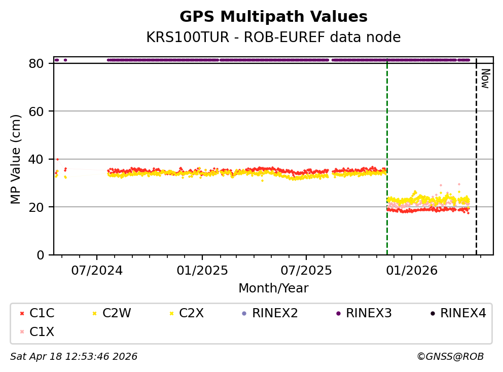 The plots below present the long-term tracking performance of the EPOS-GNSS station KRS100TUR based on the daily RINEX data available from the ROB-EUREF EPOS-GNSS data node. The data quality metrics have been computed at the data node using the G-Nut/Anubis software.
