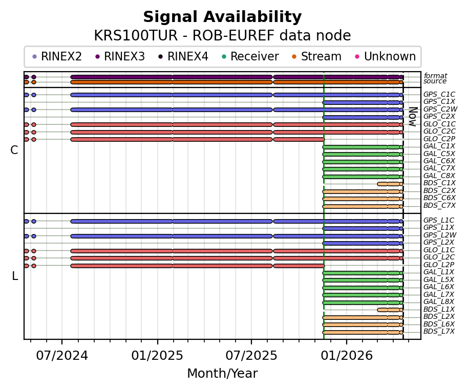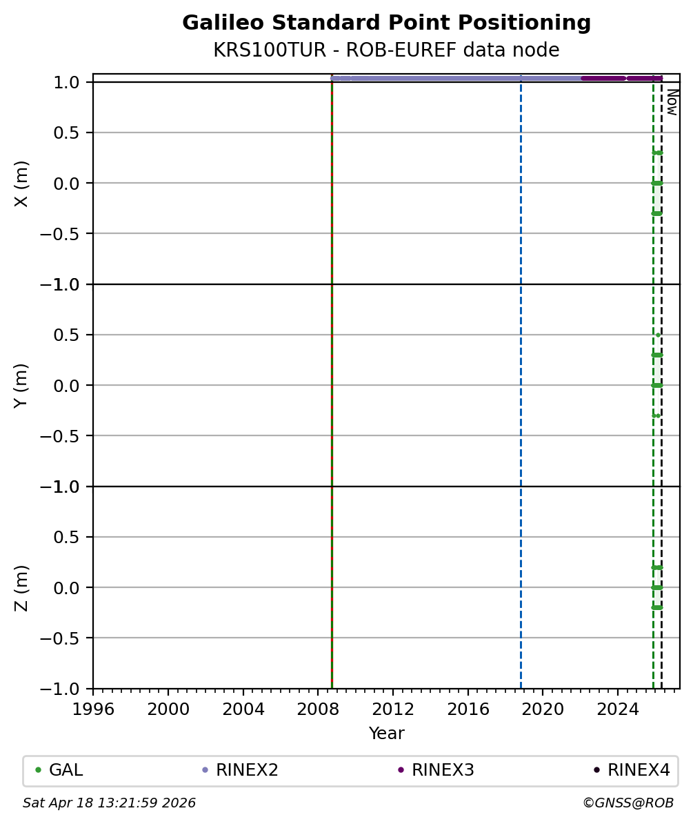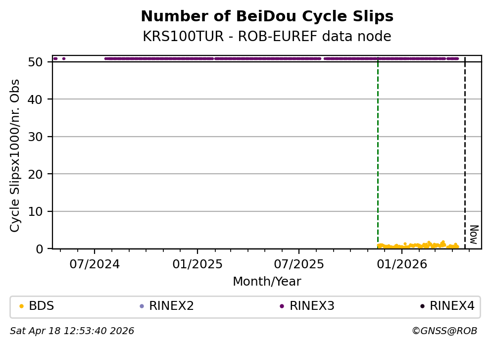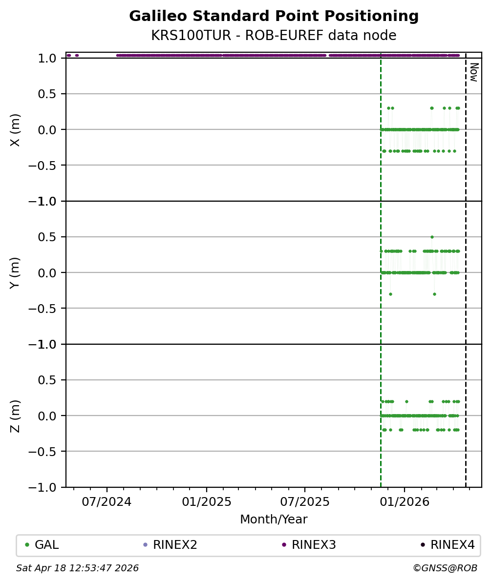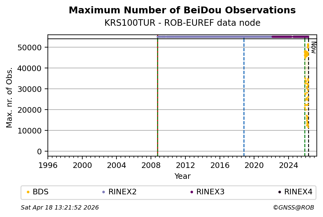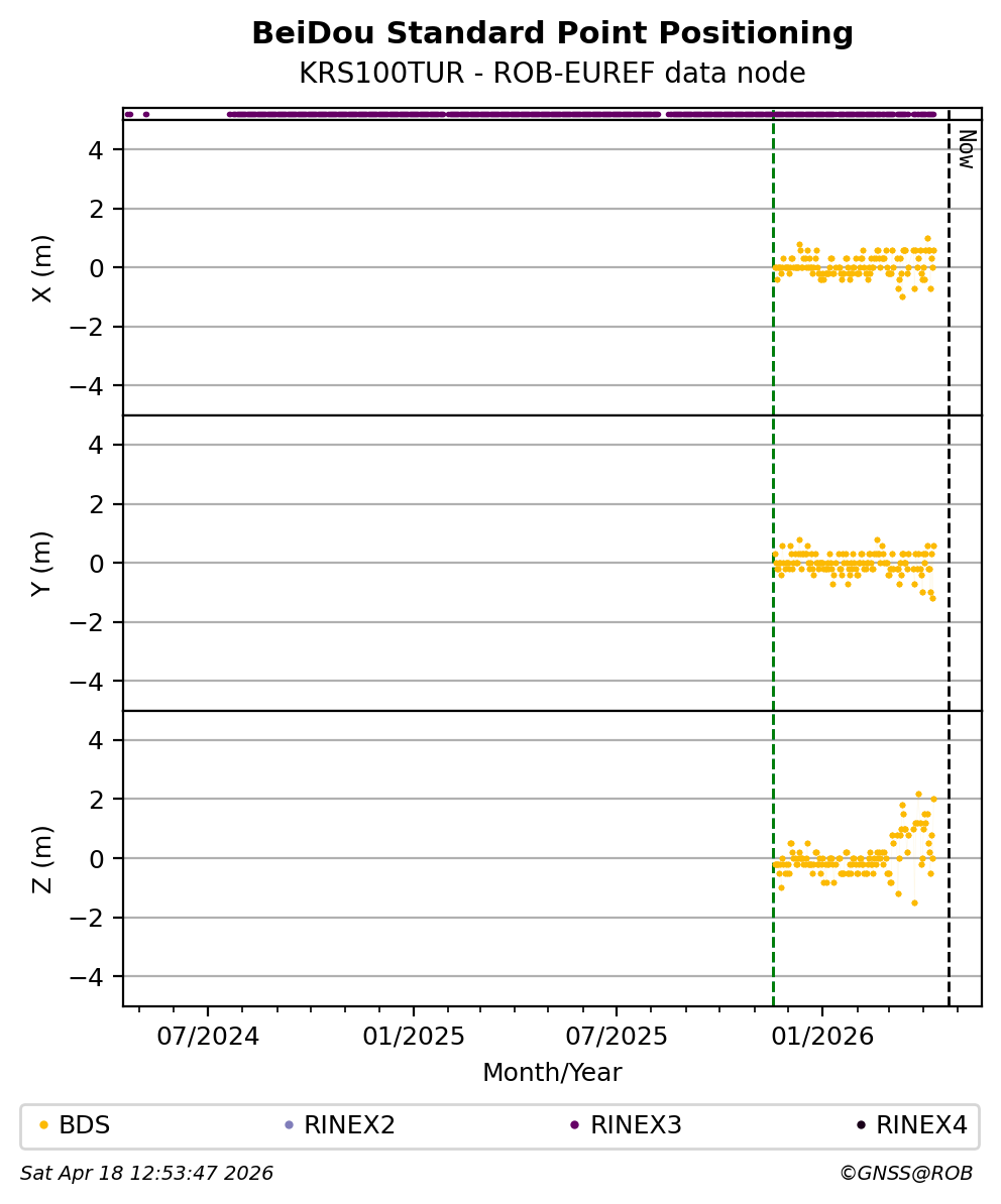 The plots below present the long-term tracking performance of the EPOS-GNSS station KRS100TUR based on the daily RINEX data available from the ROB-EUREF EPOS-GNSS data node. The data quality metrics have been computed at the data node using the G-Nut/Anubis software.