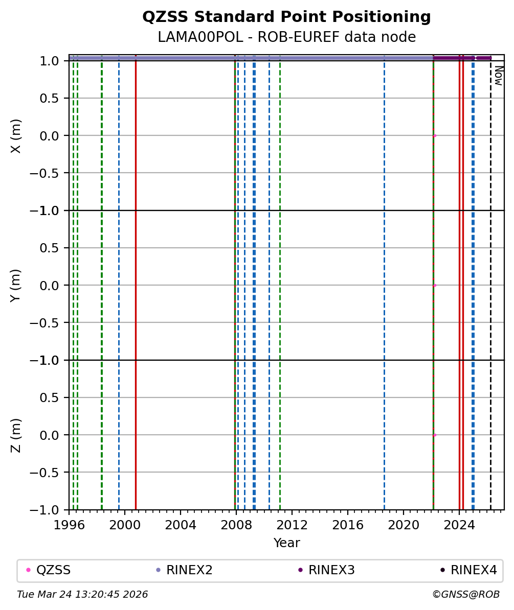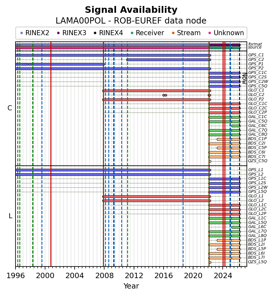 Red vertical lines, green and blue vertical dotted lines indicate respectively a change of antenna, receiver or receiver configuration (including firmware) as indicated by the station manager in the station site log available from the M3G GNSS Metadata Catalog. The purple points in the top of the plot indicate the daily RINEX data availability at the data node.