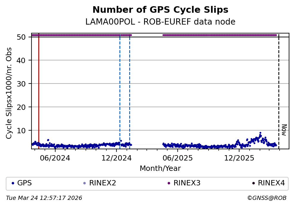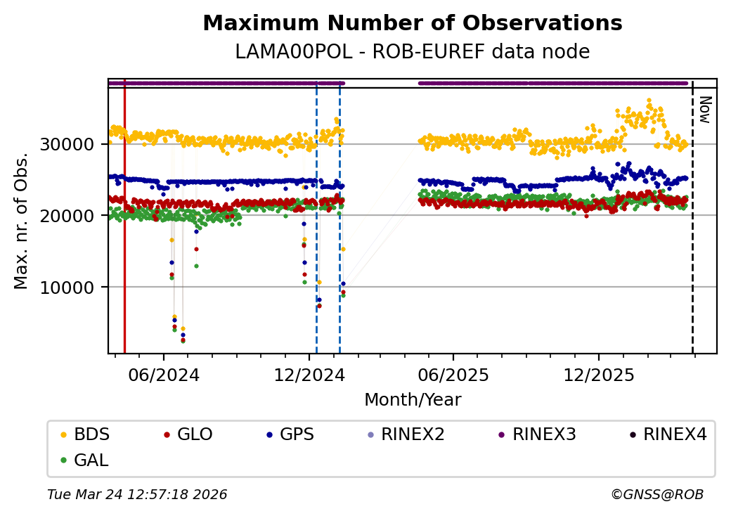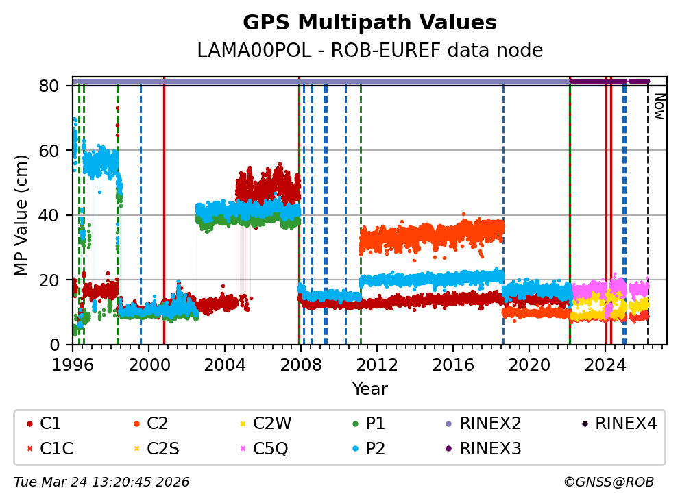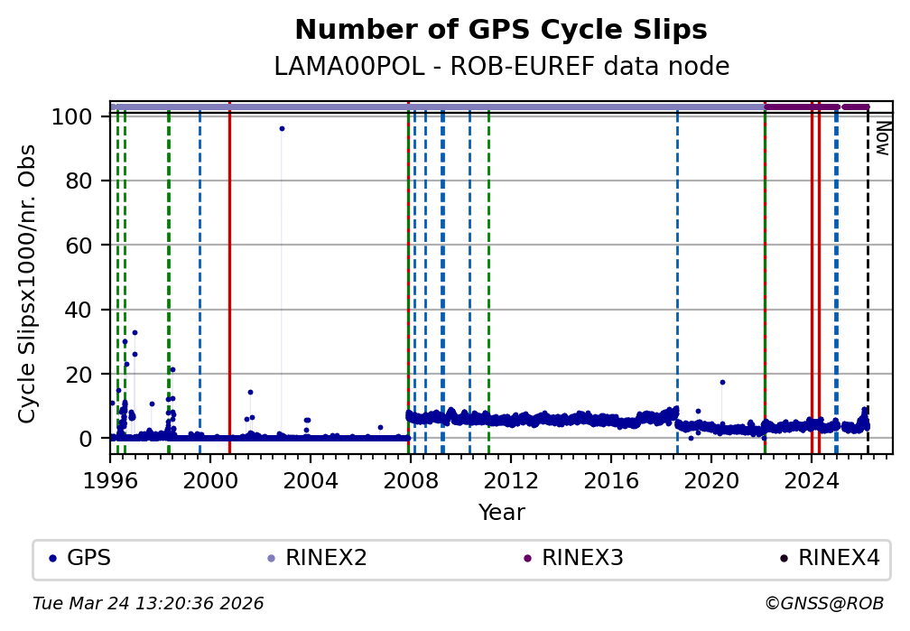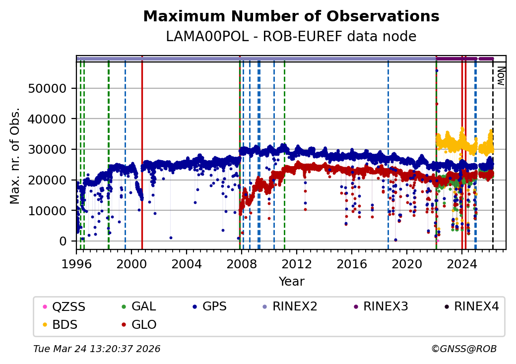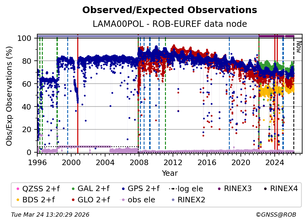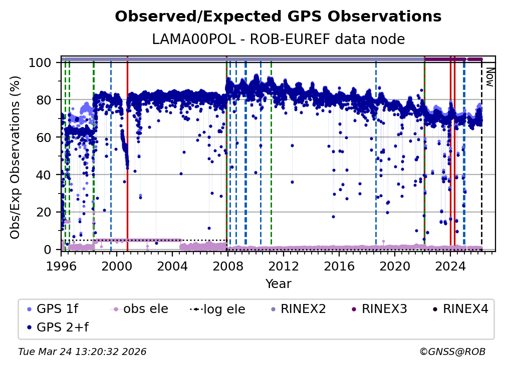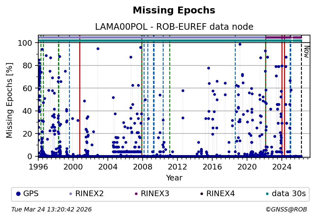 The plots below present the long-term tracking performance of the EPOS-GNSS station LAMA00POL based on the daily RINEX data available from the ROB-EUREF EPOS-GNSS data node. The data quality metrics have been computed at the data node using the G-Nut/Anubis software.