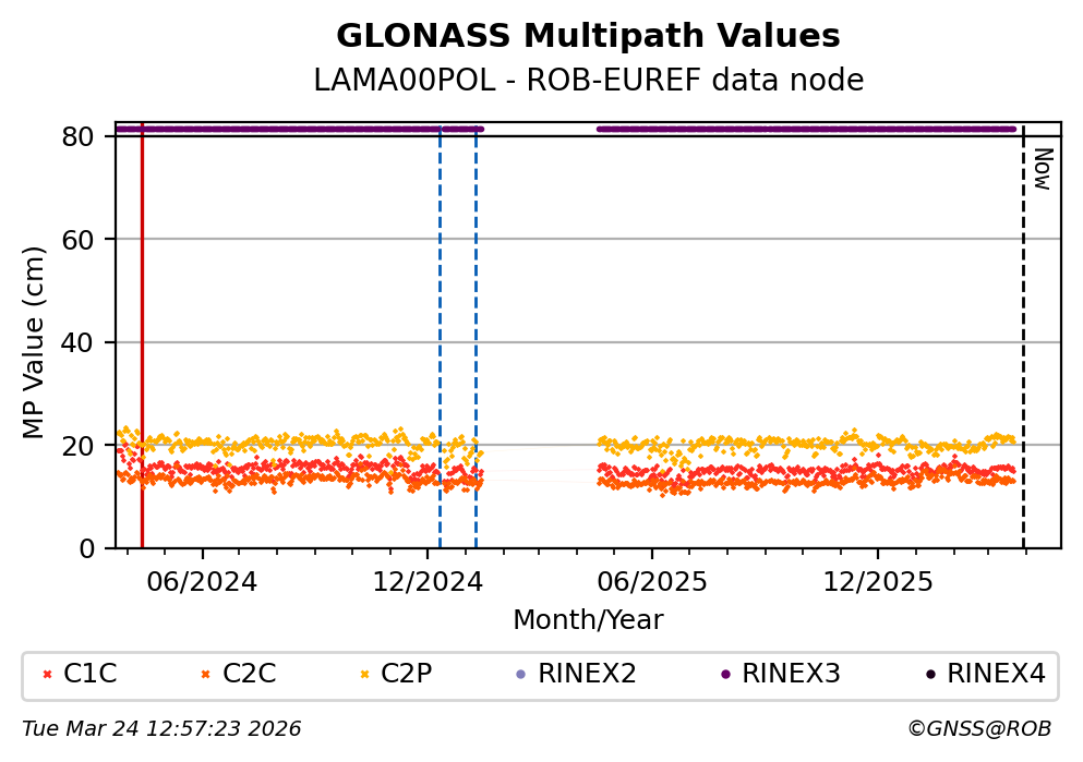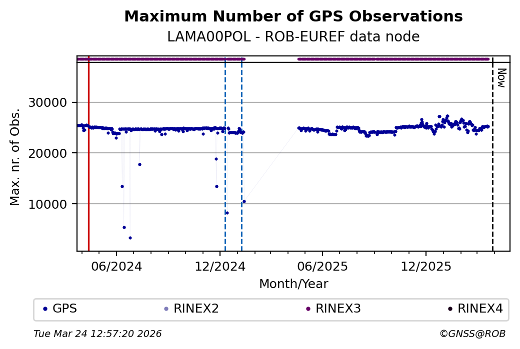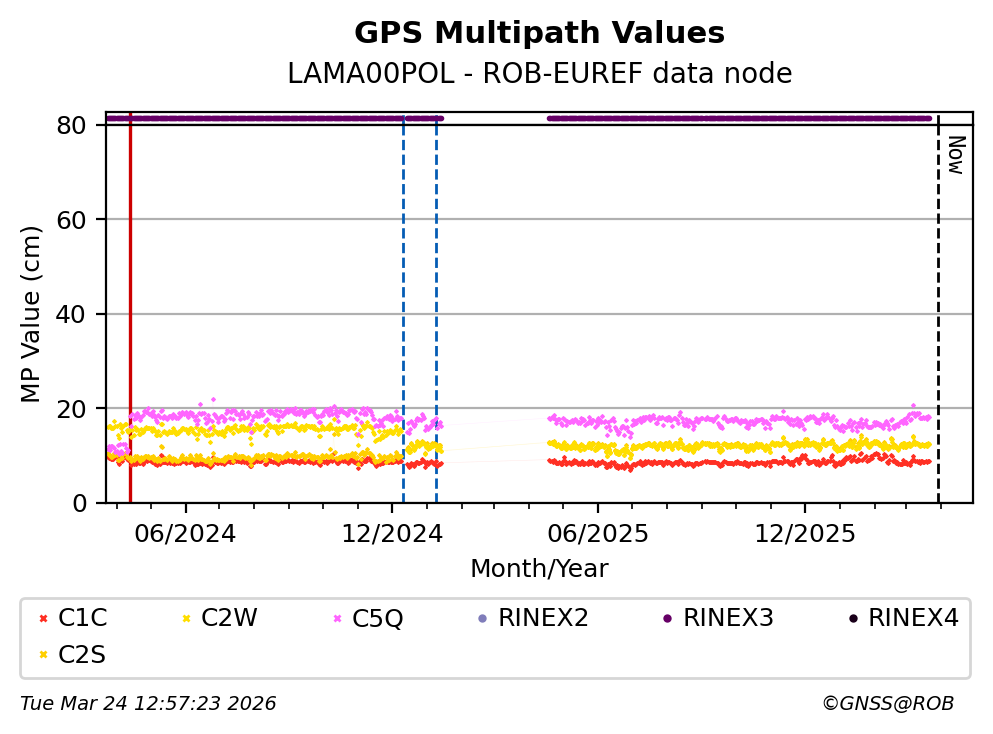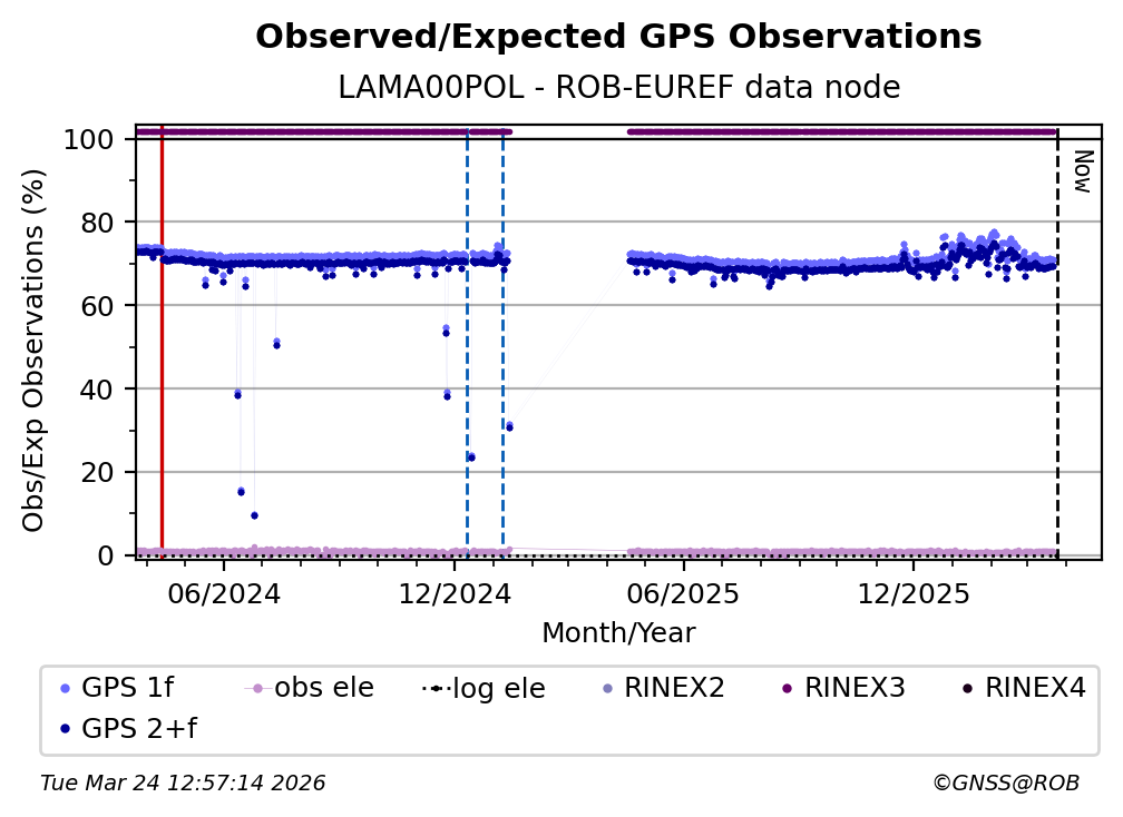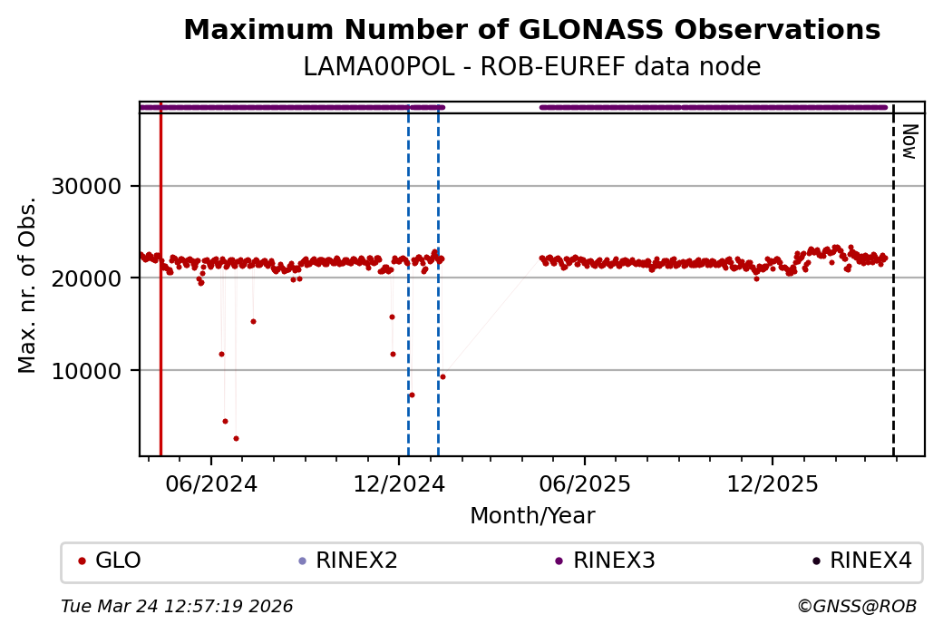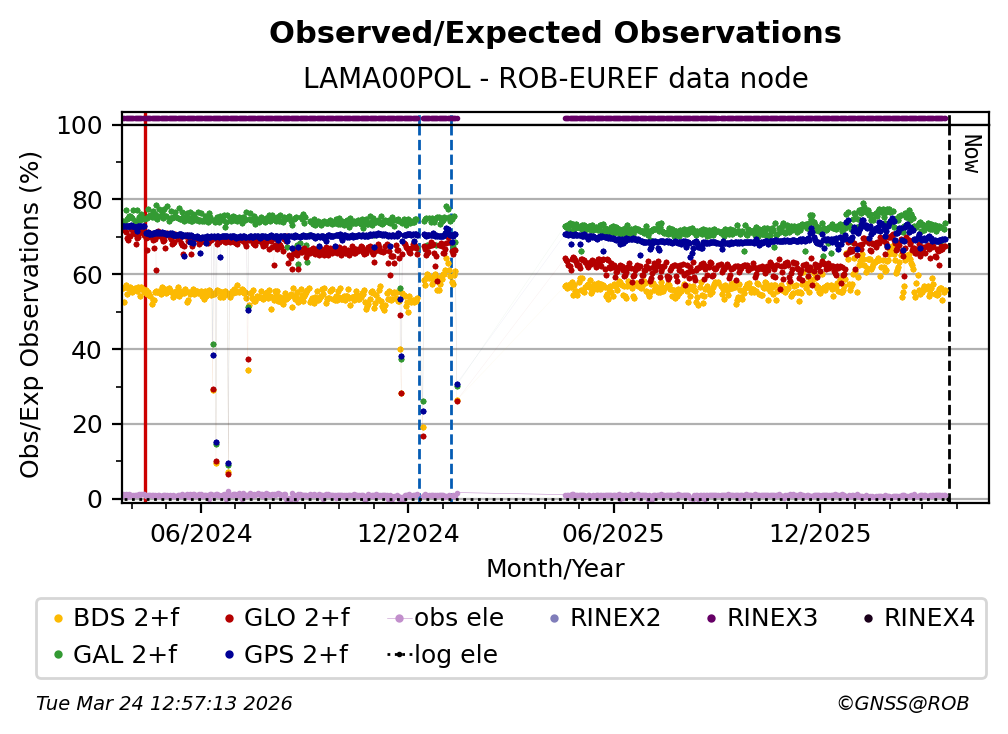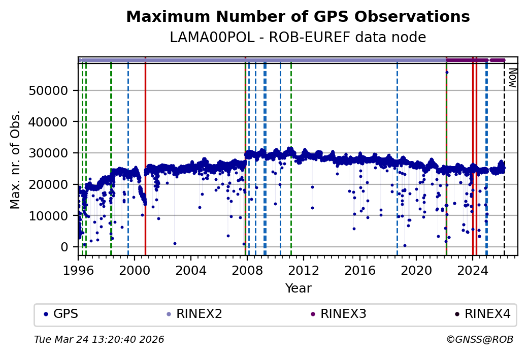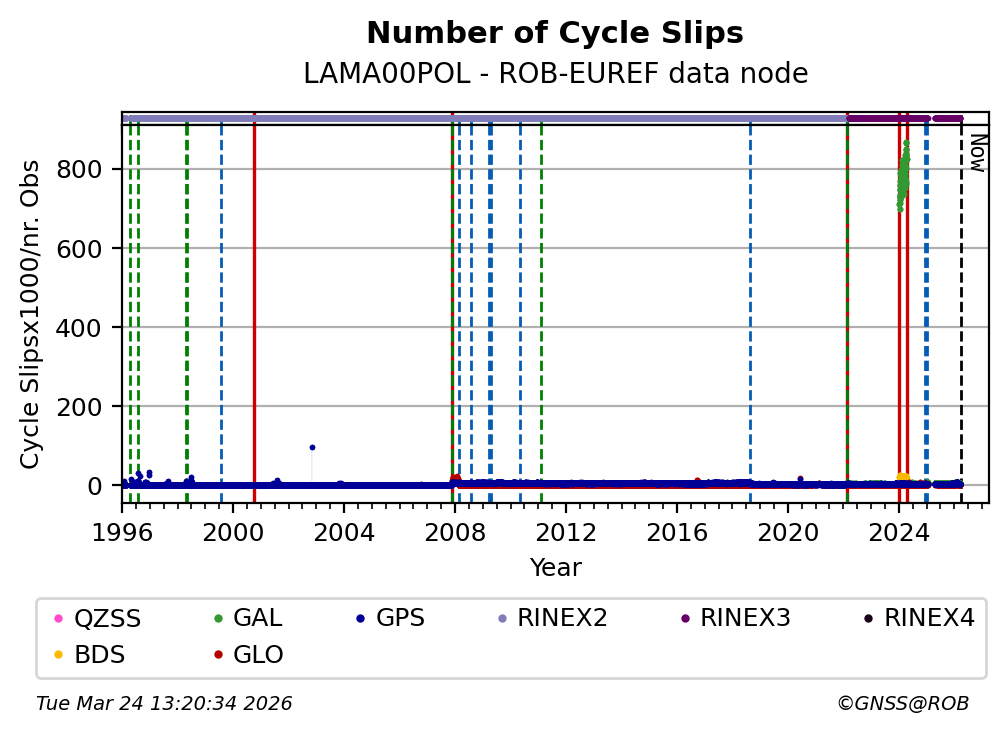 The plots below present the long-term tracking performance of the EPOS-GNSS station LAMA00POL based on the daily RINEX data available from the ROB-EUREF EPOS-GNSS data node. The data quality metrics have been computed at the data node using the G-Nut/Anubis software.