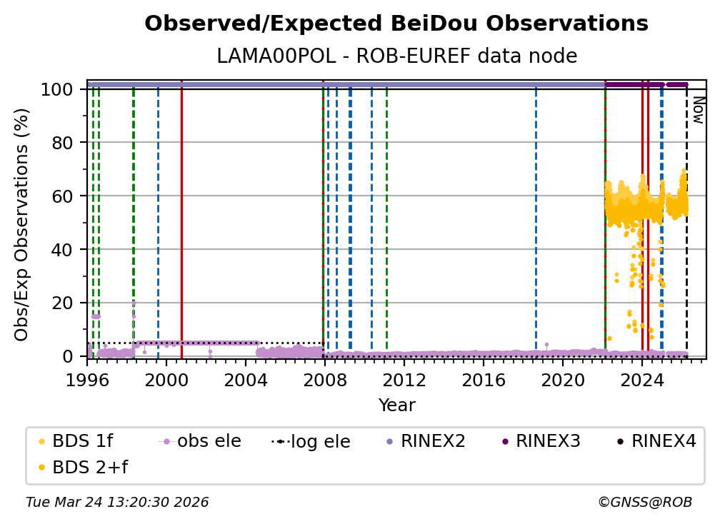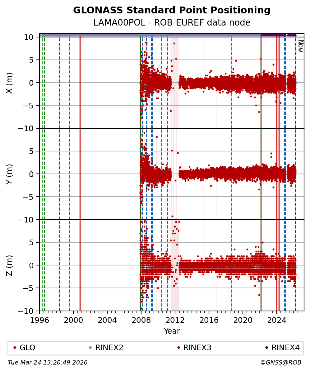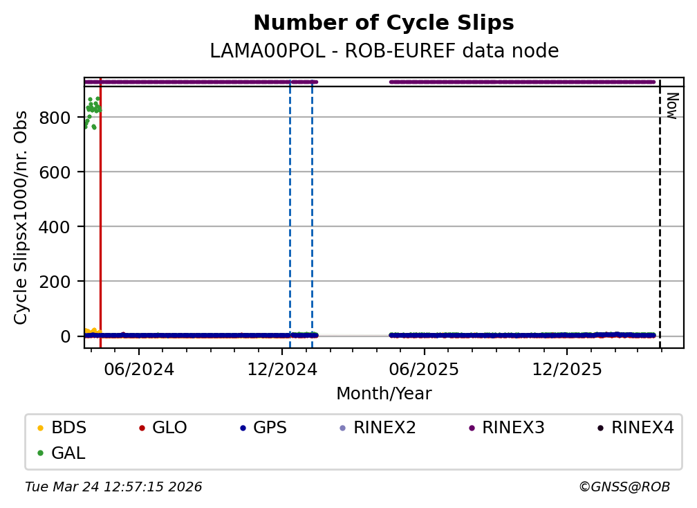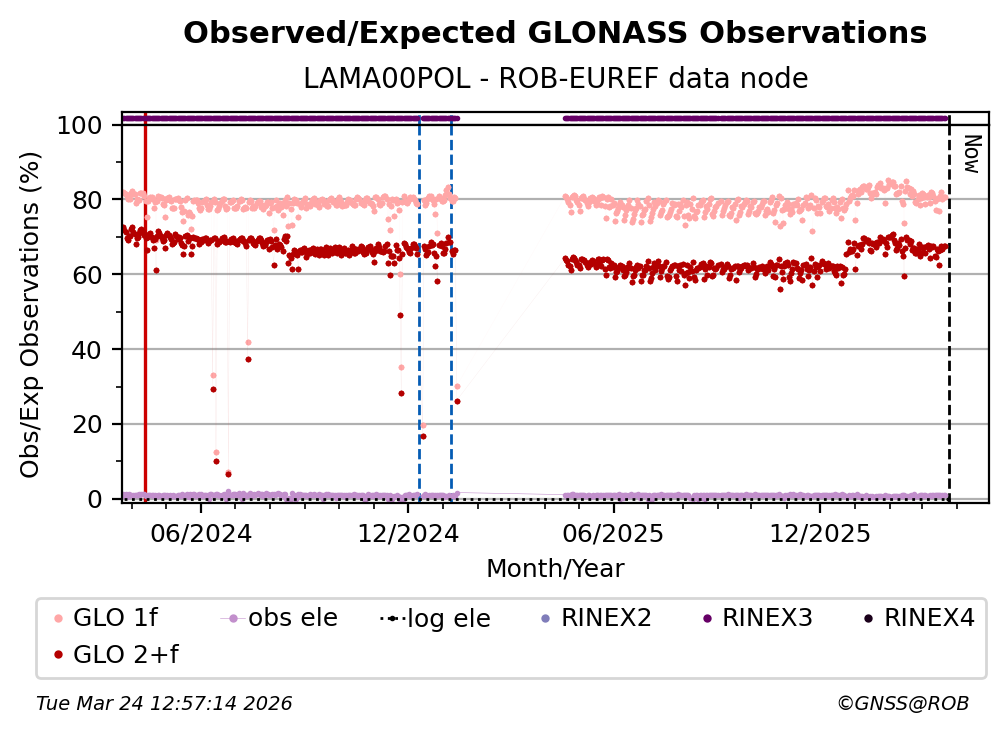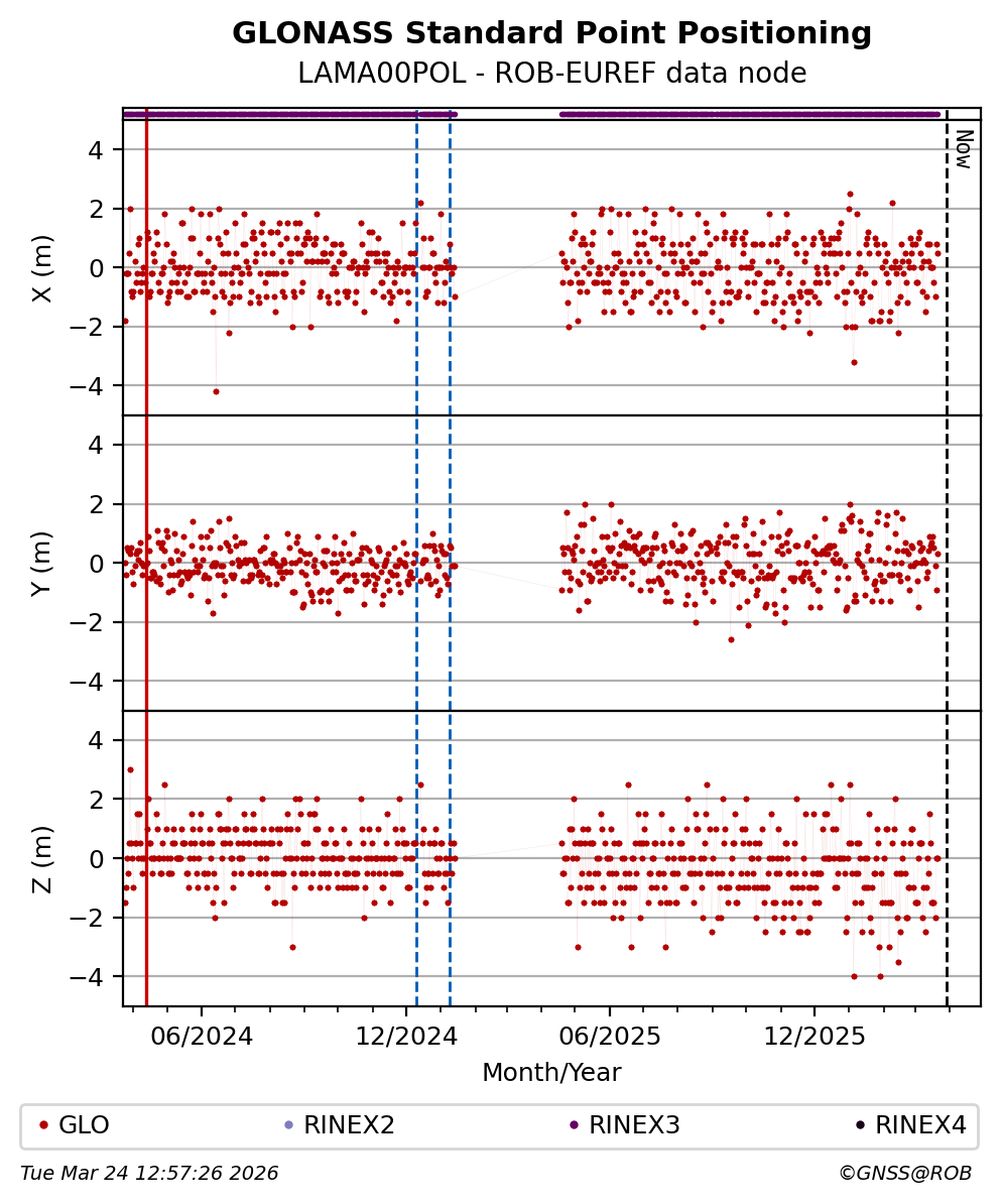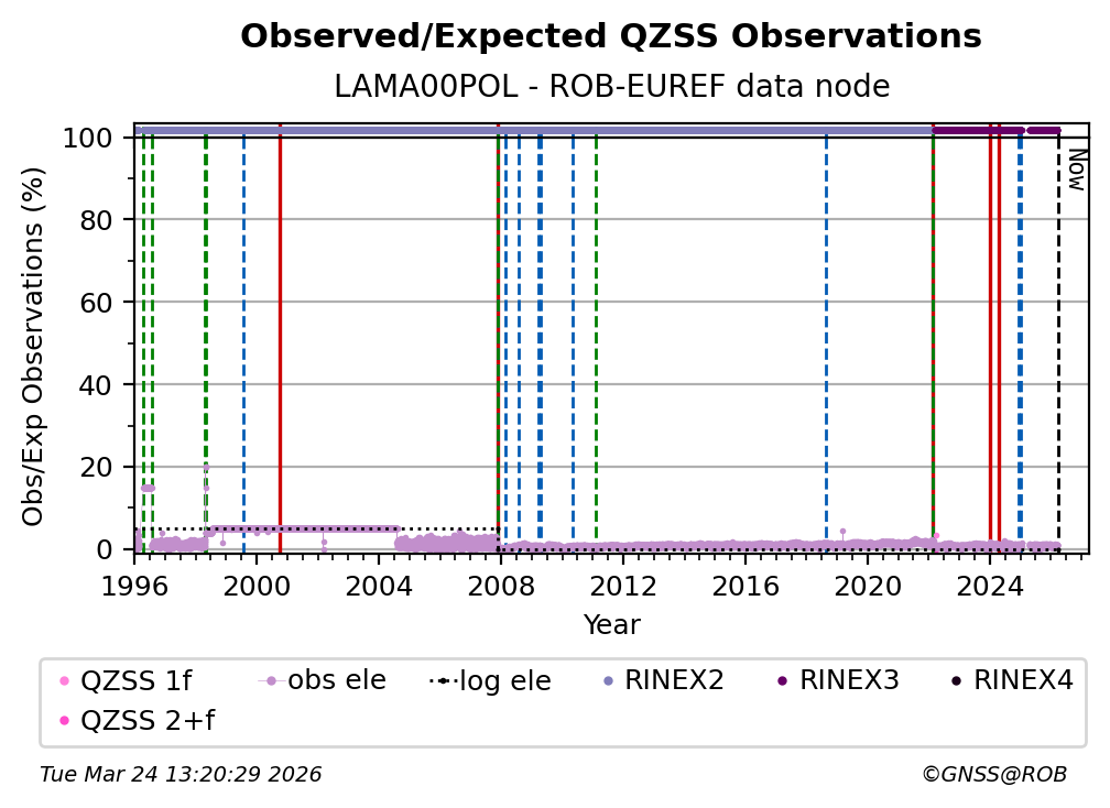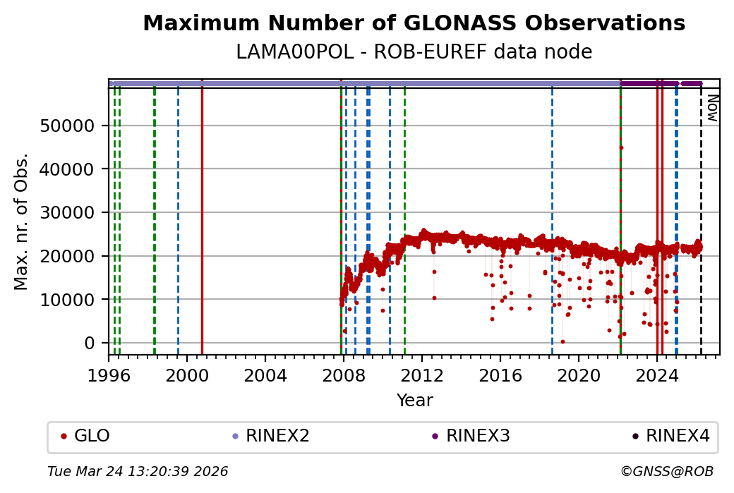 The plots below present the long-term tracking performance of the EPOS-GNSS station LAMA00POL based on the daily RINEX data available from the ROB-EUREF EPOS-GNSS data node. The data quality metrics have been computed at the data node using the G-Nut/Anubis software.