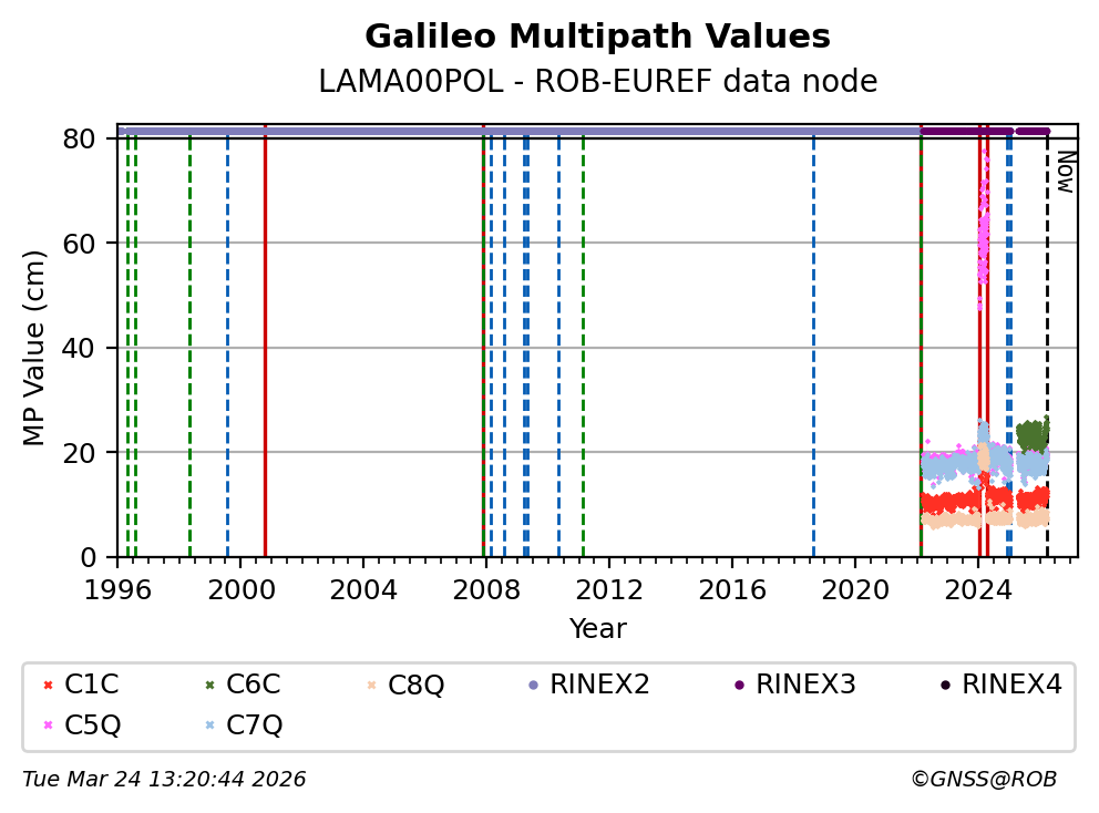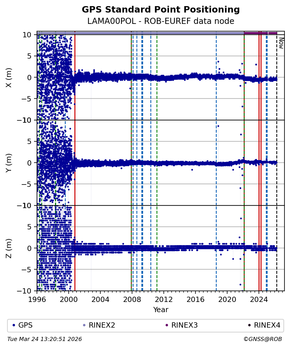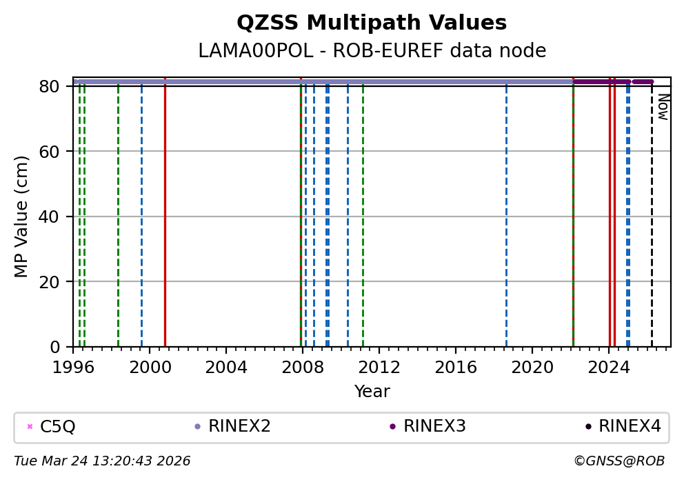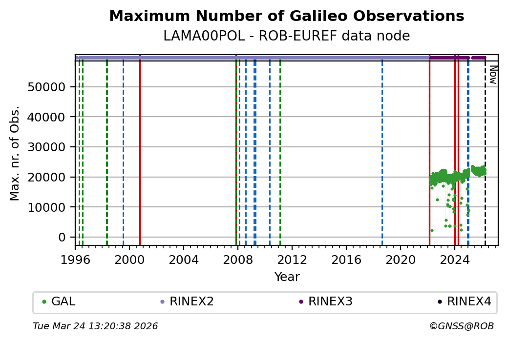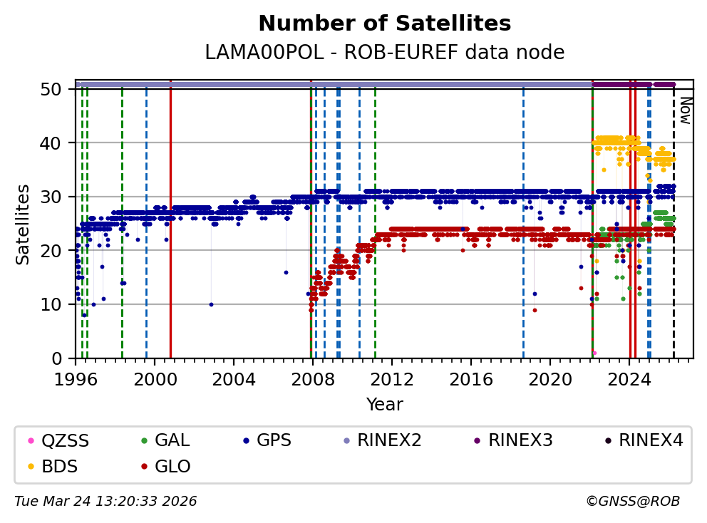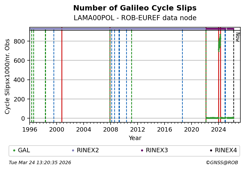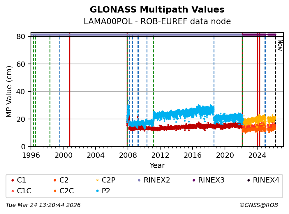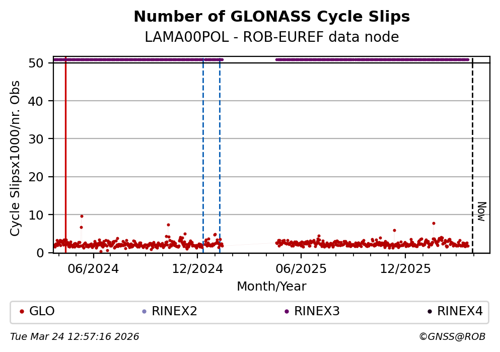 The plots below present the long-term tracking performance of the EPOS-GNSS station LAMA00POL based on the daily RINEX data available from the ROB-EUREF EPOS-GNSS data node. The data quality metrics have been computed at the data node using the G-Nut/Anubis software.