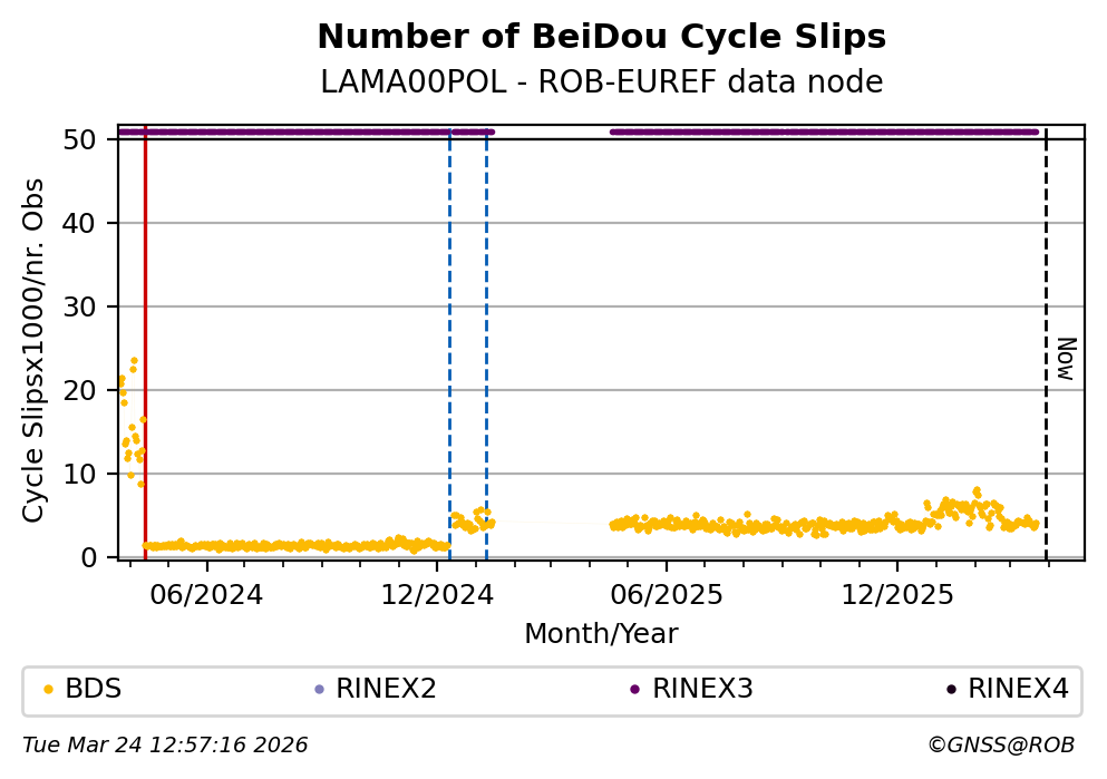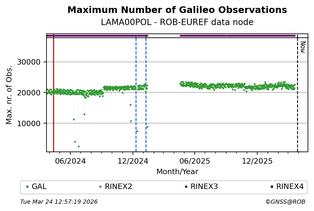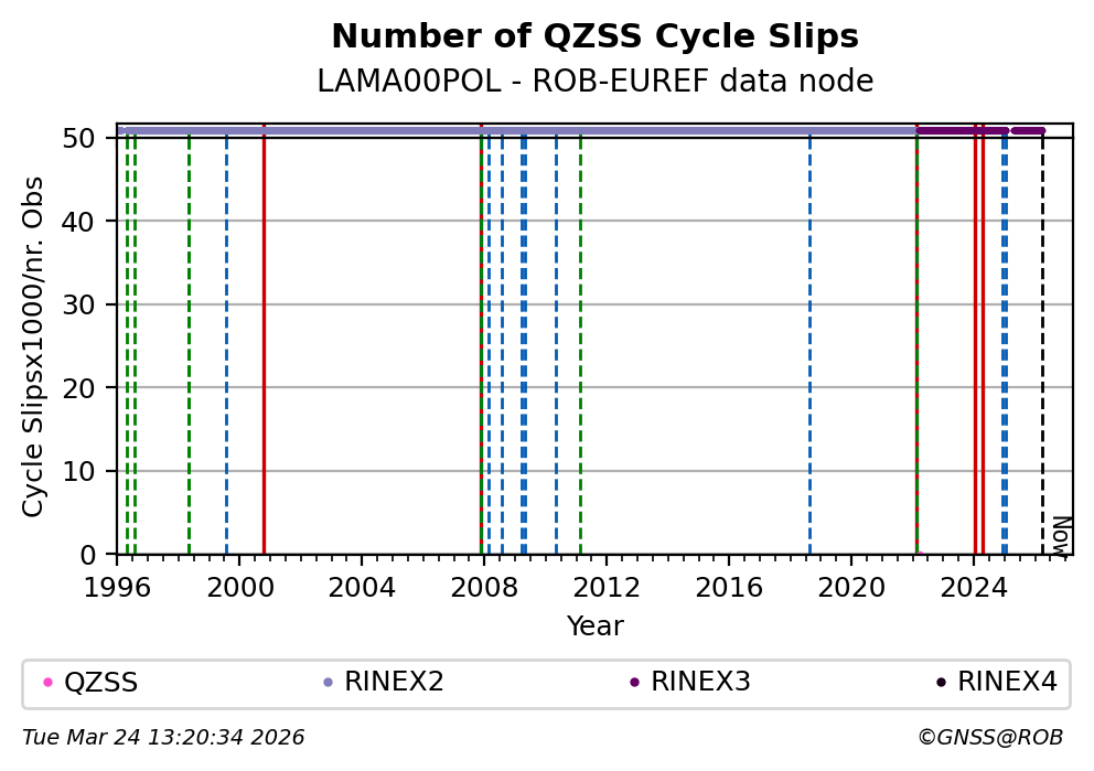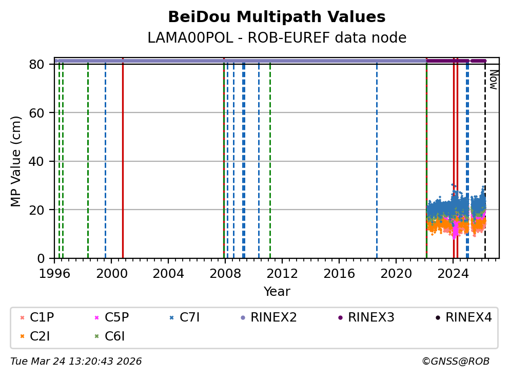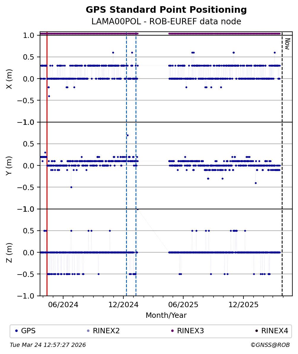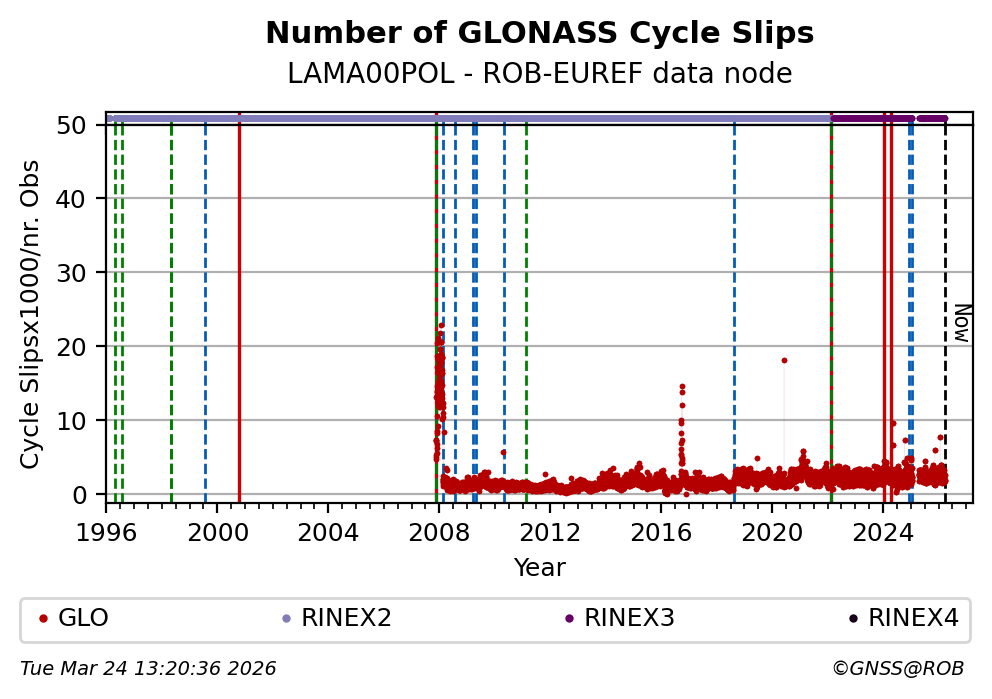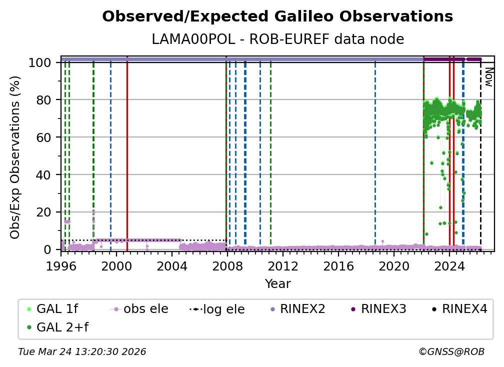 The plots below present the long-term tracking performance of the EPOS-GNSS station LAMA00POL based on the daily RINEX data available from the ROB-EUREF EPOS-GNSS data node. The data quality metrics have been computed at the data node using the G-Nut/Anubis software.