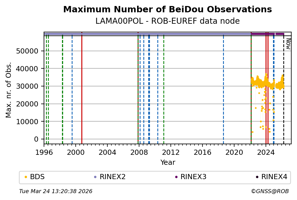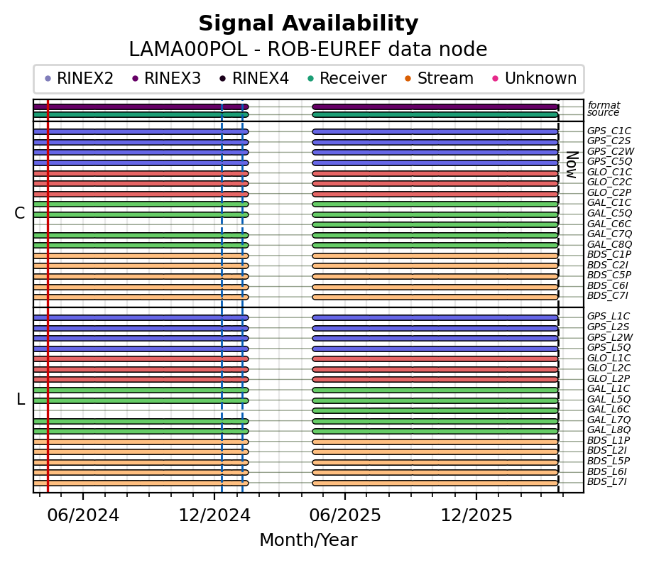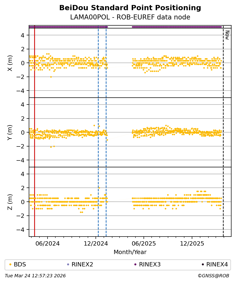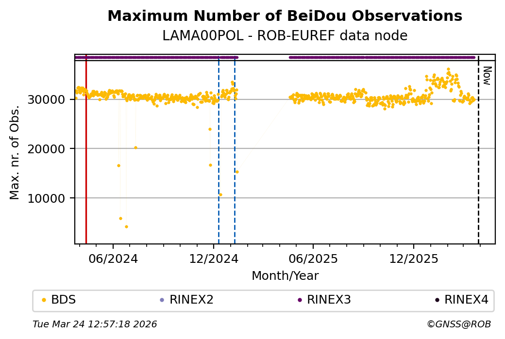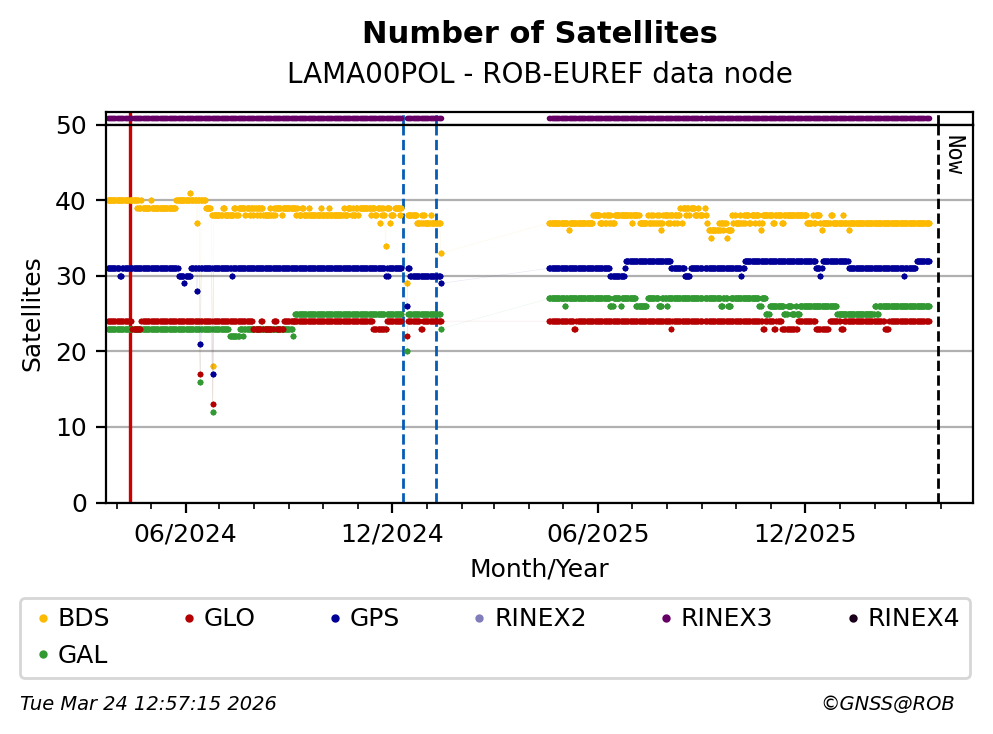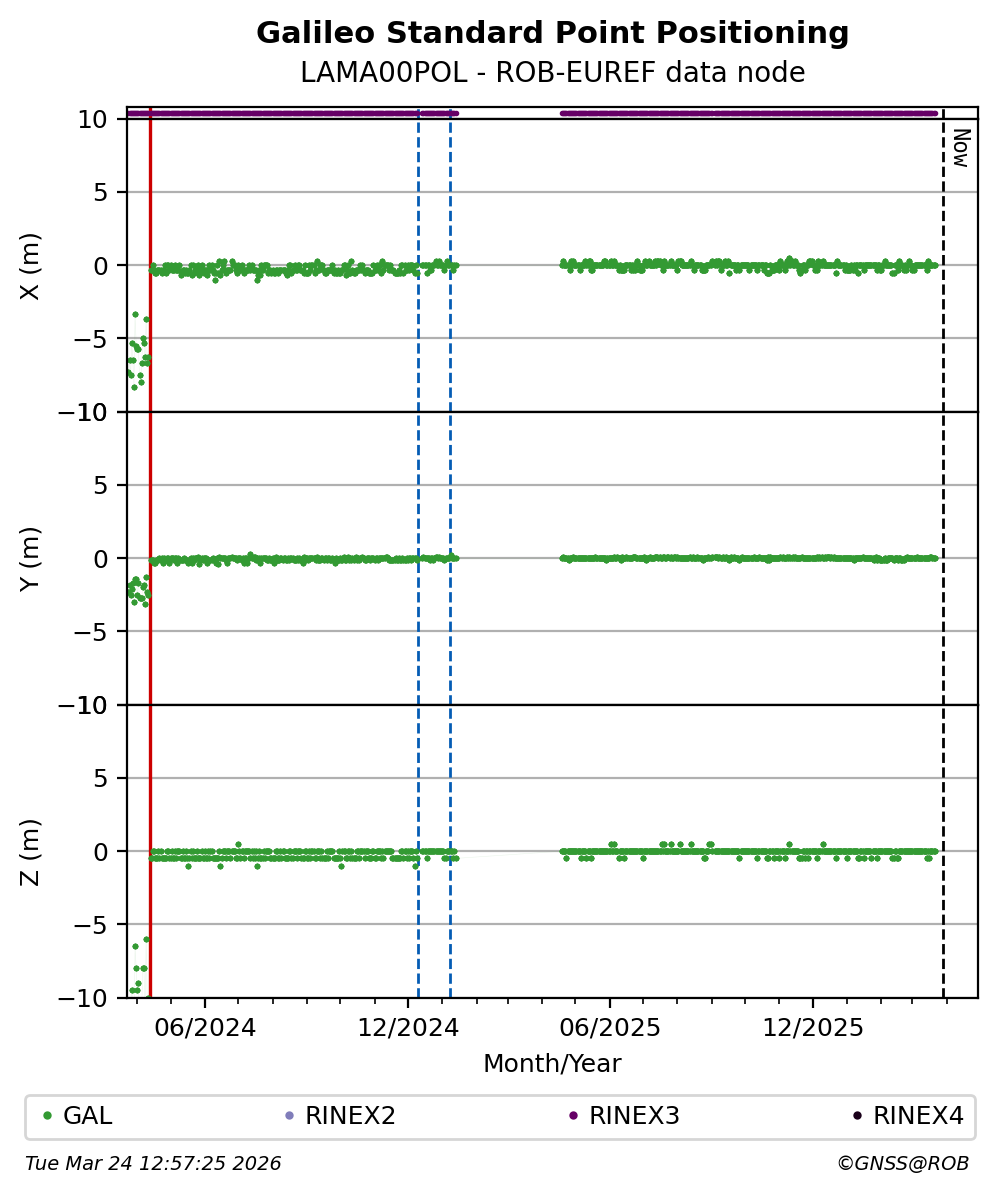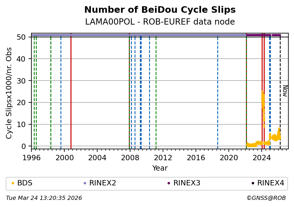 The plots below present the long-term tracking performance of the EPOS-GNSS station LAMA00POL based on the daily RINEX data available from the ROB-EUREF EPOS-GNSS data node. The data quality metrics have been computed at the data node using the G-Nut/Anubis software.