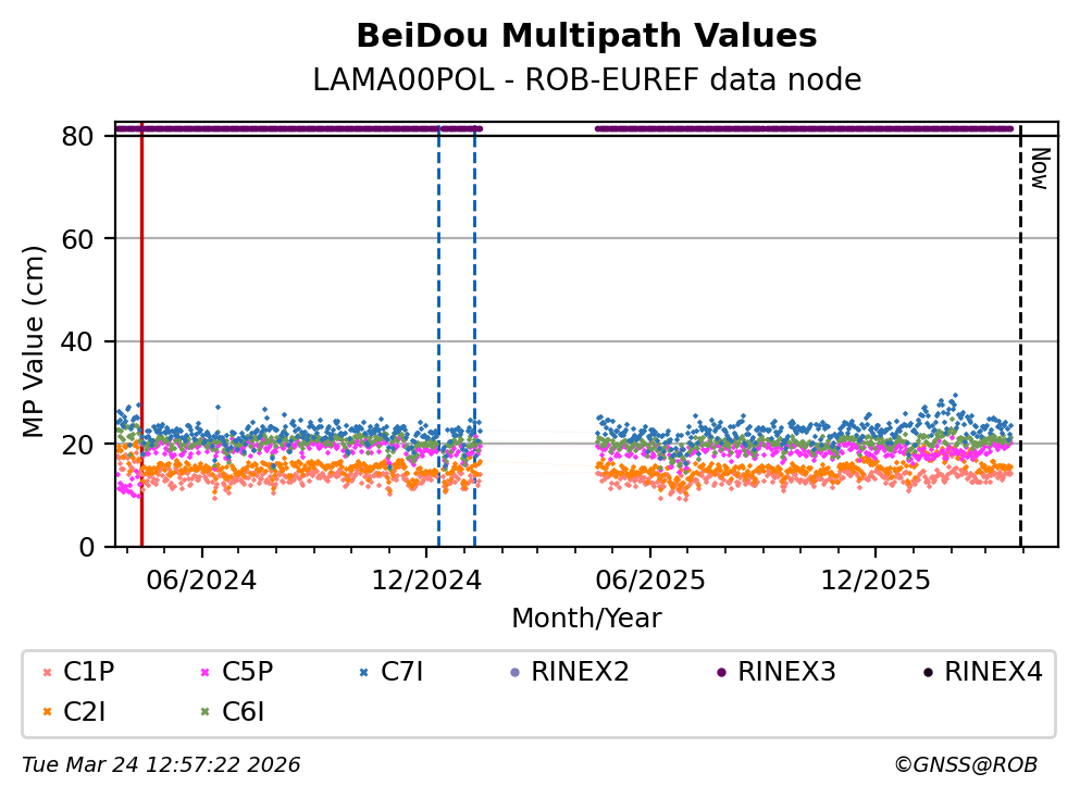 These plots display the daily mean of code multipath per frequency band and satellite constellation. Code multipath statistics are calculated for all pseudorange codes of all GNSS satellites providing dual-frequency carrier-phase observations. The code multipath characterizes the quality of the observed signal and the site environment.