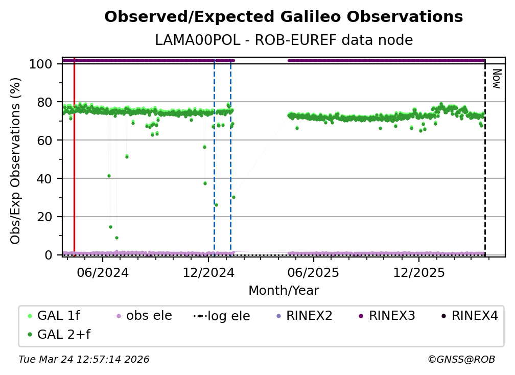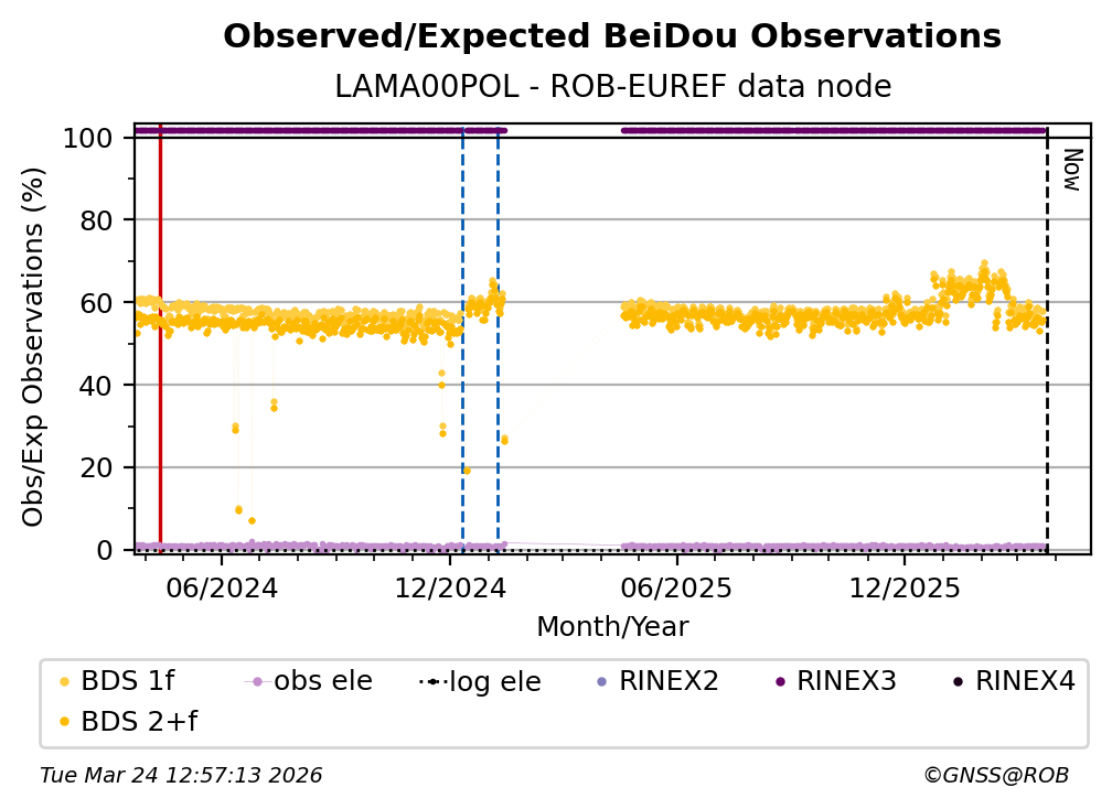 The percentage corresponds, for each constellation tracked by the station, to the ratio of the number of observations in the daily RINEX file with respect to the number of expected observations: