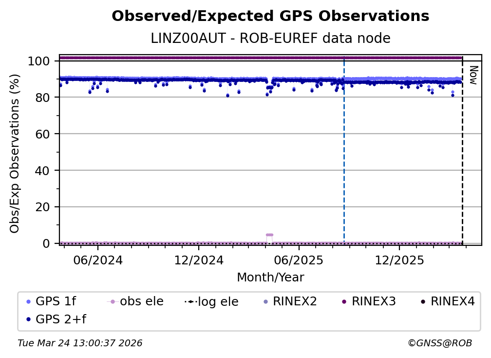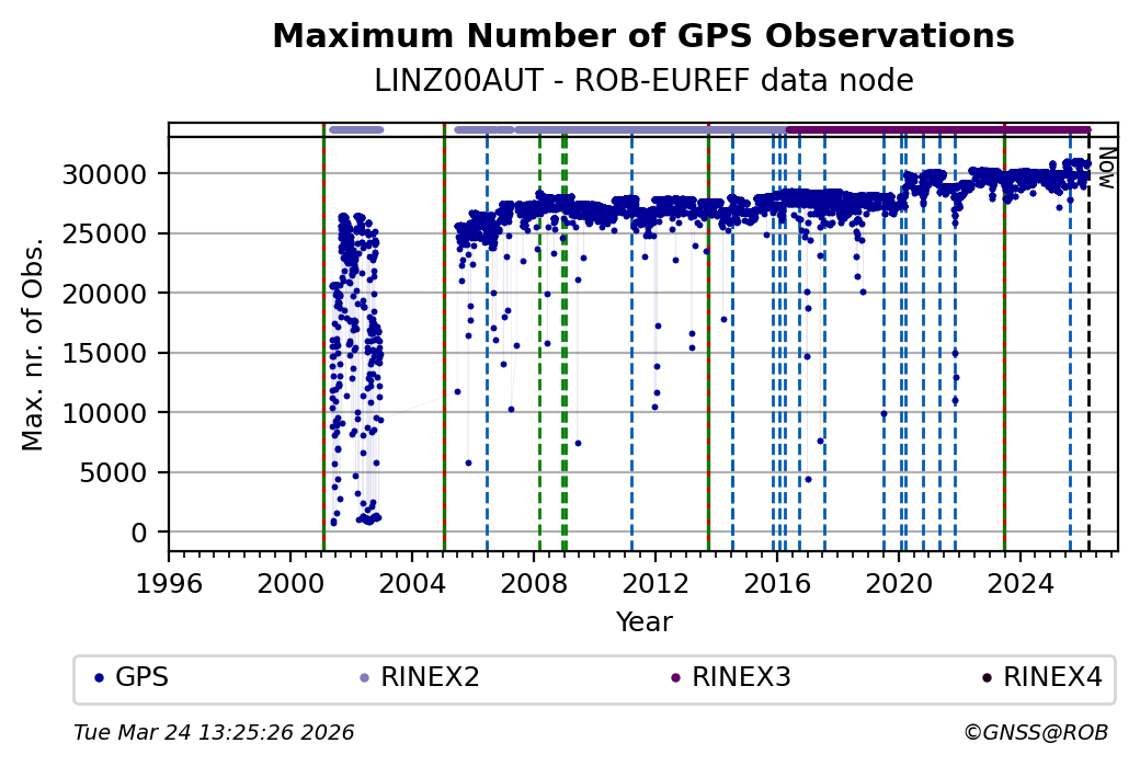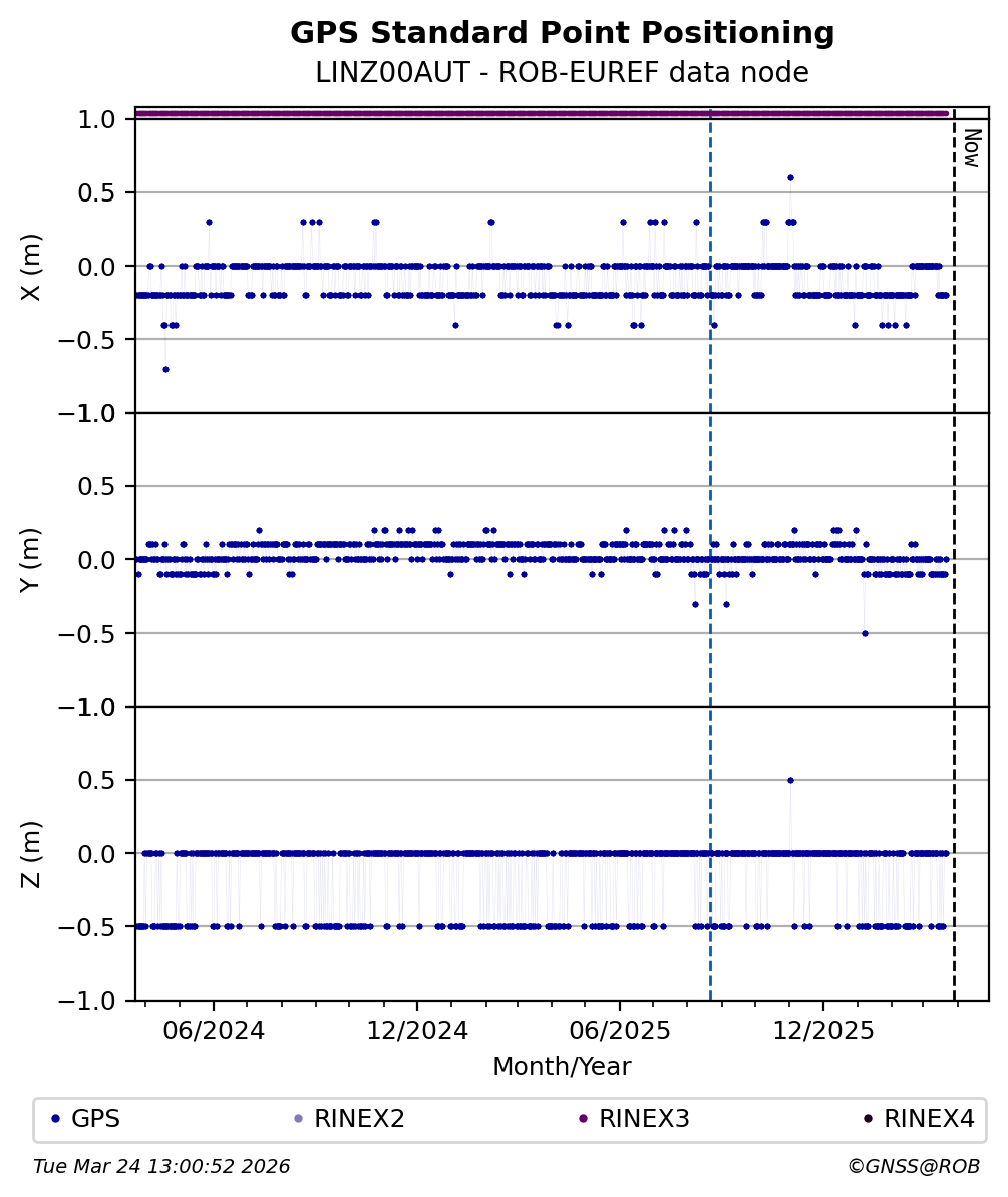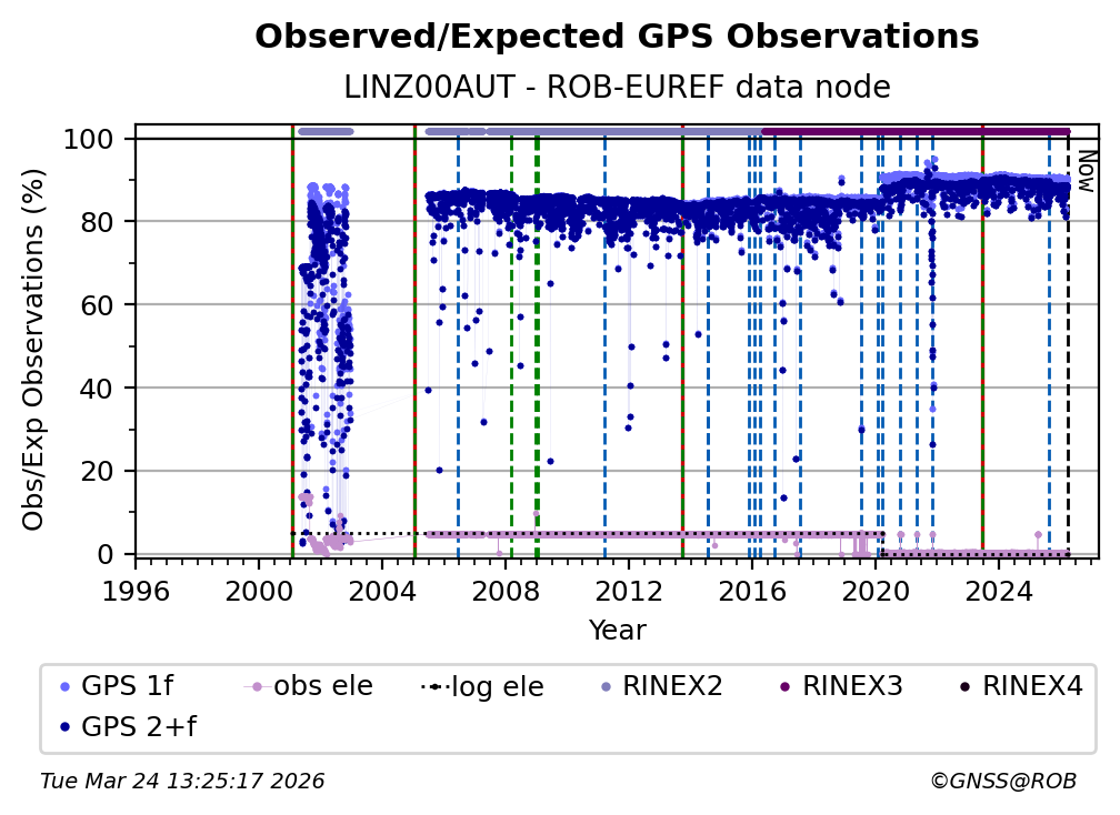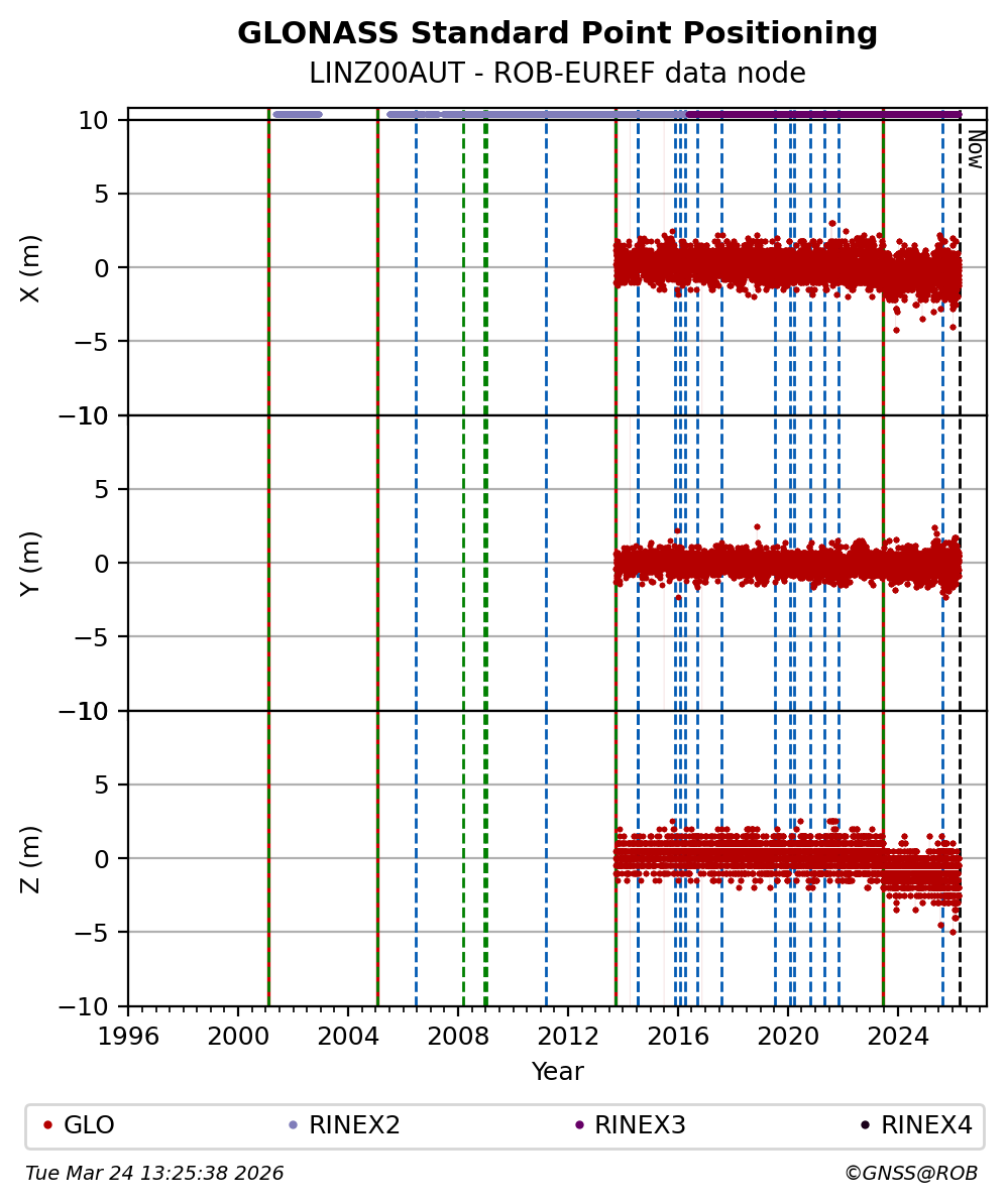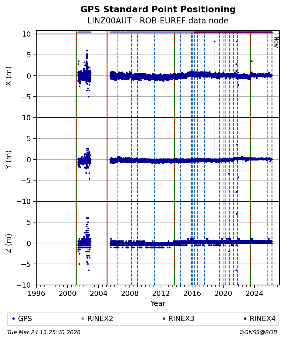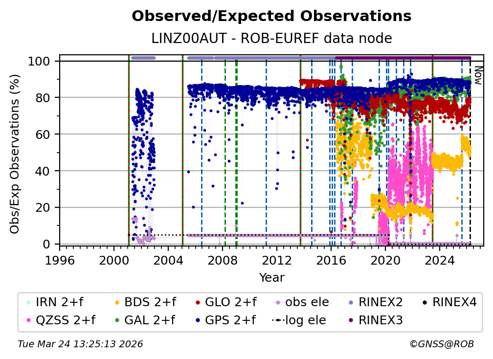 The plots below present the long-term tracking performance of the EPOS-GNSS station LINZ00AUT based on the daily RINEX data available from the ROB-EUREF EPOS-GNSS data node. The data quality metrics have been computed at the data node using the G-Nut/Anubis software.