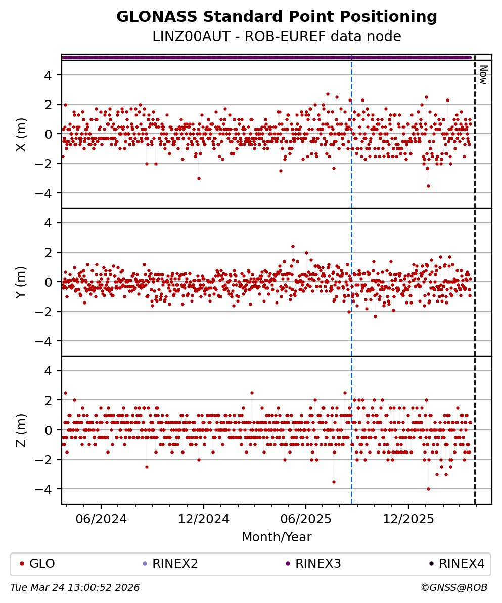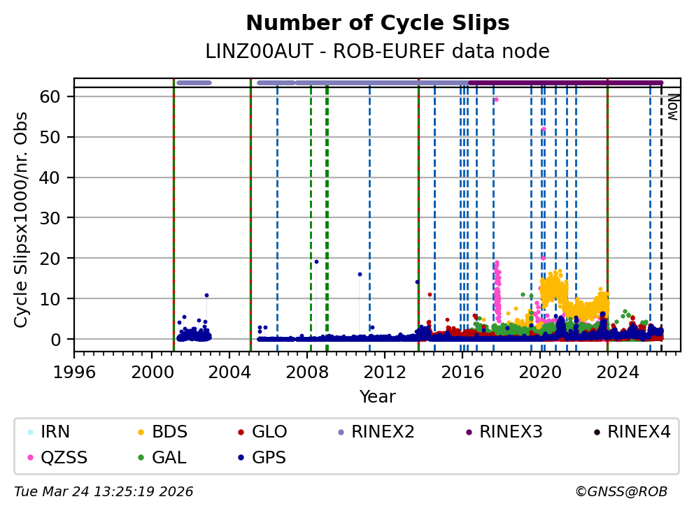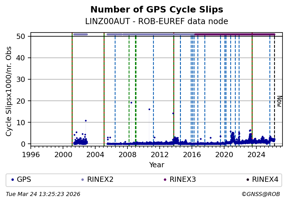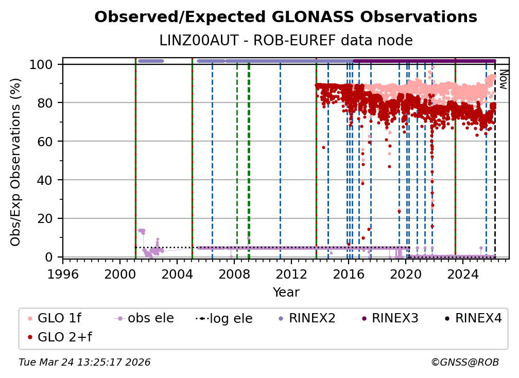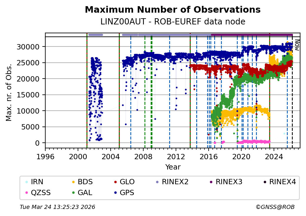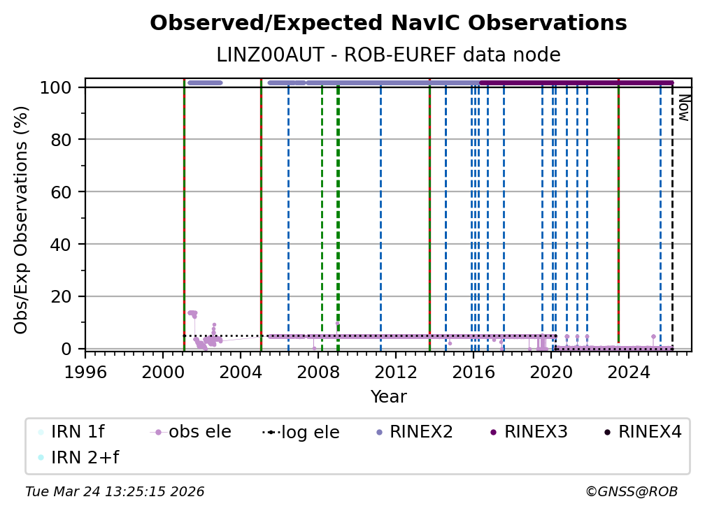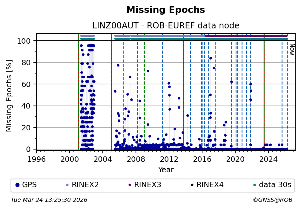 The plots below present the long-term tracking performance of the EPOS-GNSS station LINZ00AUT based on the daily RINEX data available from the ROB-EUREF EPOS-GNSS data node. The data quality metrics have been computed at the data node using the G-Nut/Anubis software.
