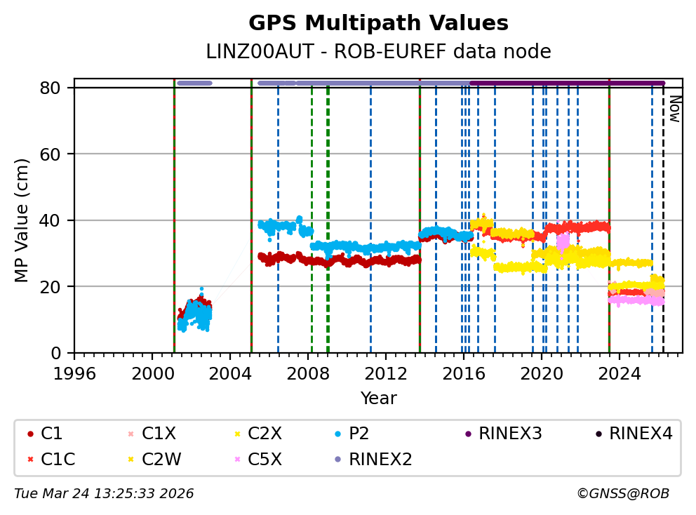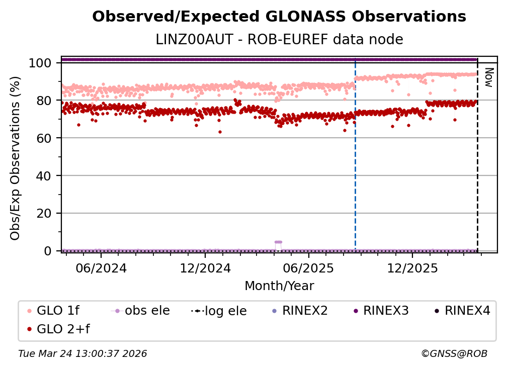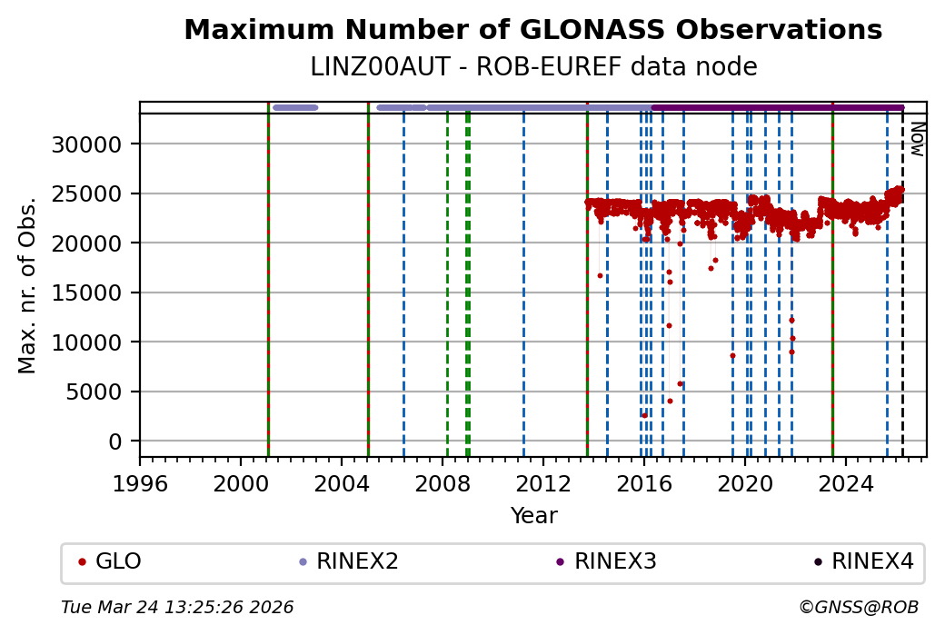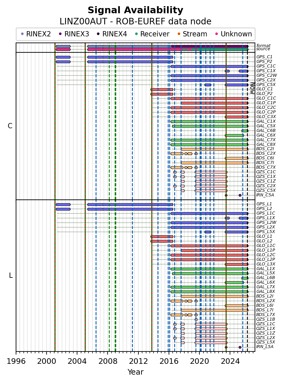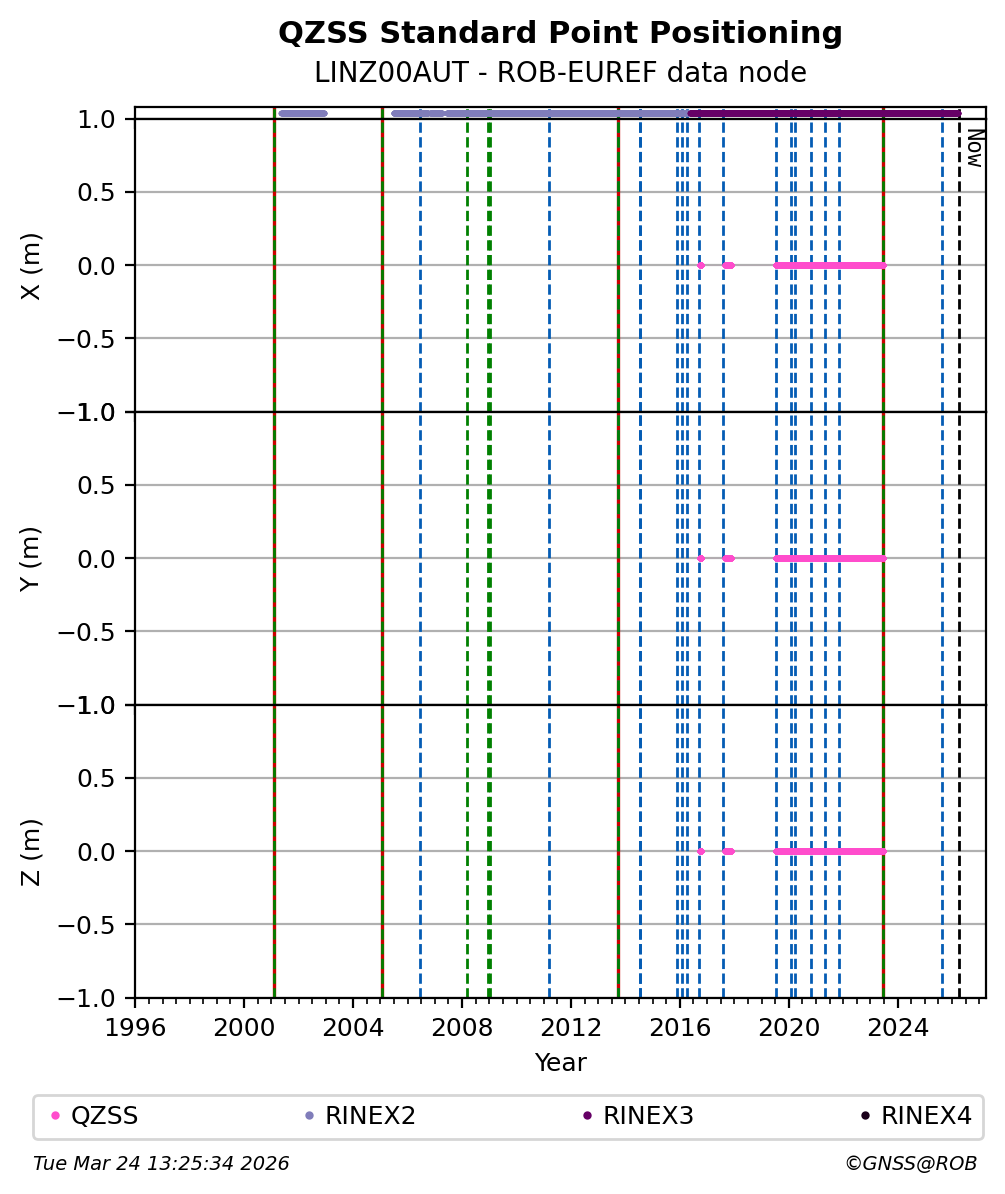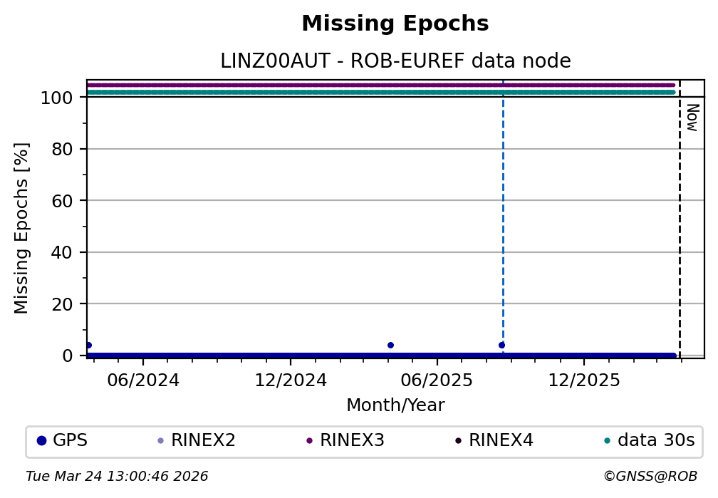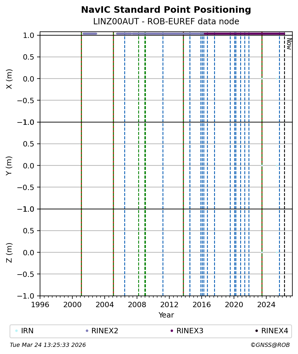 The plots below present the long-term tracking performance of the EPOS-GNSS station LINZ00AUT based on the daily RINEX data available from the ROB-EUREF EPOS-GNSS data node. The data quality metrics have been computed at the data node using the G-Nut/Anubis software.